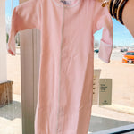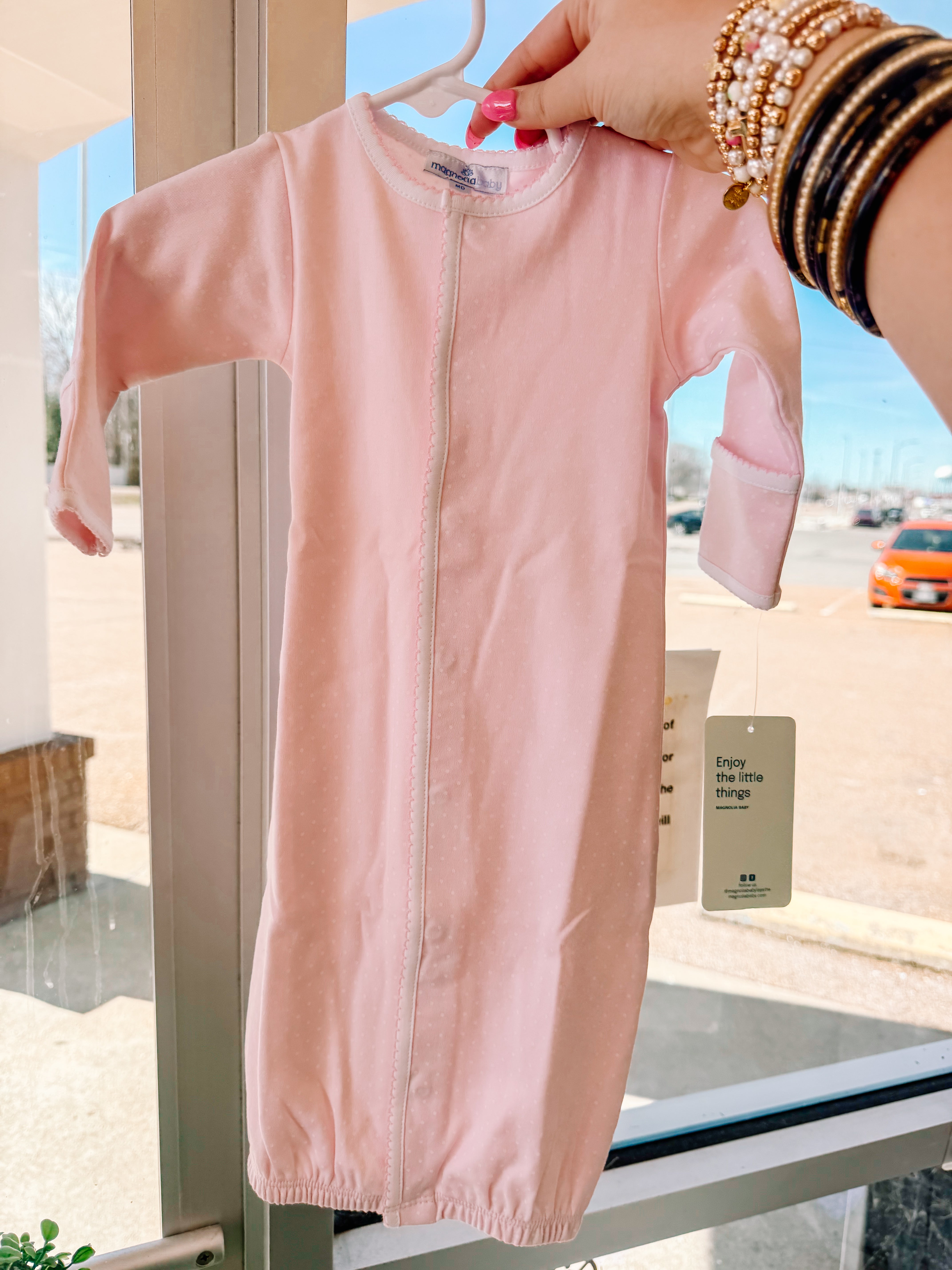 Magnolia Baby's Simply Sweet Converter offers versatile styling in a charming light pink with white dot pattern. This innovative piece transitions seamlessly between a traditional gown and a jon jon, providing two distinct looks from a single garment. The convertible design maximizes wardrobe flexibility for growing babies, while the soft color palette complements any nursery aesthetic. Crafted with Magnolia Baby's signature attention to detail, this converter is an essential addition to any infant's collection.