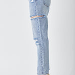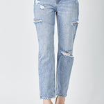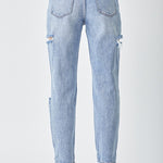Looking for a distressed jean that is great for all days. Our Margret is a high rise distressed ankle barrel jean in a light wash.
