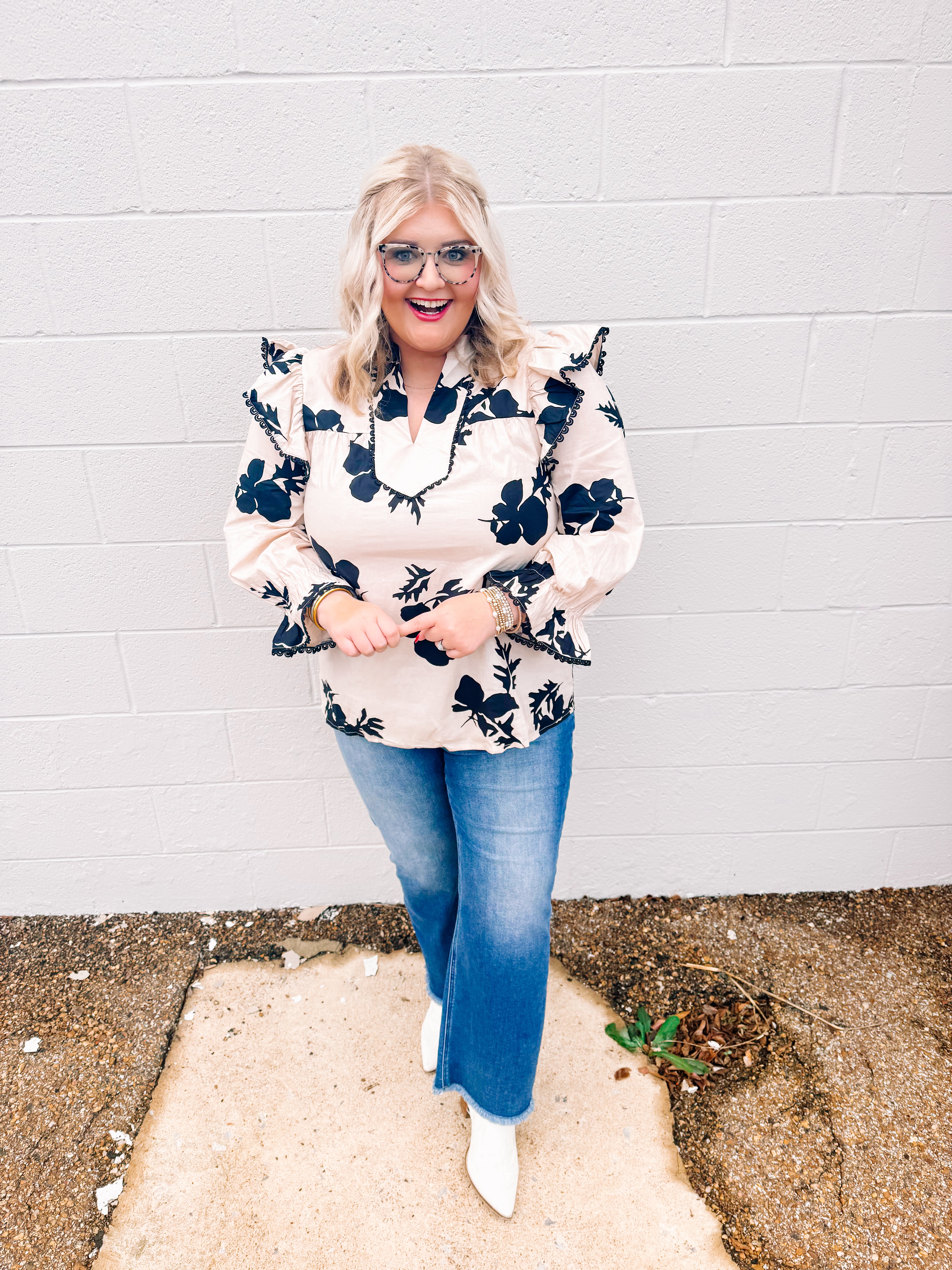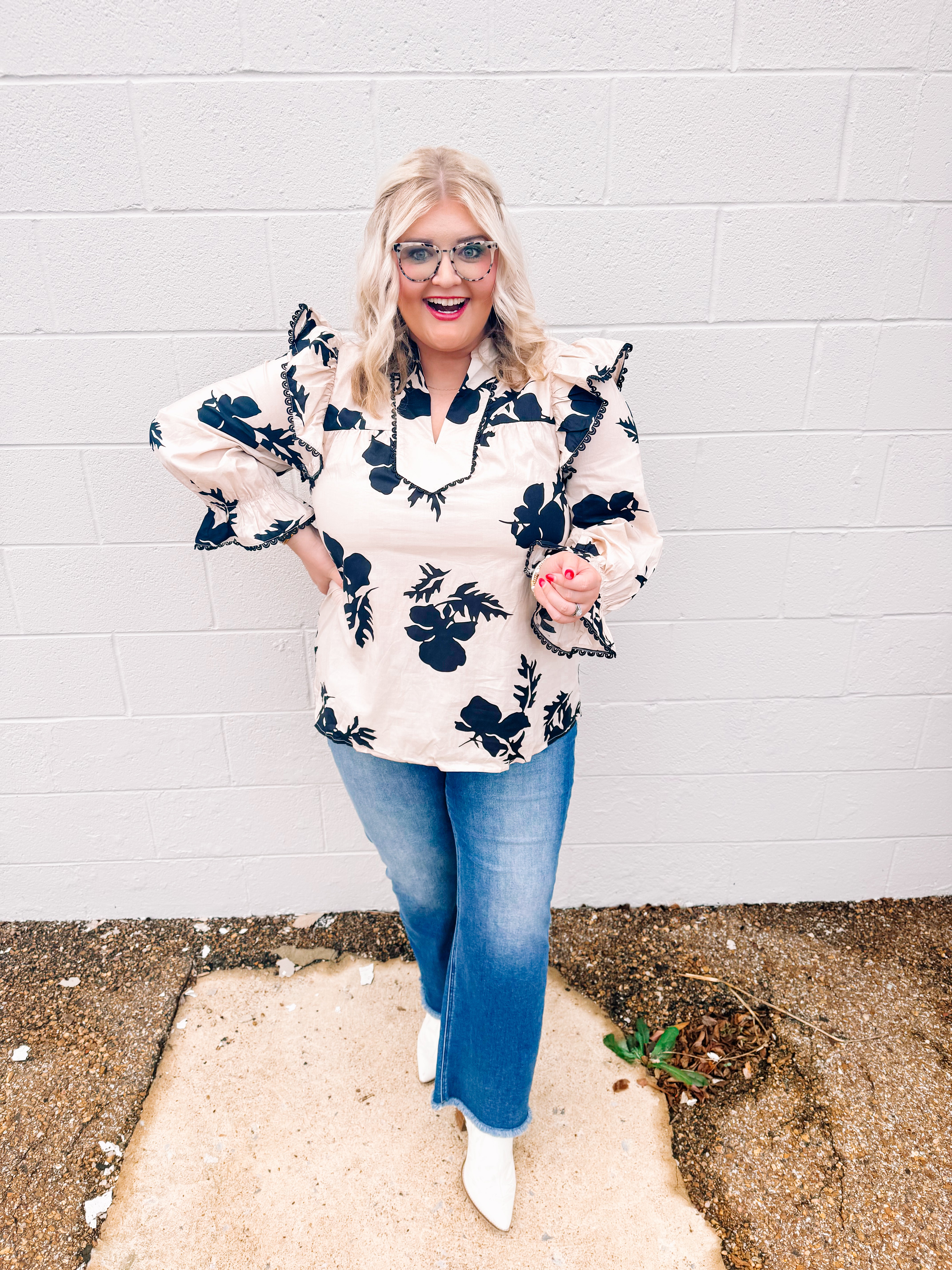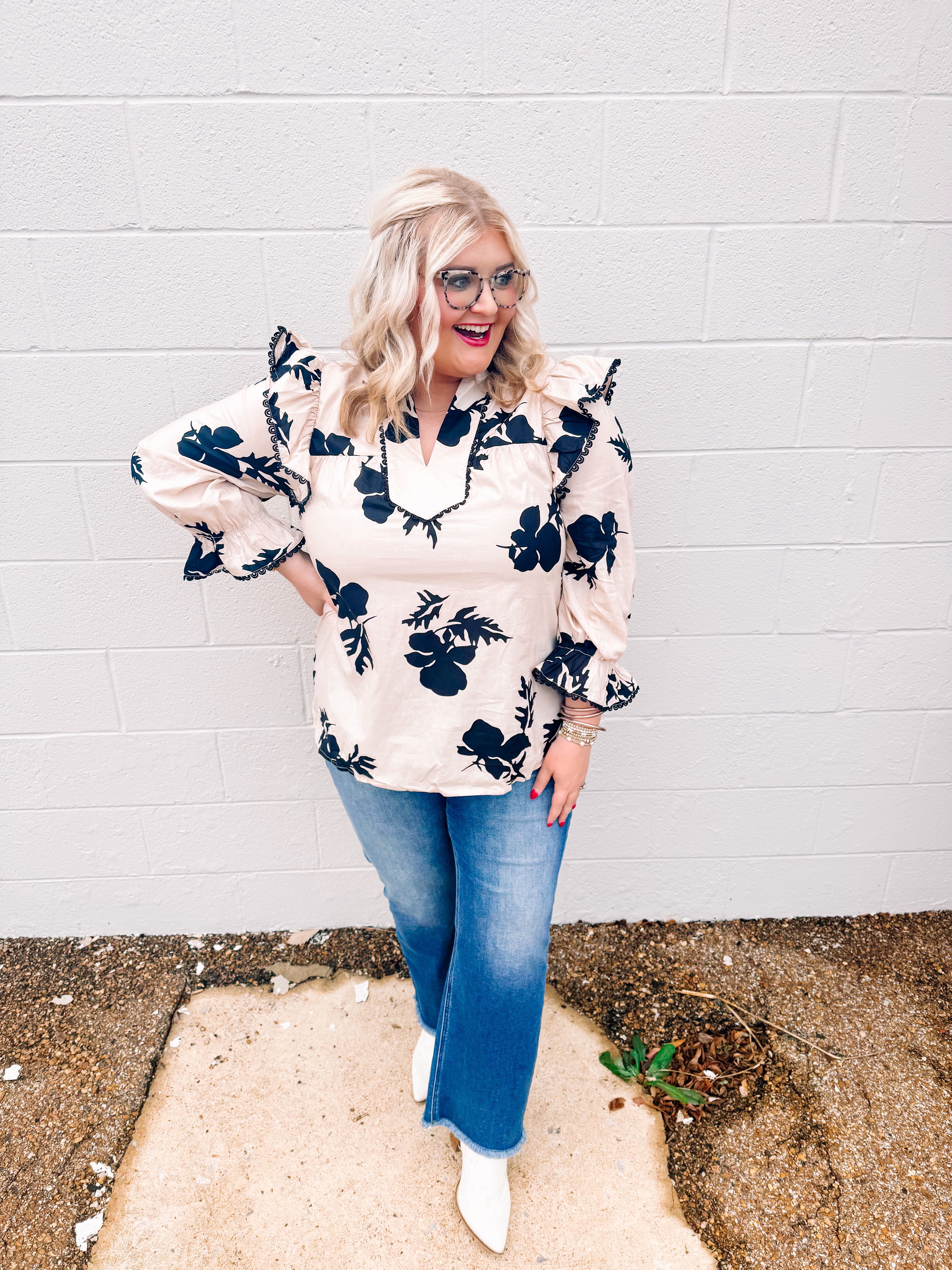 This top is a Madison's Favorite! She has this top and wears it all the time. She loves the feminine look and the flowy style. Our Favorite Floral top features, a Solid textured round neck bubble sleeve top featuring smocking and stitching detail. Button closure at back. Elastic at cuff. Unlined. Woven. Non-sheer. Lightweight.