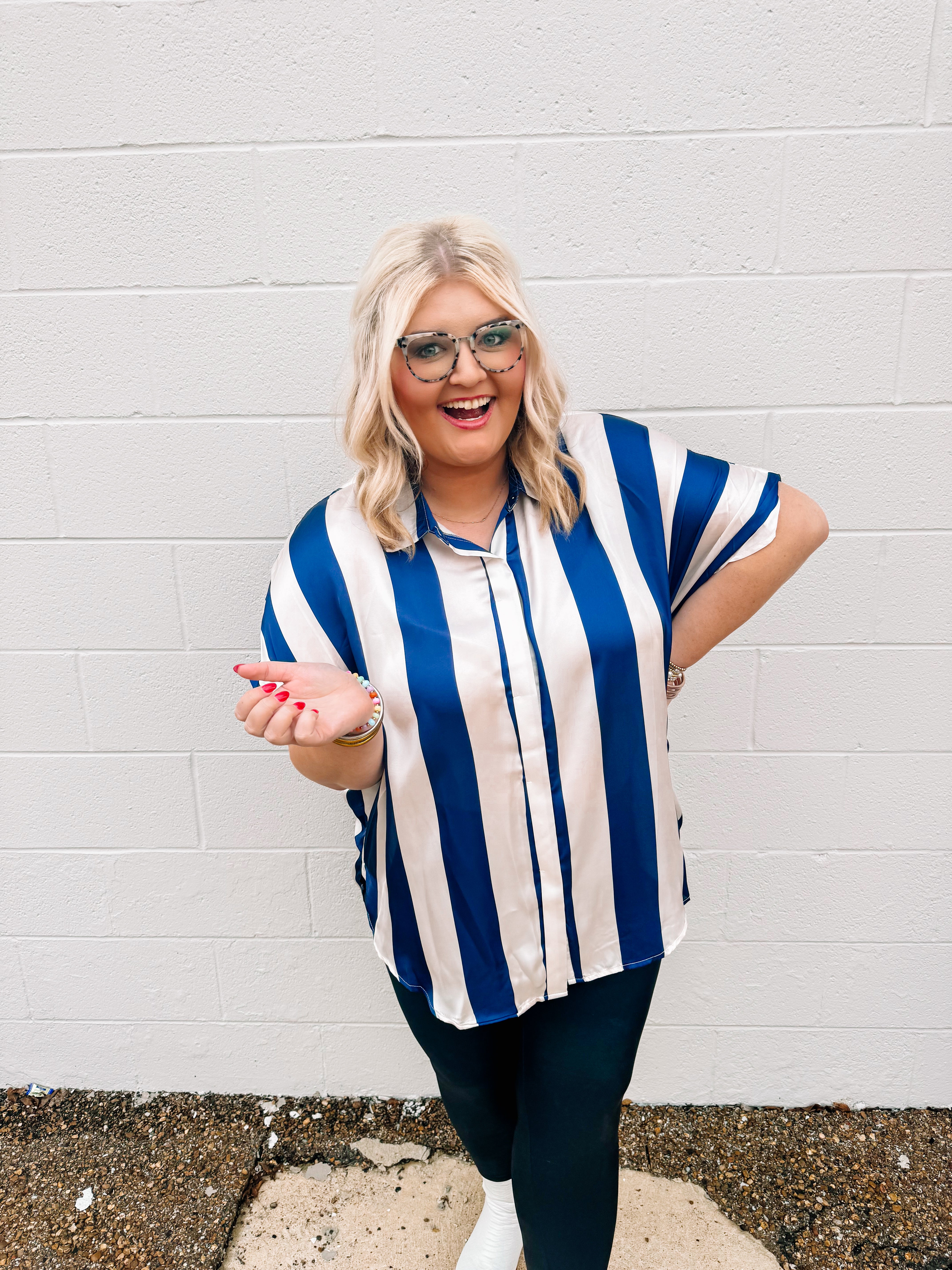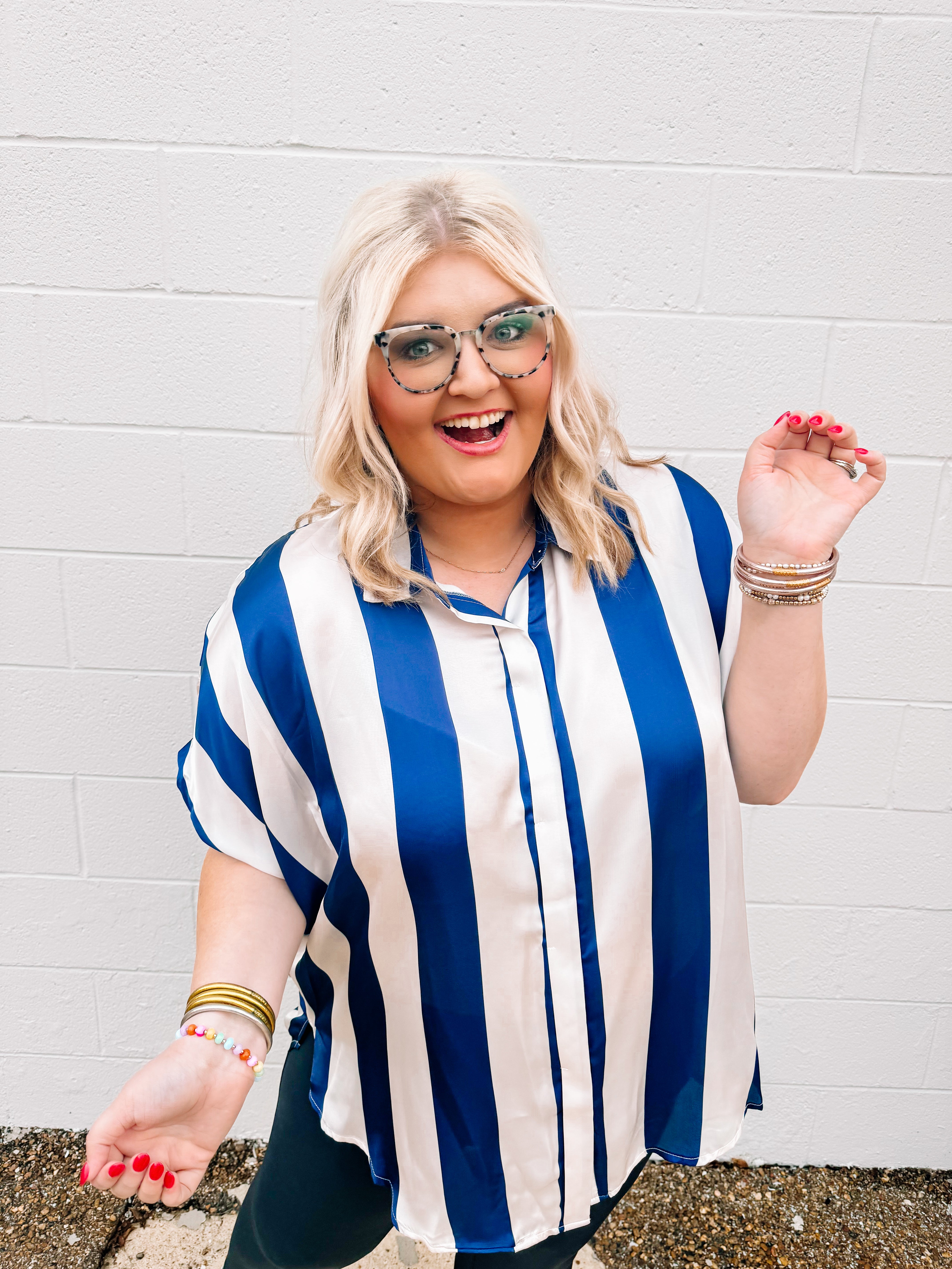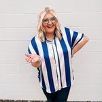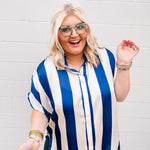 The Navy Nights Top is the shirt everyone is looking for. This dolman-poncho style top features vertical oversized stripes with a slight high-low hem. The navy and white colors are perfect for any season. This is a must have for any closet.