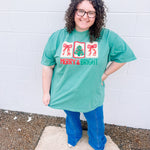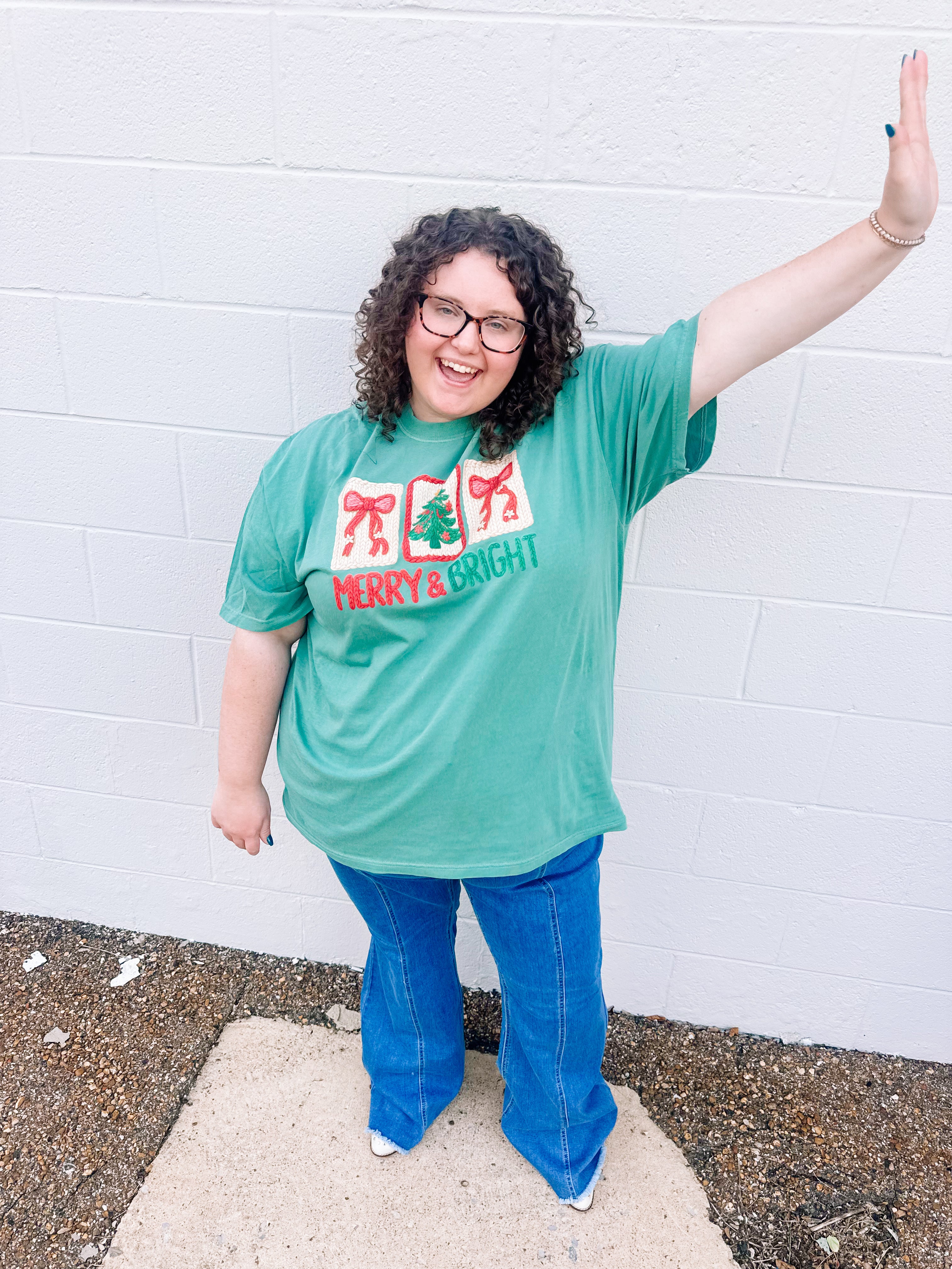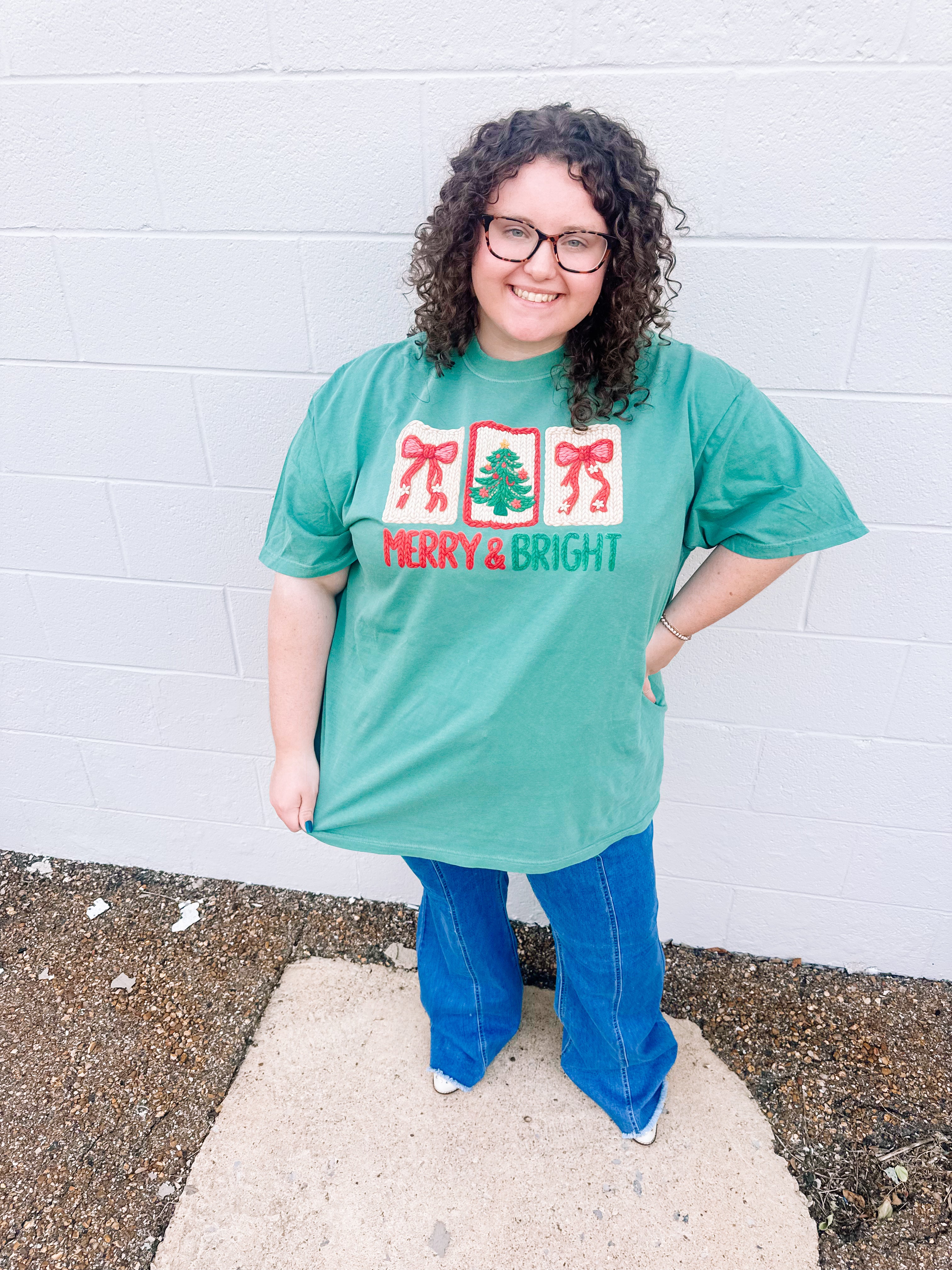 This oversized green comfort tee features a charming needlepoint-inspired design with delicate bows and the festive phrase "Merry and Bright." Crafted for all-day wear, its relaxed fit combines cozy softness with a stylish holiday touch, making it perfect for casual seasonal celebrations.
