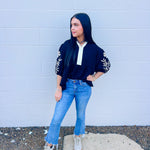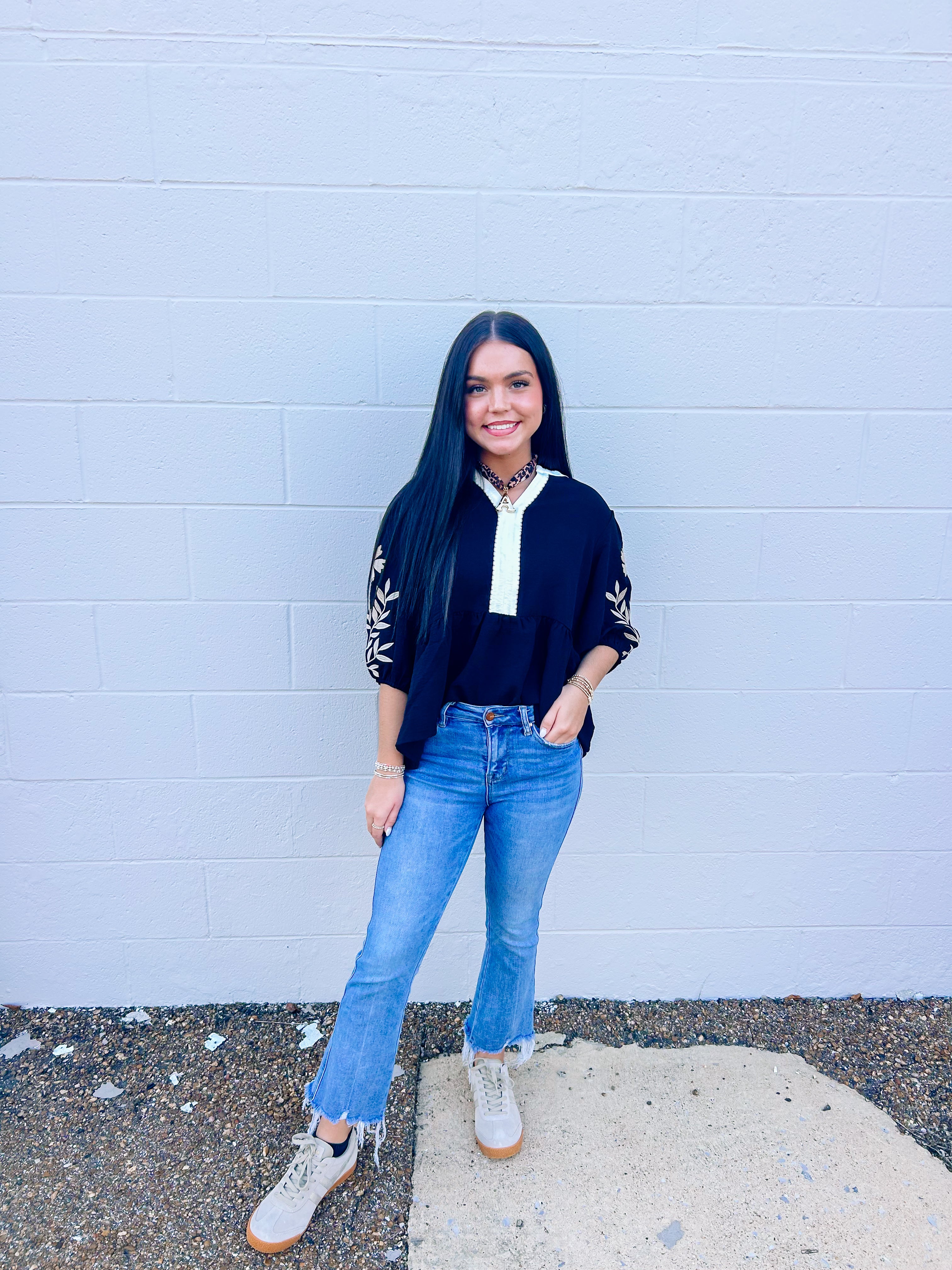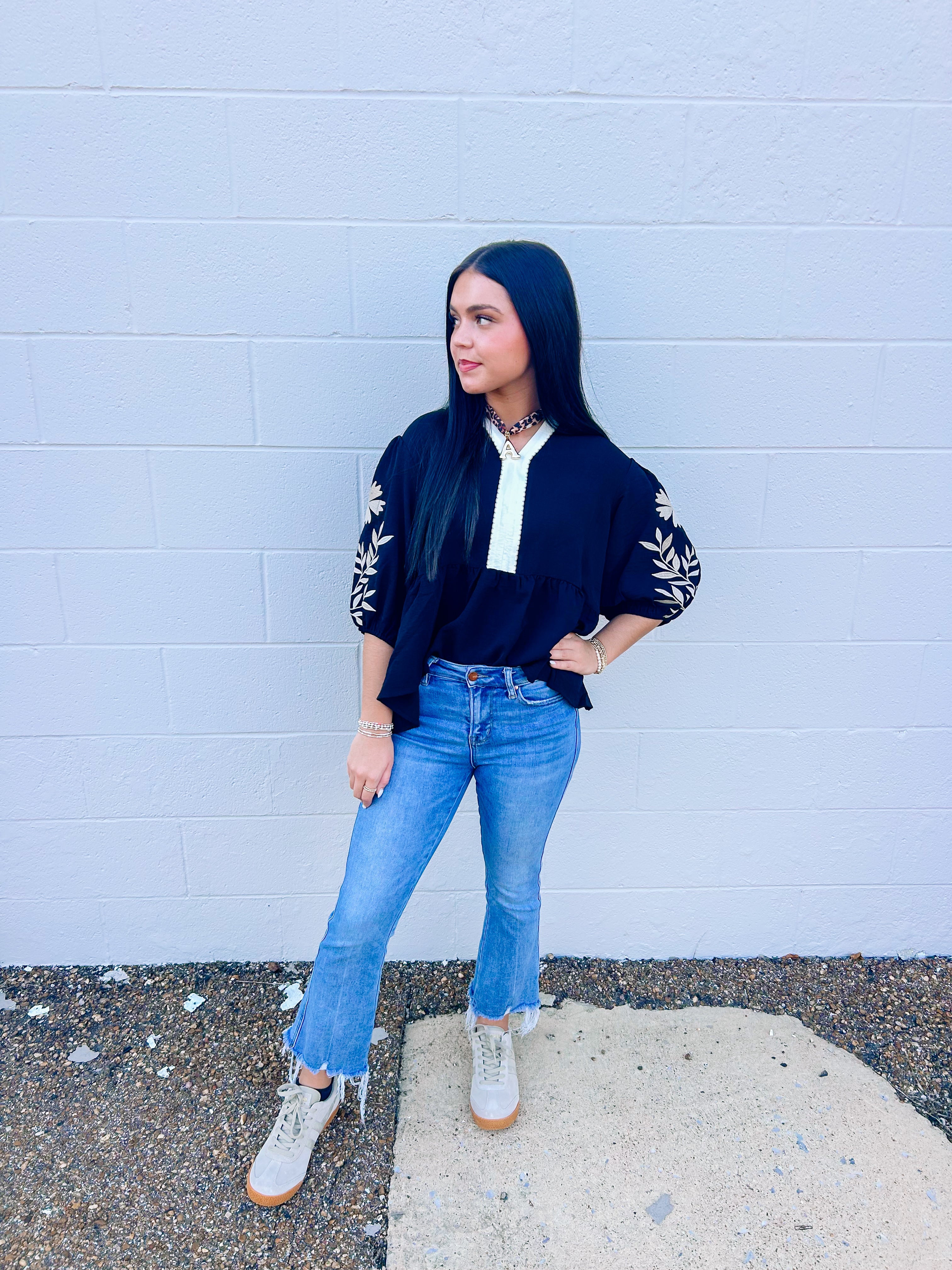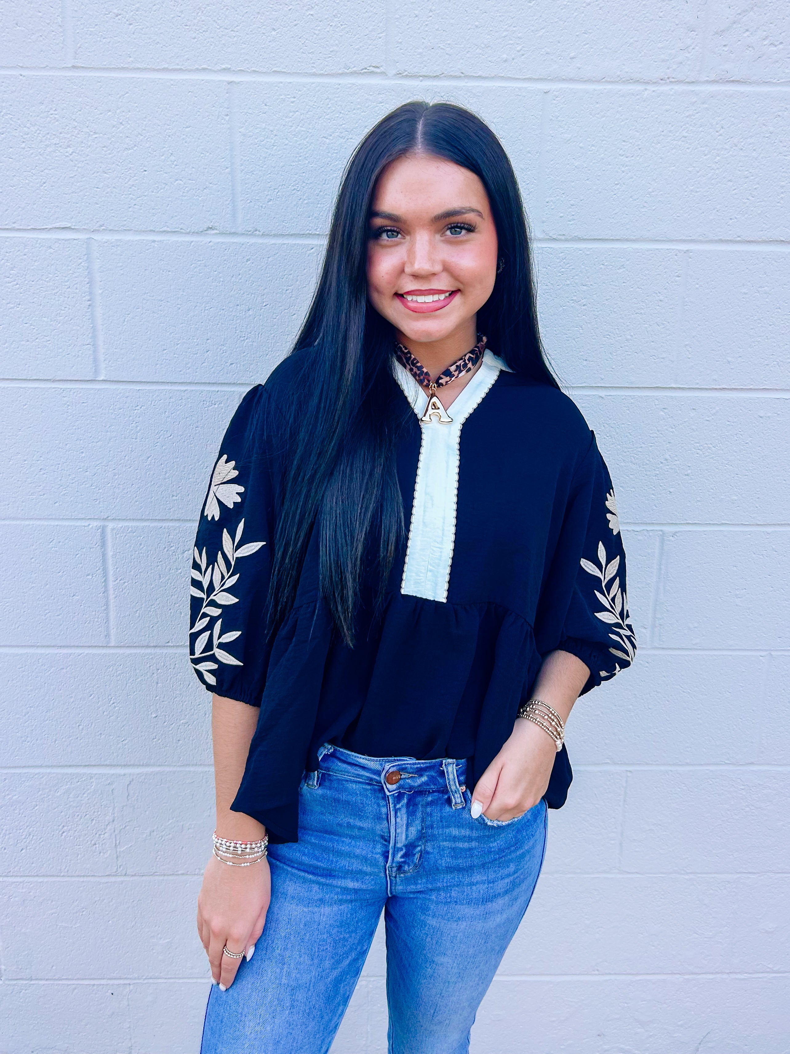 The Oddi Black Peplum Blouse offers a sophisticated blend of style and comfort with its solid airflow fabric that ensures breathability throughout the day. Featuring puffed, embroidered 3/4 sleeves accented with subtle tan and white details, this blouse adds elegant dimension and refined texture to your wardrobe. Its tailored peplum silhouette enhances your natural shape, making it a versatile piece suitable for both professional and social settings.