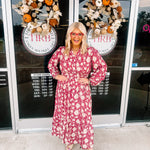 The Oddi Burgundy Floral Maxi Dress combines elegant design with comfortable wearability. Featuring a floral print on rich burgundy fabric, it includes a smocked waist that flatters your silhouette and a tiered hem adding graceful movement. The gathered long sleeves provide a refined finish suitable for various occasions, making this dress a versatile and sophisticated addition to your wardrobe.