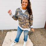 Christmas in June Door Buster! This sweatshirt is only 19.99! It features a camouflage, long sleeve, french terry sweatshirt with a solid contrast and slit vent hem. It is perfect for summer!