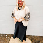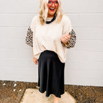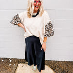 Welcome to the Oddi Dash of Leopard Top. This beige textured knit top with leopard printed bubble sleeves is perfect for the working woman. This is a great top for work or for a night on the town