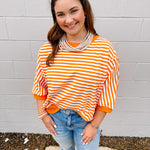 This top is great for those girls that love their sports. This orange and white striped knit top with seam detail is perfect for those Vols loving girls or any other team that is orange and white.