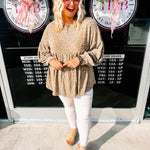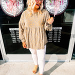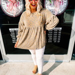 Christmas in June! This Top is only 19.99! This top features a brushed leopard, long sleeve, hacci knit babydoll top. This top is great for summer.