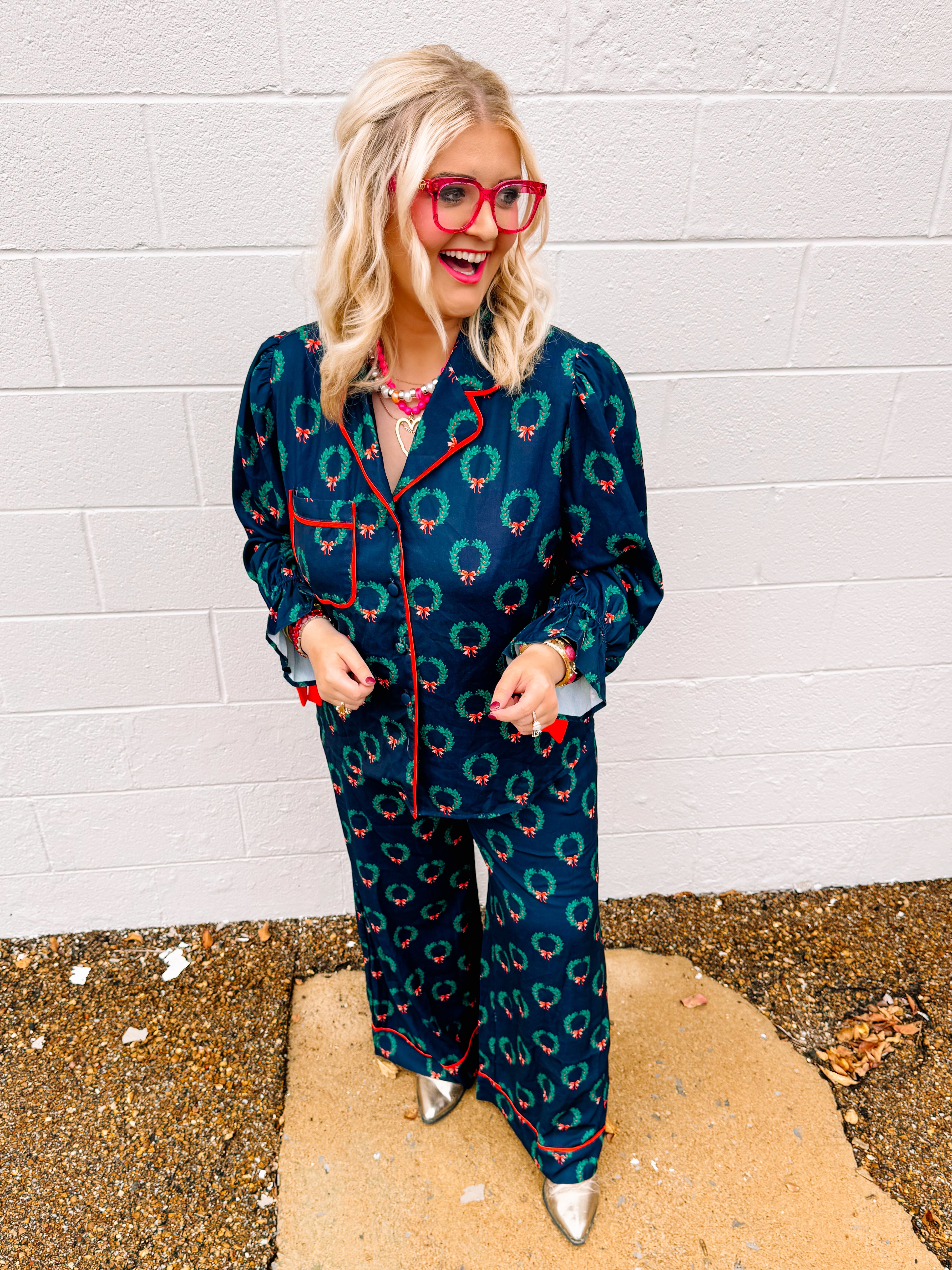 Expertly crafted by Oddi, the Navy/Red Christmas Wreath PJ Pant set is the perfect blend of comfort and style. The navy color with festive red piping and Christmas wreath design is perfect for the holiday season. With excellent buttons and phenomenal hardware, this set is both durable and fashionable. The roomy fit of the shirt adds an extra level of comfort to this must-have pajama set.