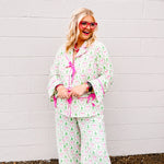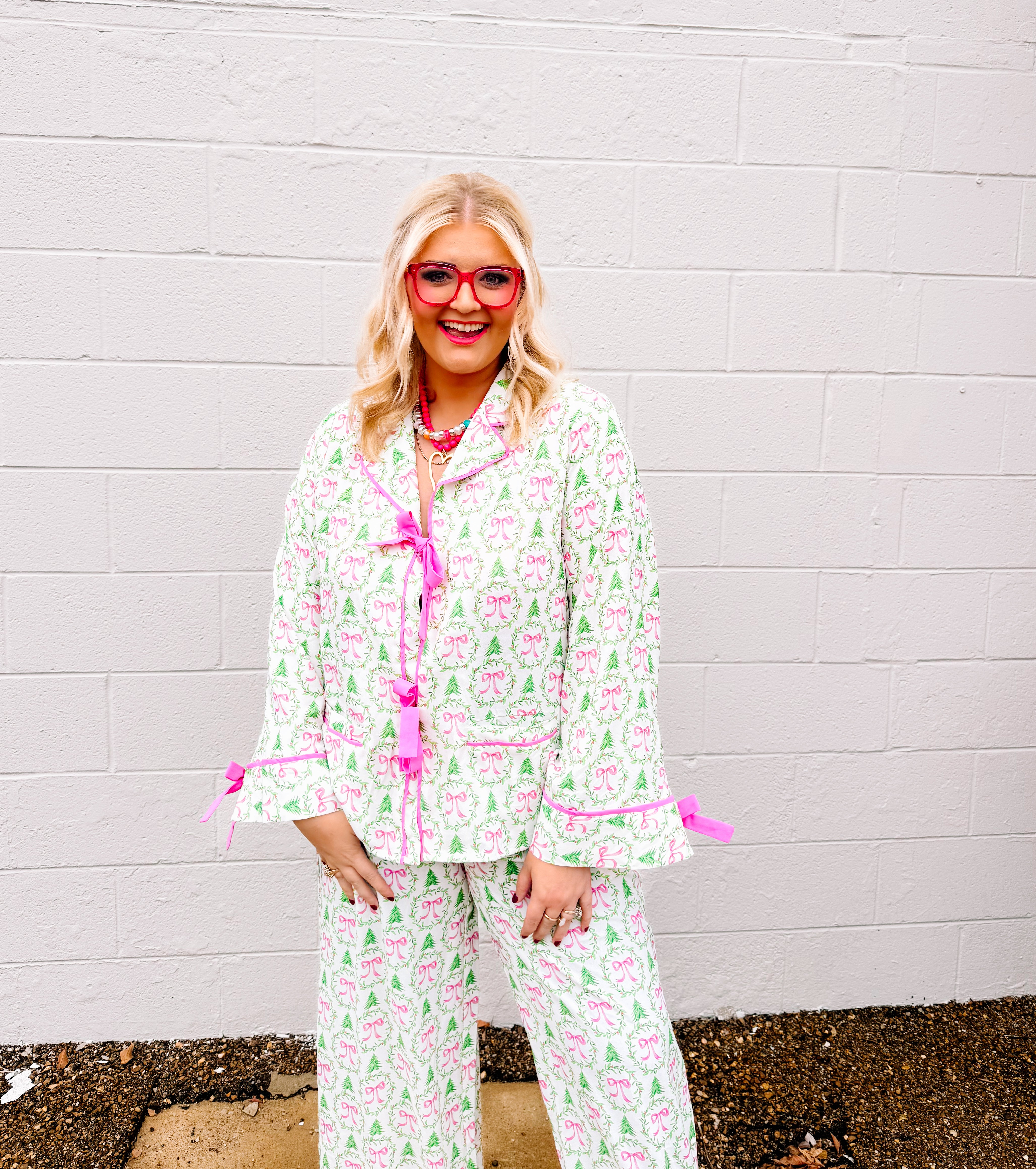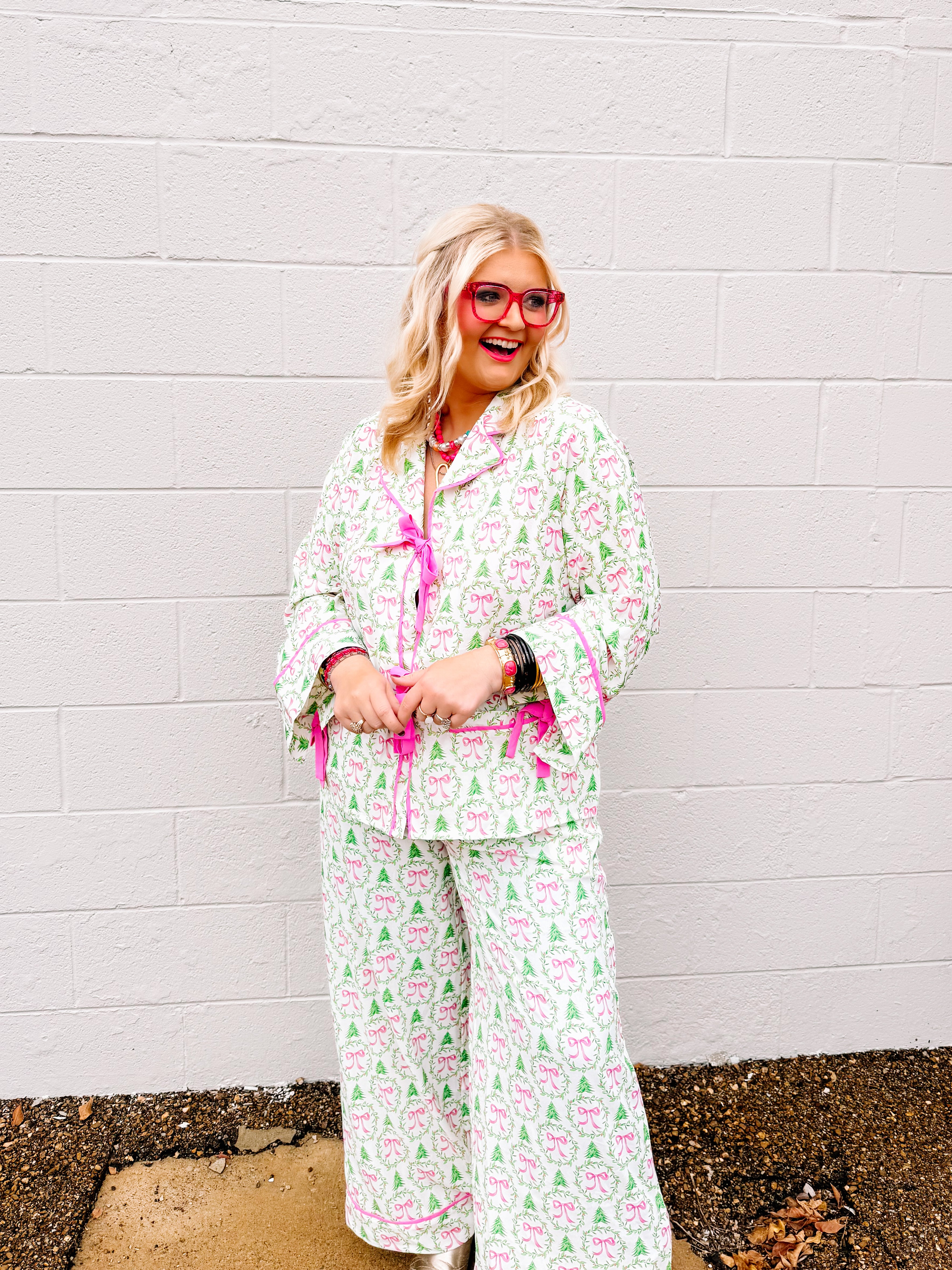 "Experience the ultimate comfort and style with our best brand, Oddi Pink/White Bow Time PJ Top. Featuring charming pink bows and green wreaths, this set stands out with its actual pink bow detailing. Designed to run roomy, it offers both a comfortable fit and a touch of playful elegance. Elevate your sleepwear with Oddi."