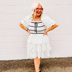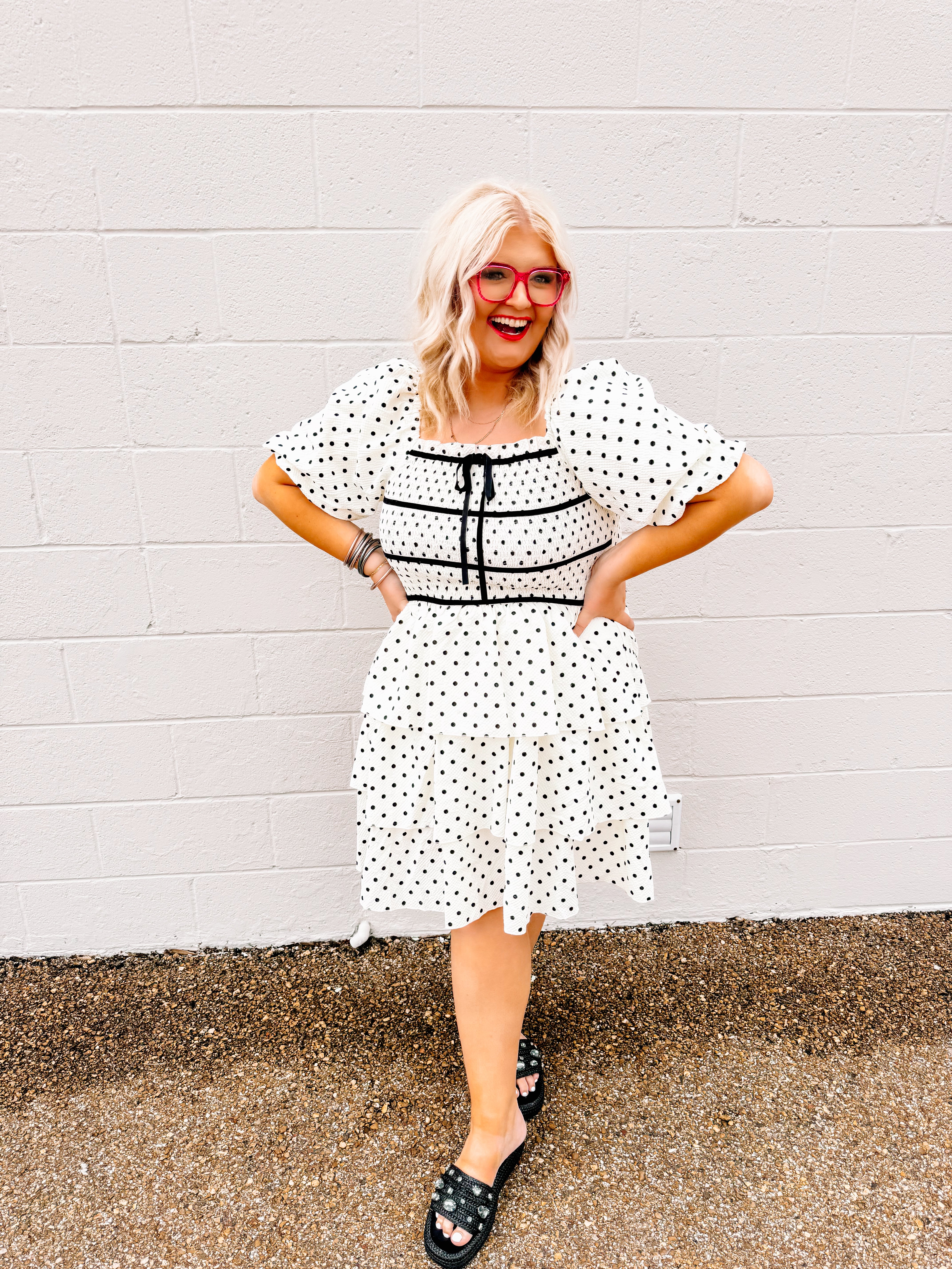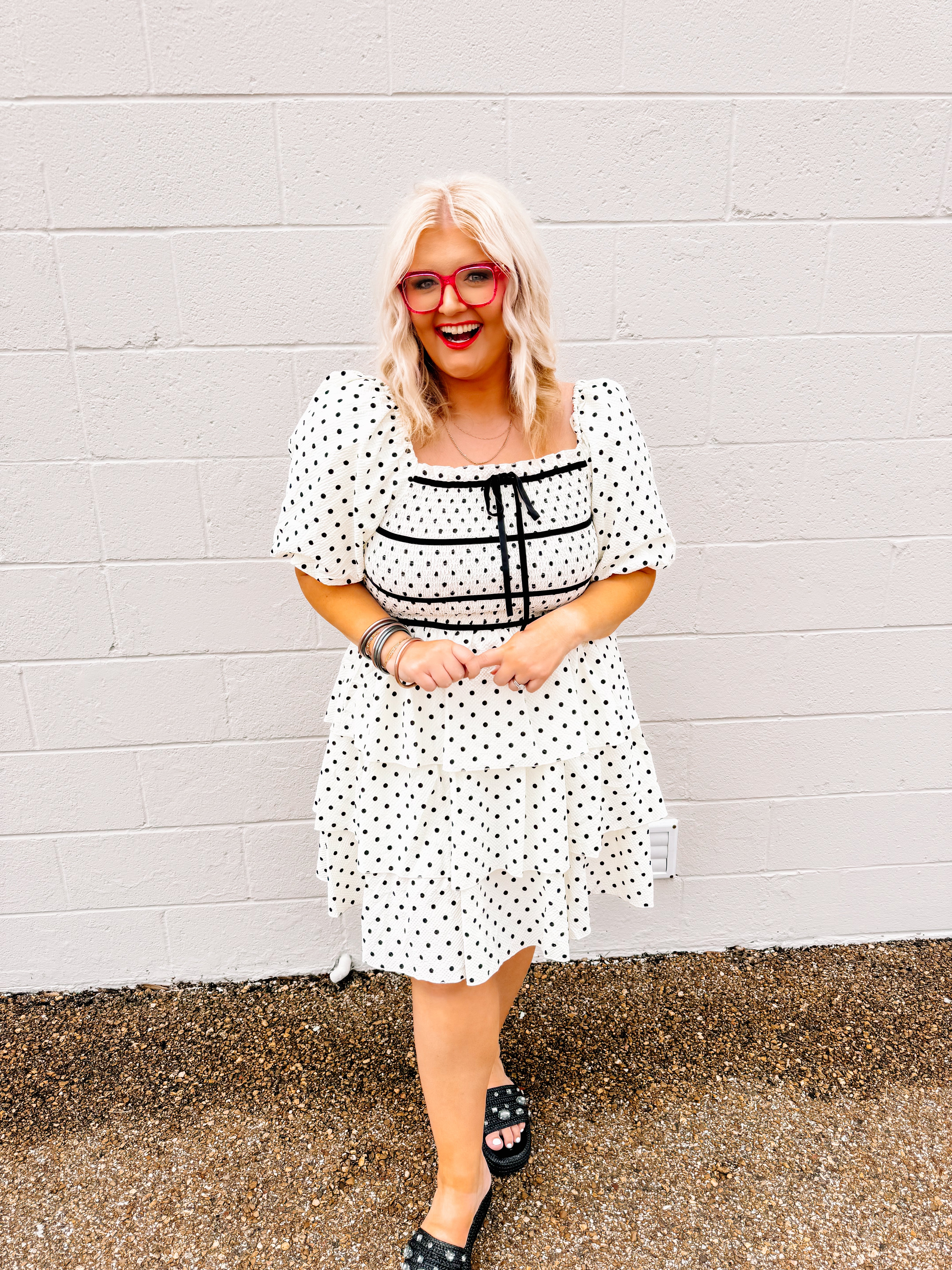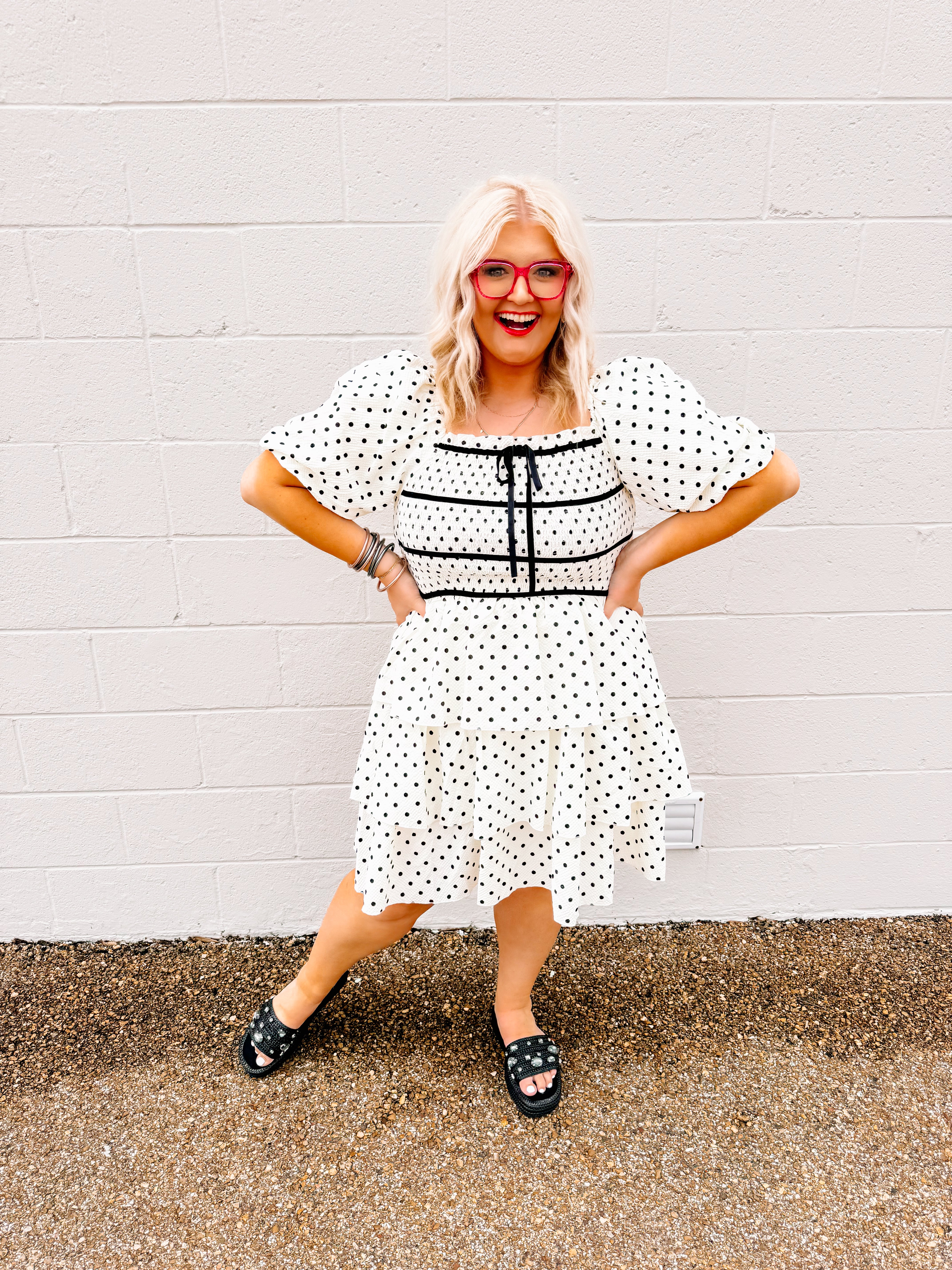 Oddi is back at it again with this cute babydoll dress! It is a polkadot mini tired dress with bubble sleeve and a bow/tie at the neckline. This dress is a must for the summer.