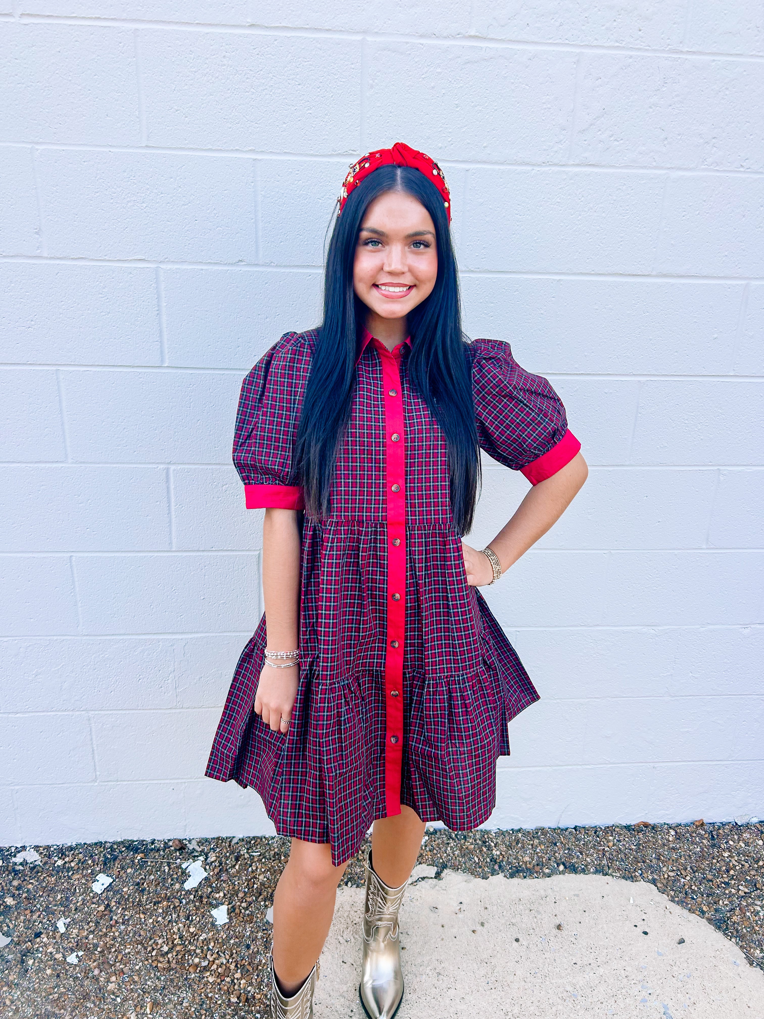 The Oddi Red Plaid Babydoll Dress features a classic checked plaid pattern with a button-down front for easy wear. Its contrasting collar and puff sleeves add refined detailing, while the tiered skirt creates a flattering, flowing silhouette. Perfectly balancing timeless style with modern comfort, this dress offers versatile appeal for both casual and semi-formal occasions.