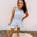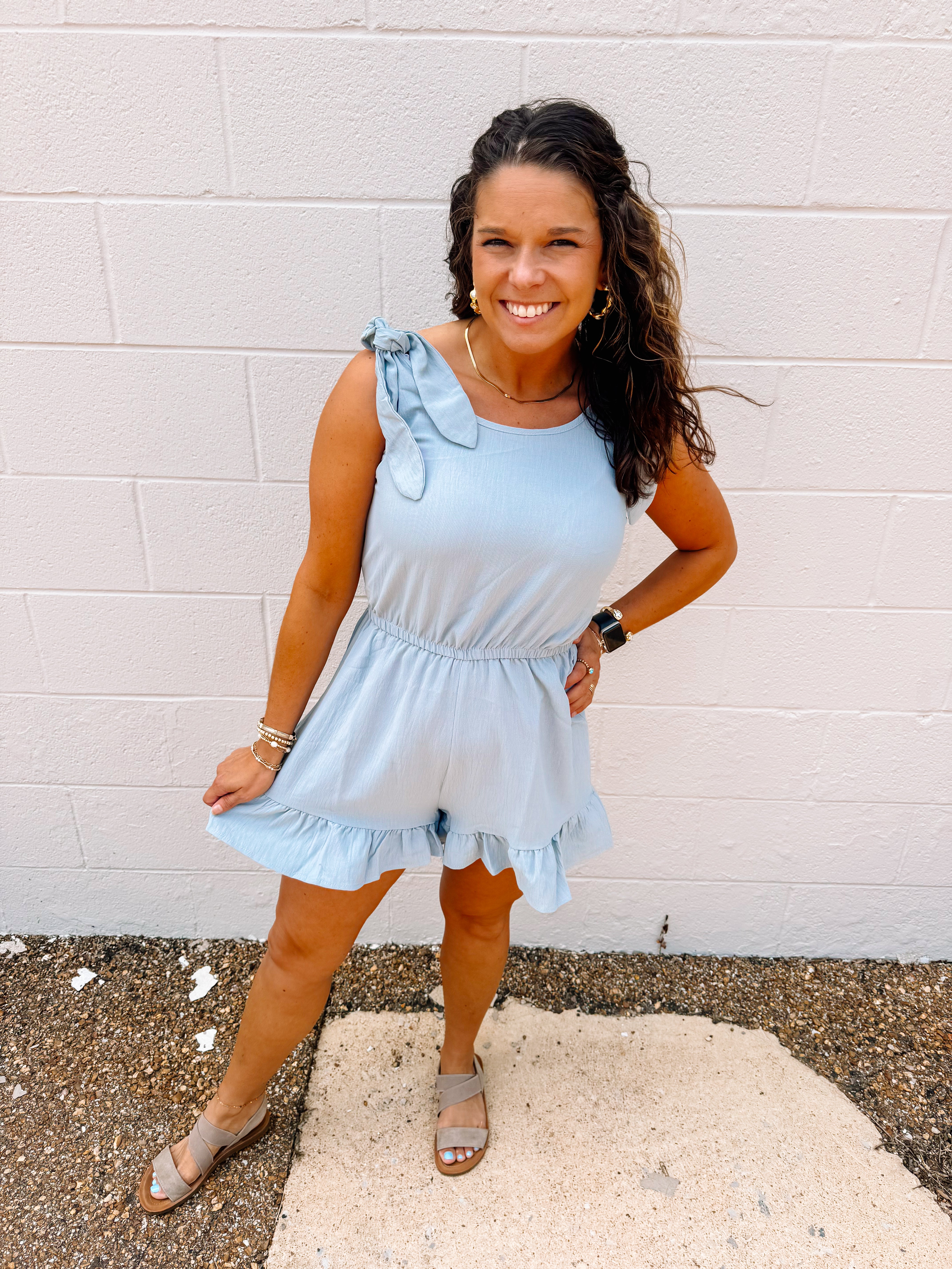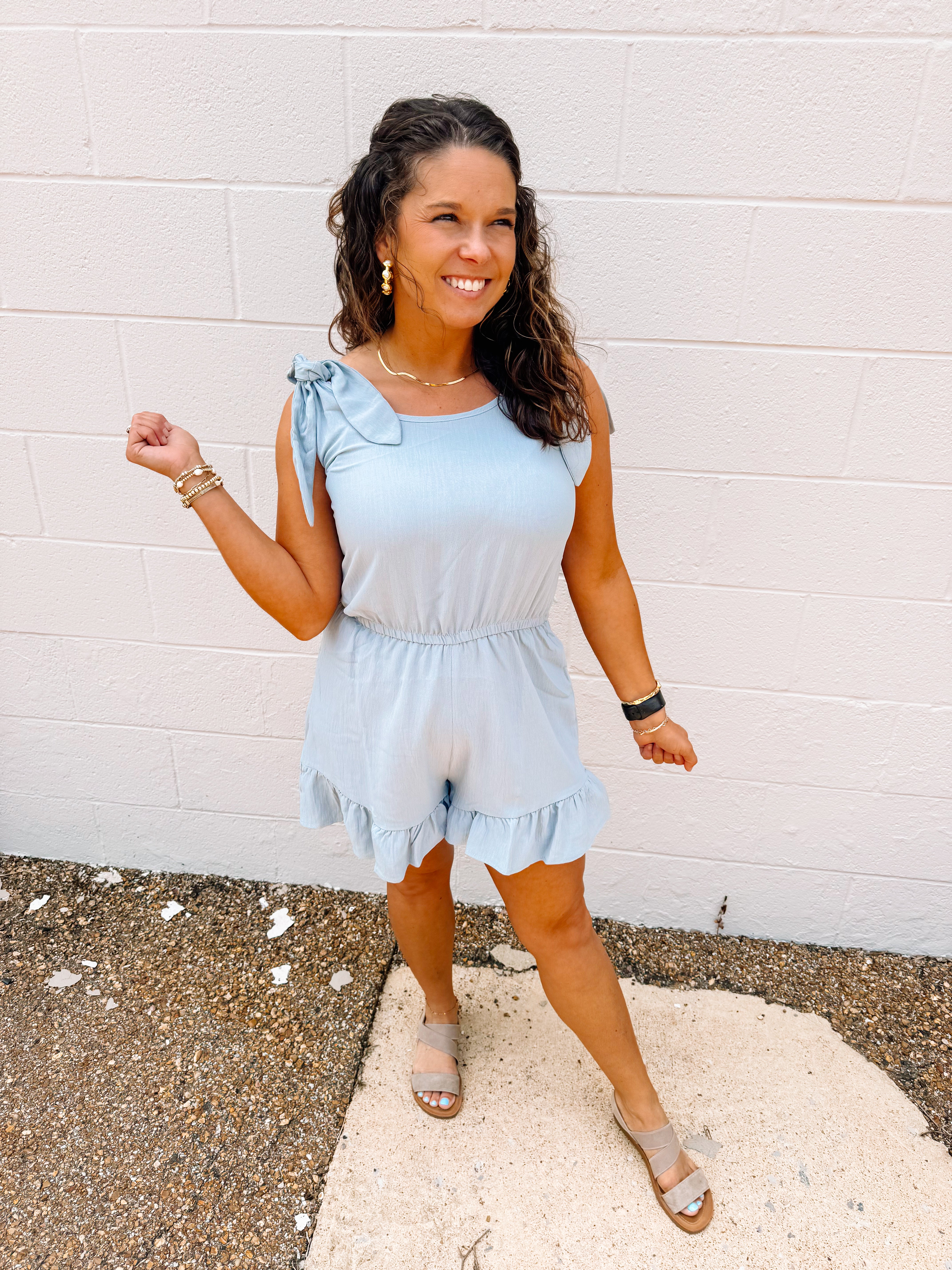 Christmas in June Door Buster! This romper is only 19.99! She come in 2 colors blue bell and citrus! Great for the summer months.