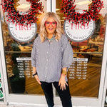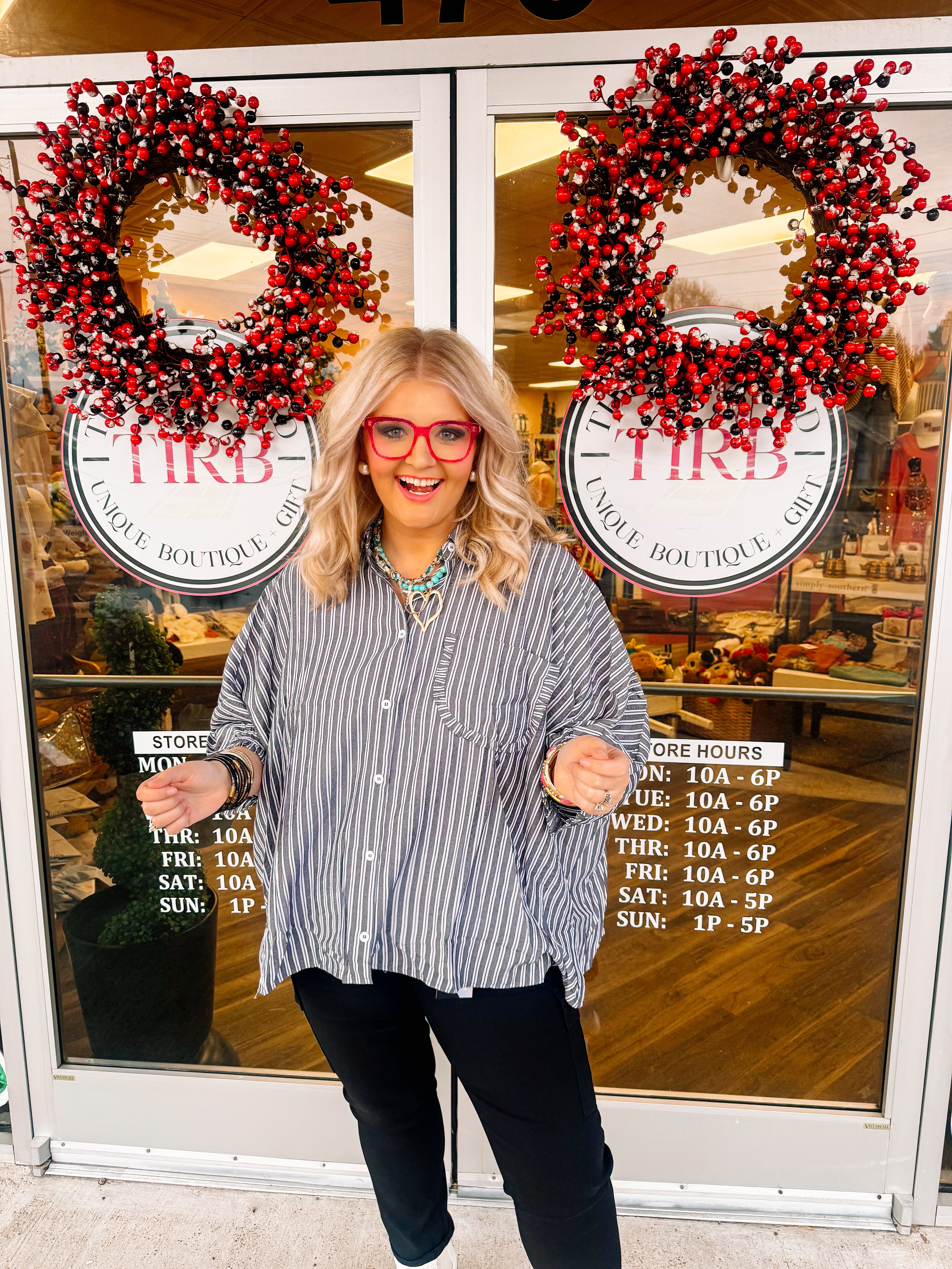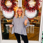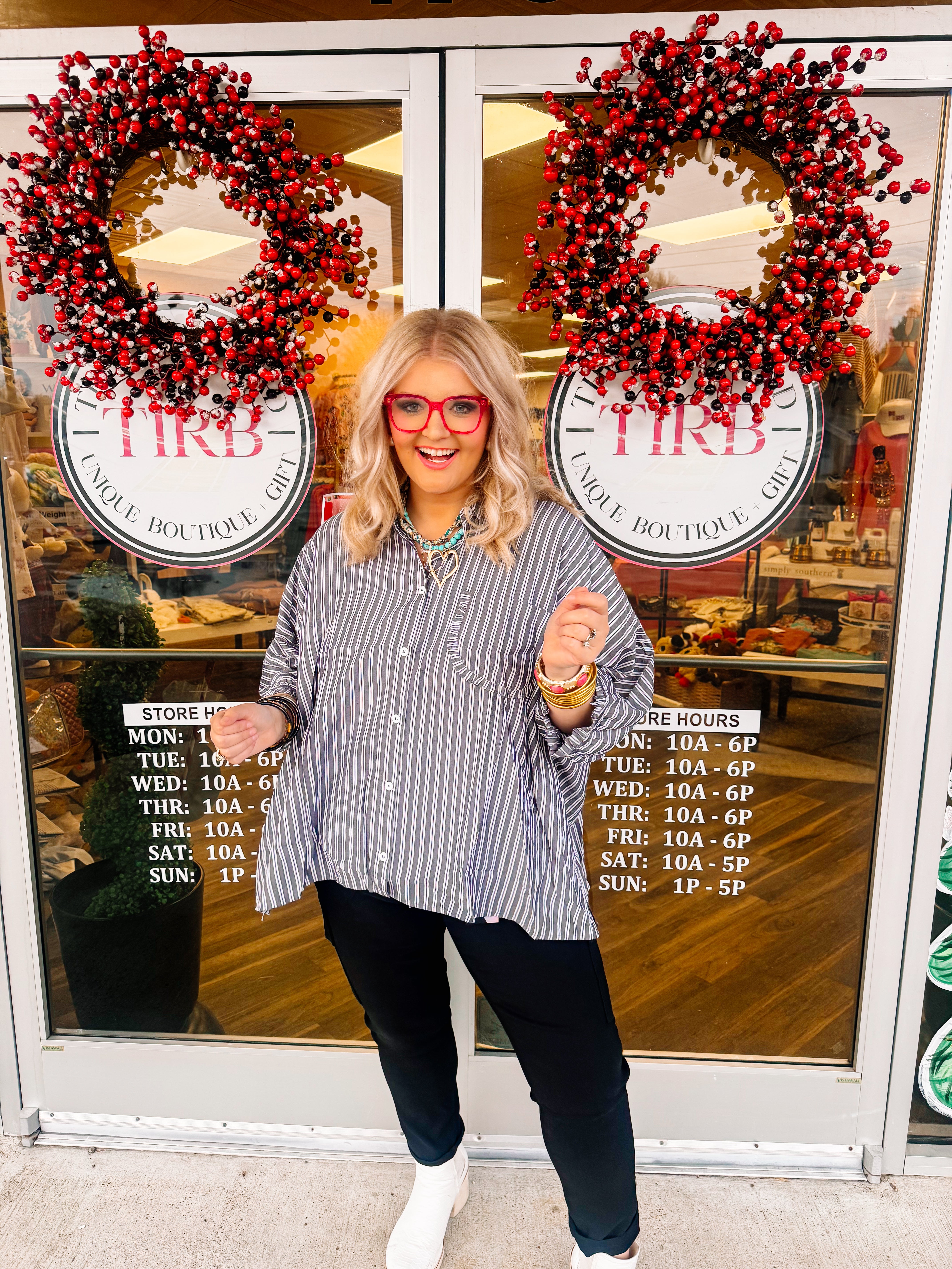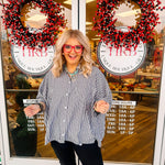 The Oddi Striped Button Down delivers effortless sophistication with its classic black stripe pattern and relaxed oversized silhouette. Featuring three-quarter length sleeves and a traditional button-down front, this versatile piece transitions seamlessly from casual weekends to polished office settings. The generous fit provides comfortable layering options while maintaining a refined aesthetic. Perfect for those who appreciate timeless design with contemporary ease.