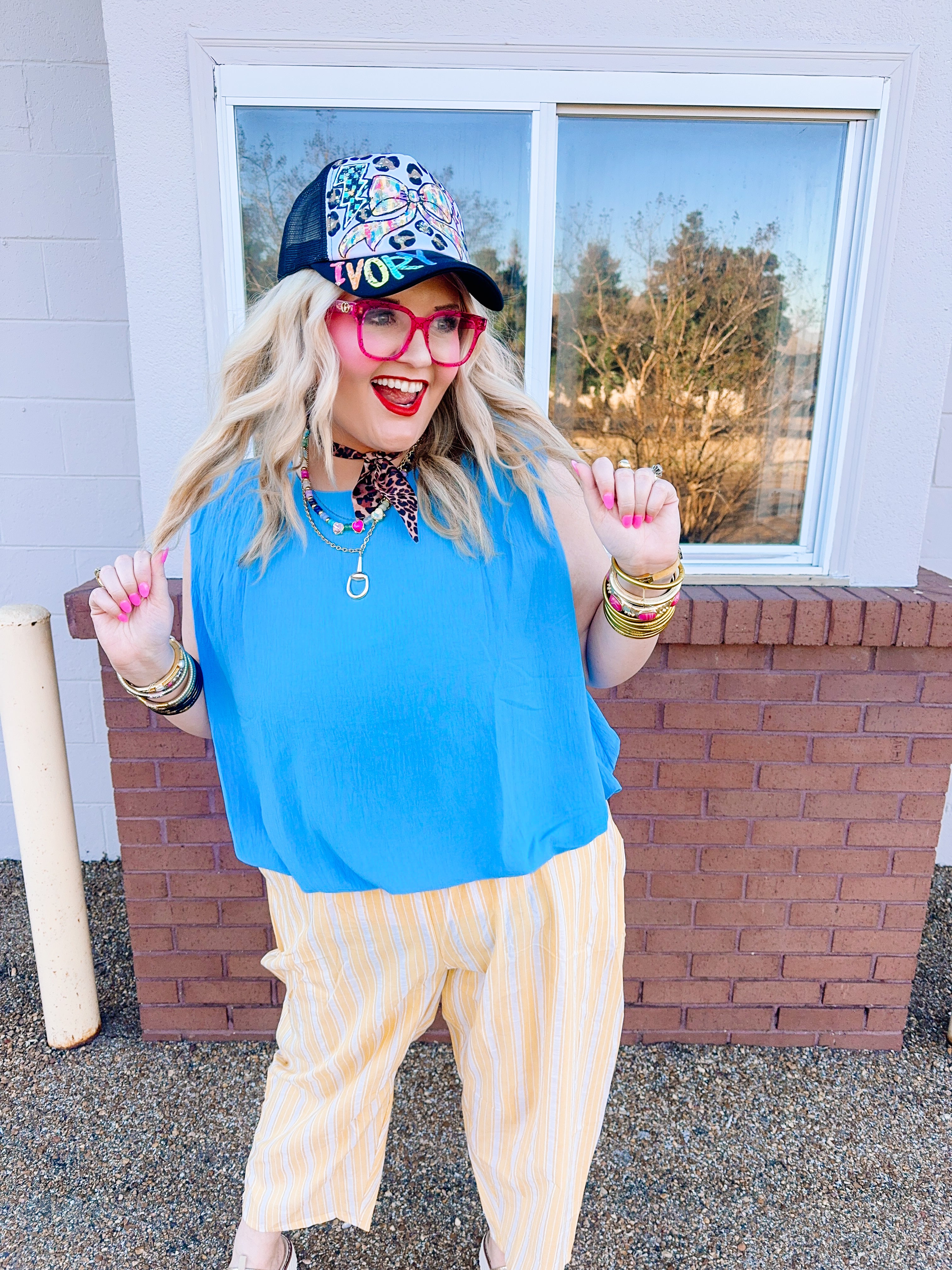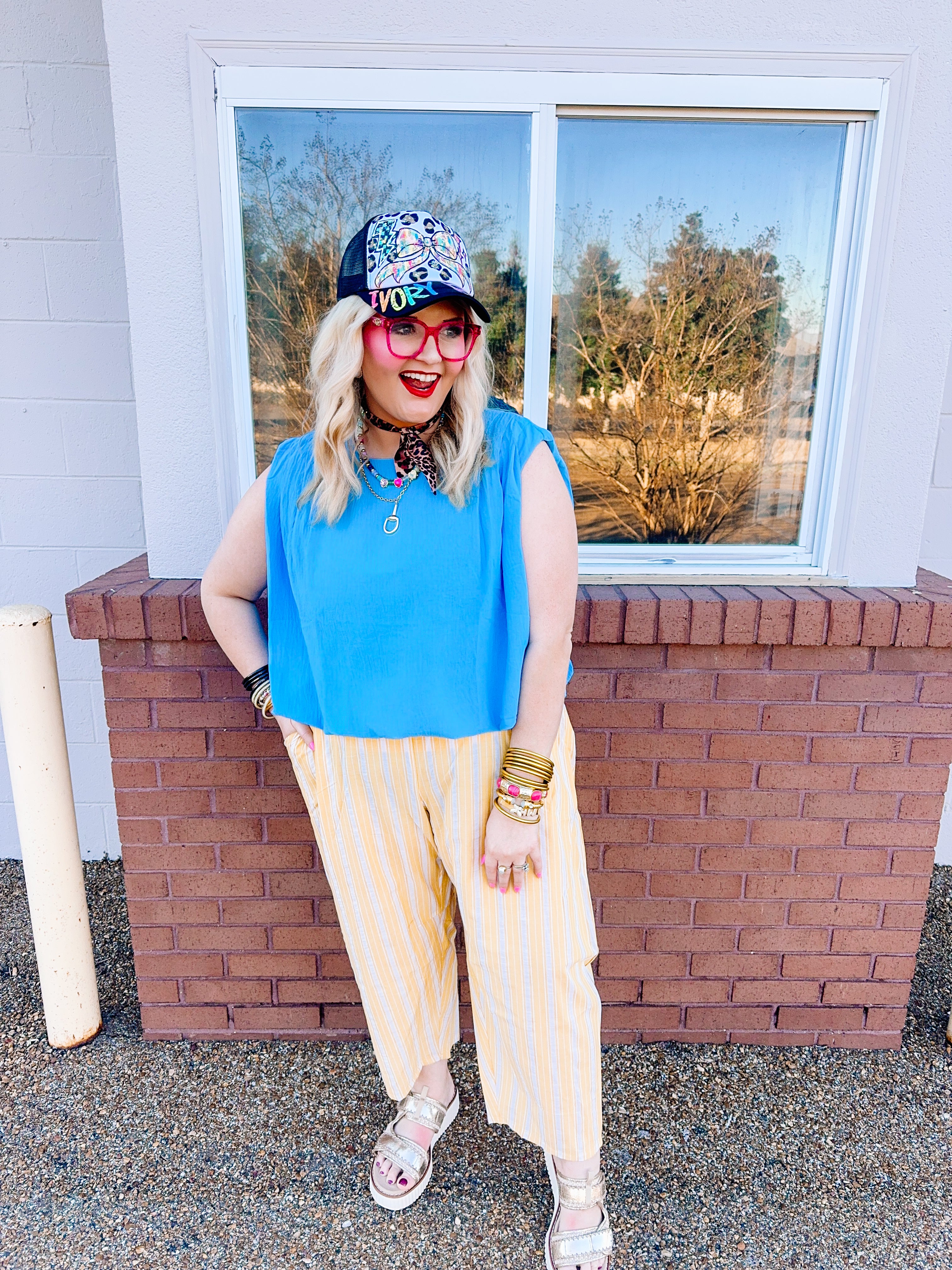 The Oddi Yellow Striped Pants feature a relaxed fit with an elastic waistband for enhanced comfort. Constructed with a gathered hem and functional pockets, these pants offer practicality in sizes S to 3X. The vibrant yellow stripes provide a distinctive visual appeal, suitable for various occasions.