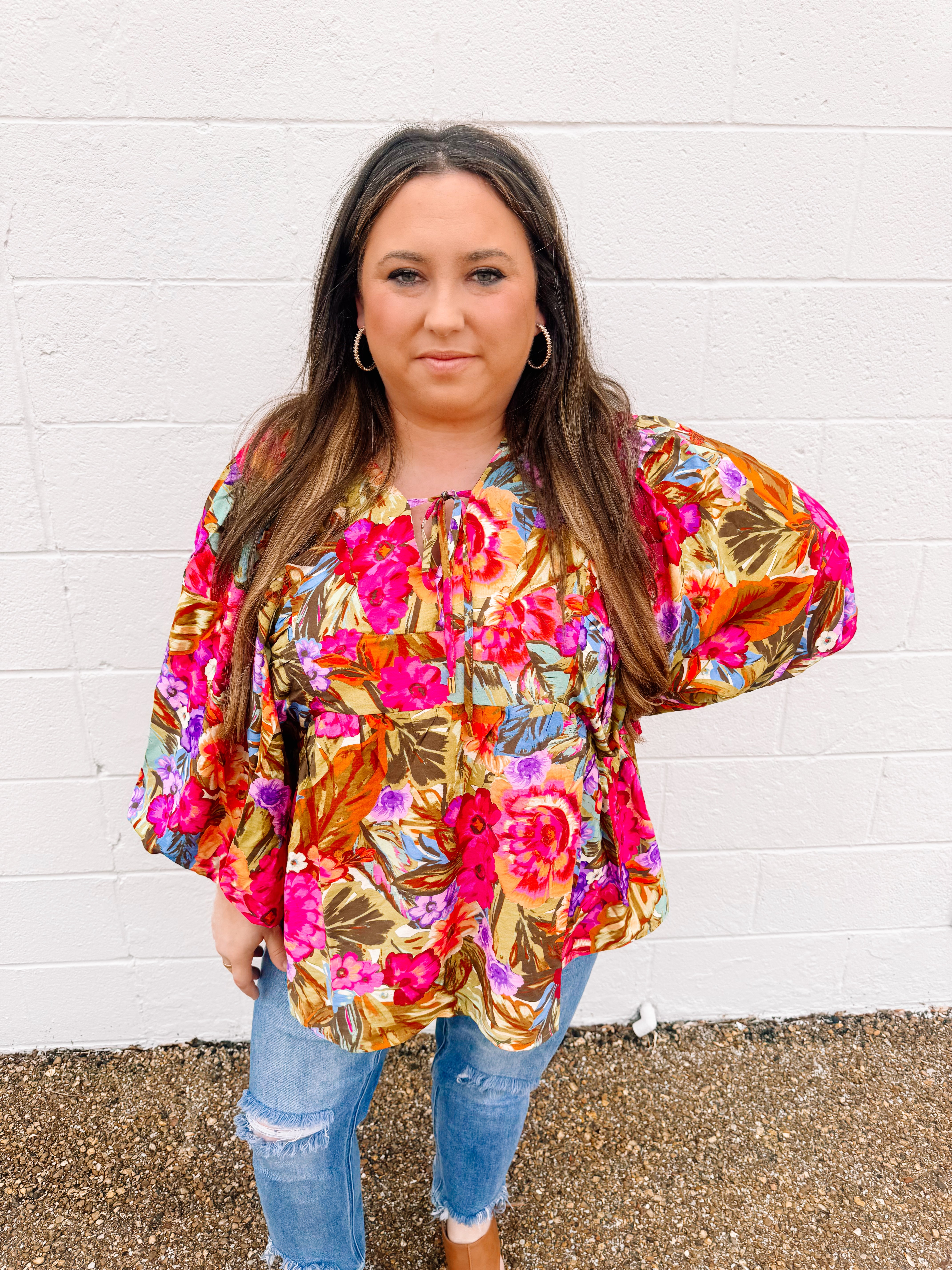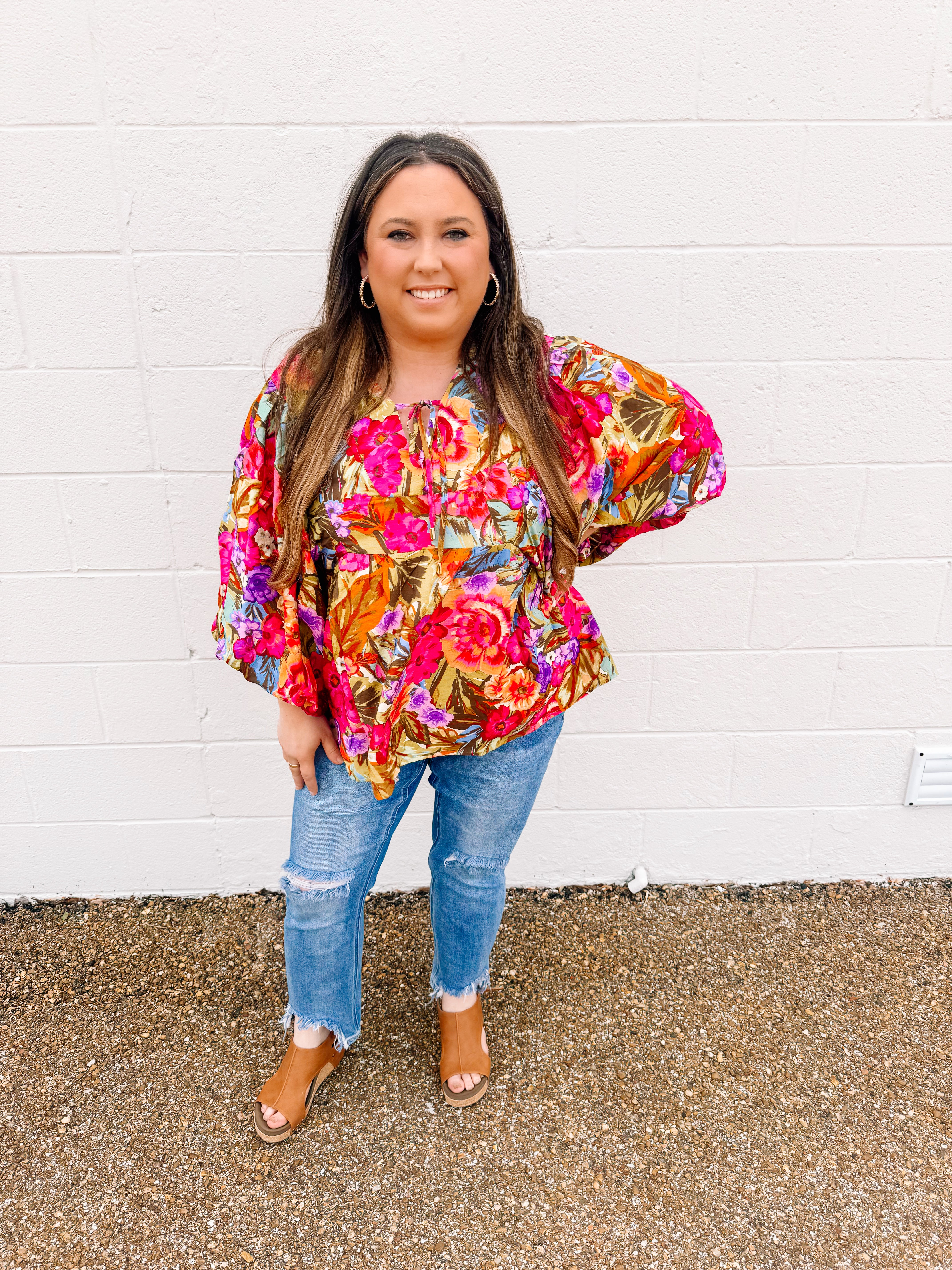 A beautiful floral top for this Spring and Summer. Pair this with your white denim or even your purple. The top is a little tighter in the top so keep that in mind.