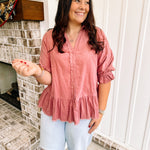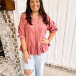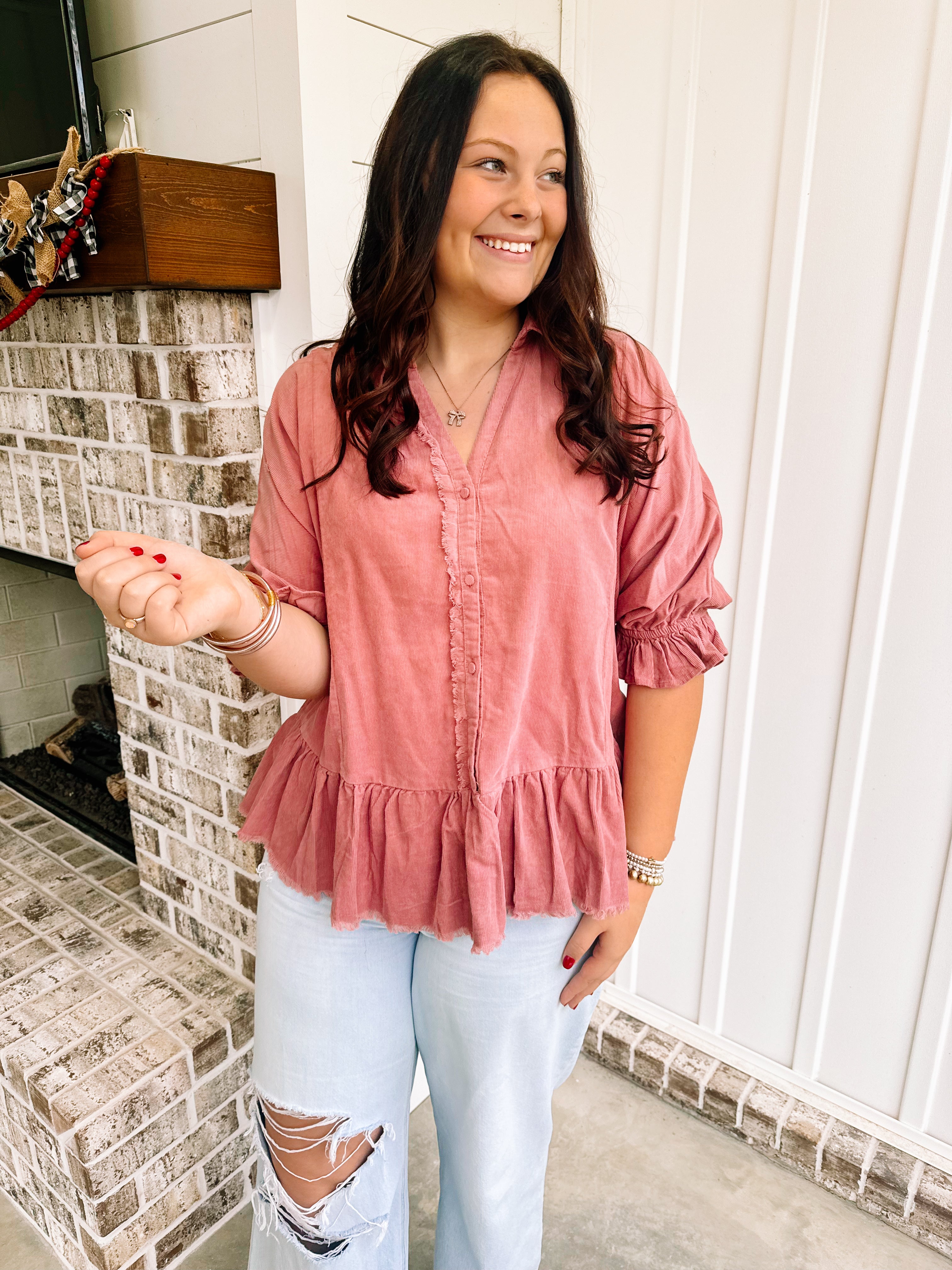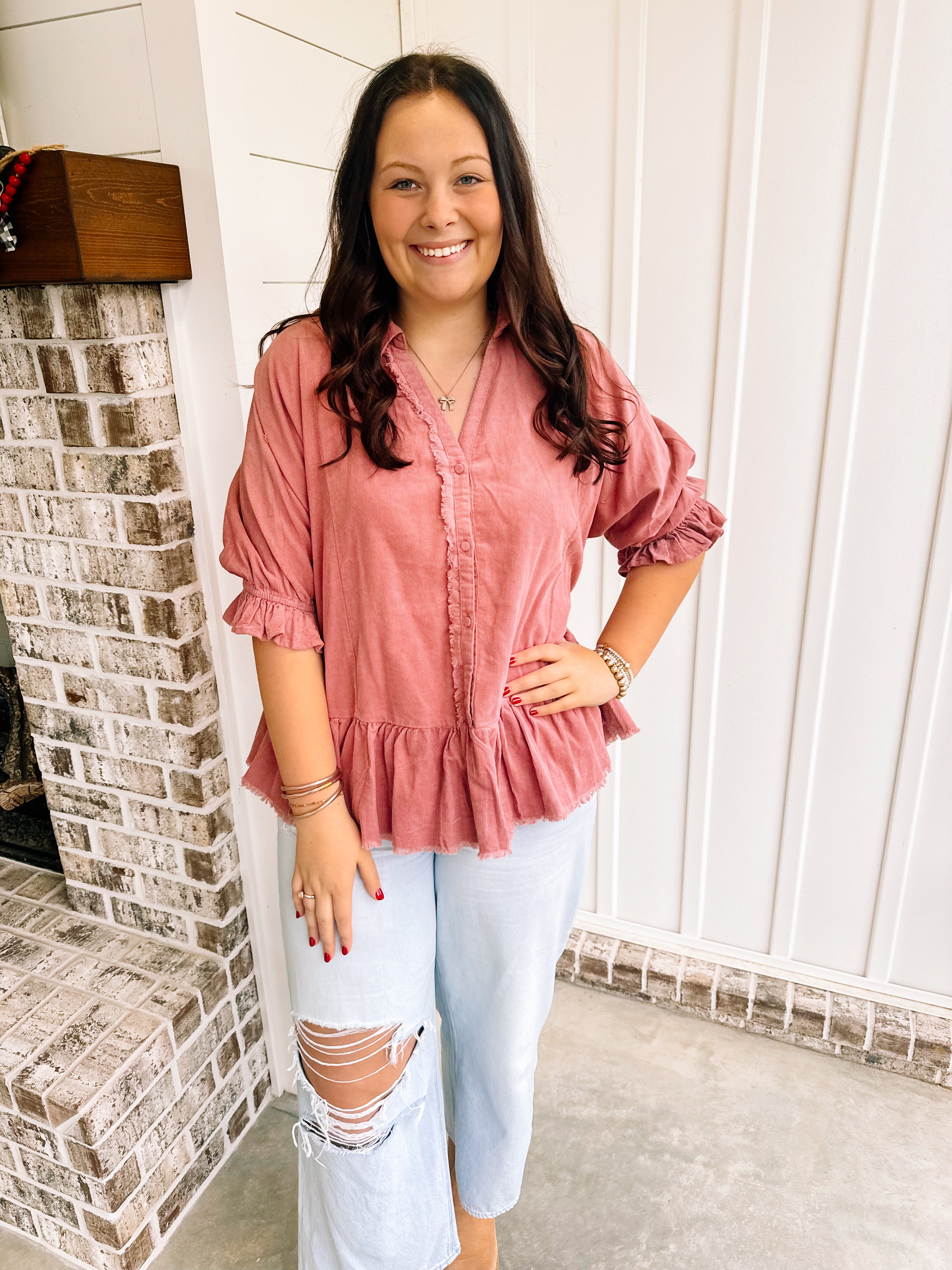 Welcome to the Pass The Wine Top! This mauve, corduroy collared top features a half button with a smocked ruffle cuff and a 3/4 sleeves. The frayed hem on the top allows you to dress it up for work or dress it down with jeans for a casual day.
