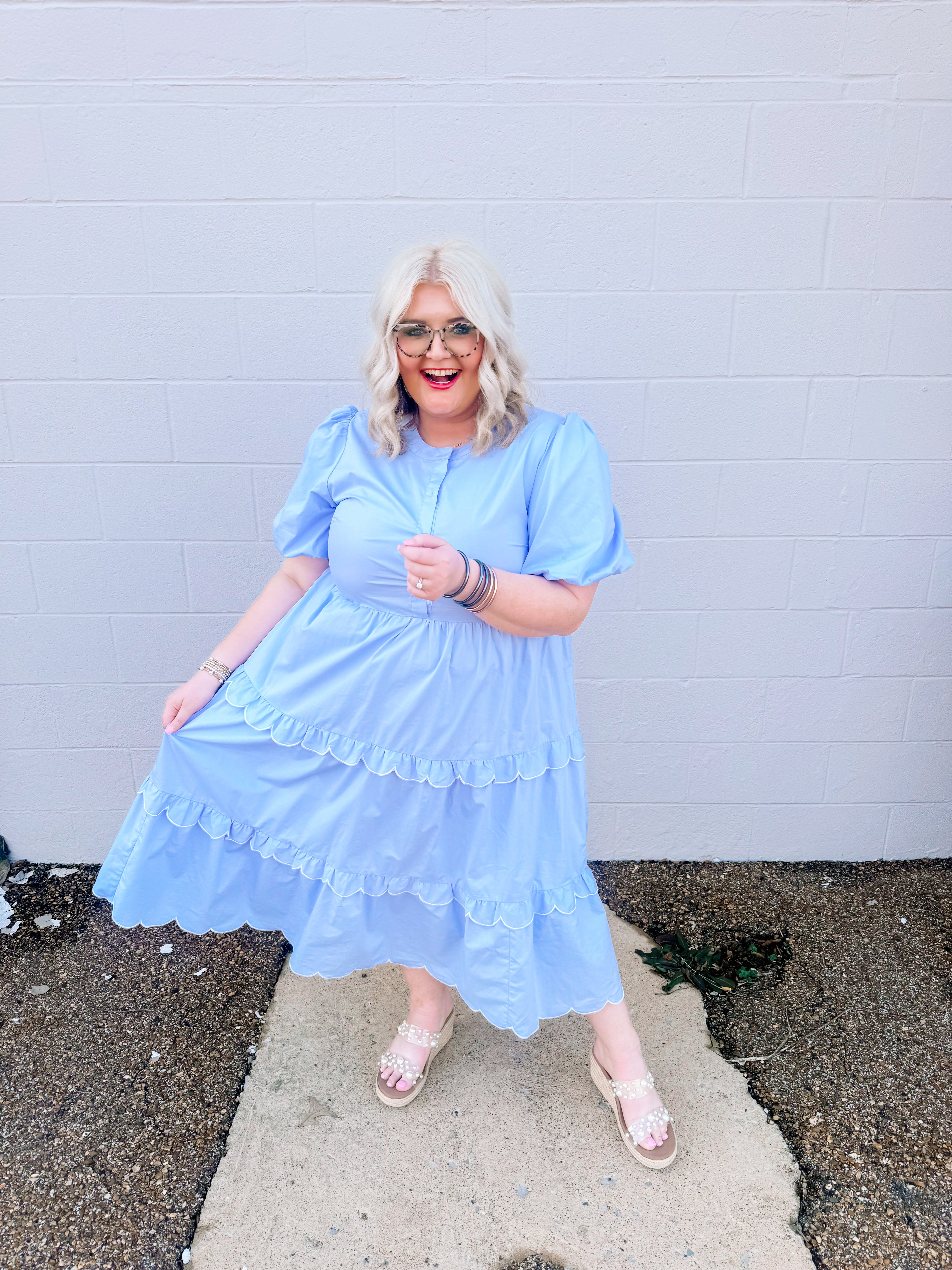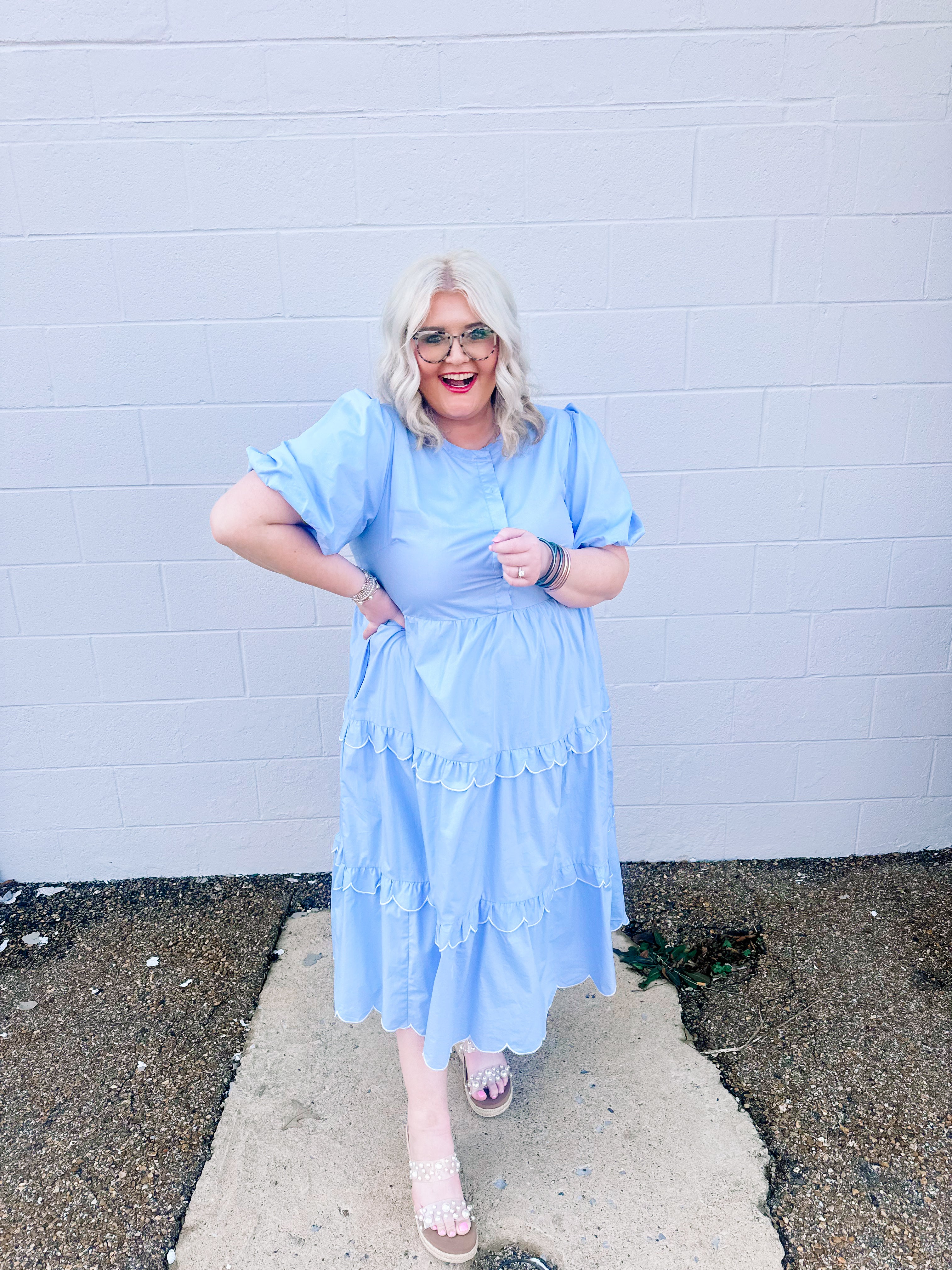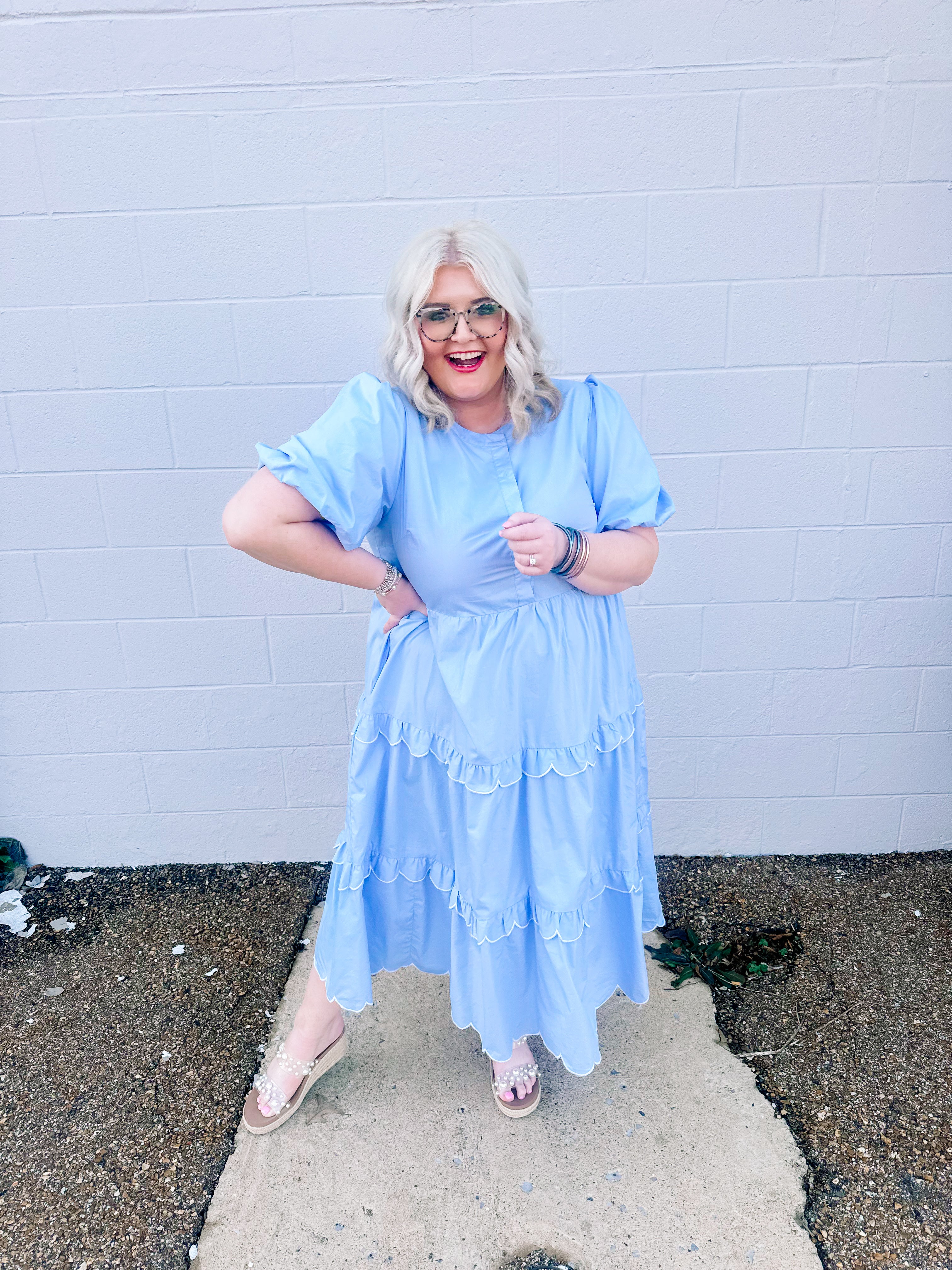 Talk about a breathtaking powder blue dress for Spring. This is a short bubble sleeve midi dress with a scalloped edge trimmed tired detailing. Easter is around the corner but so is Sundays in the Spring.