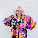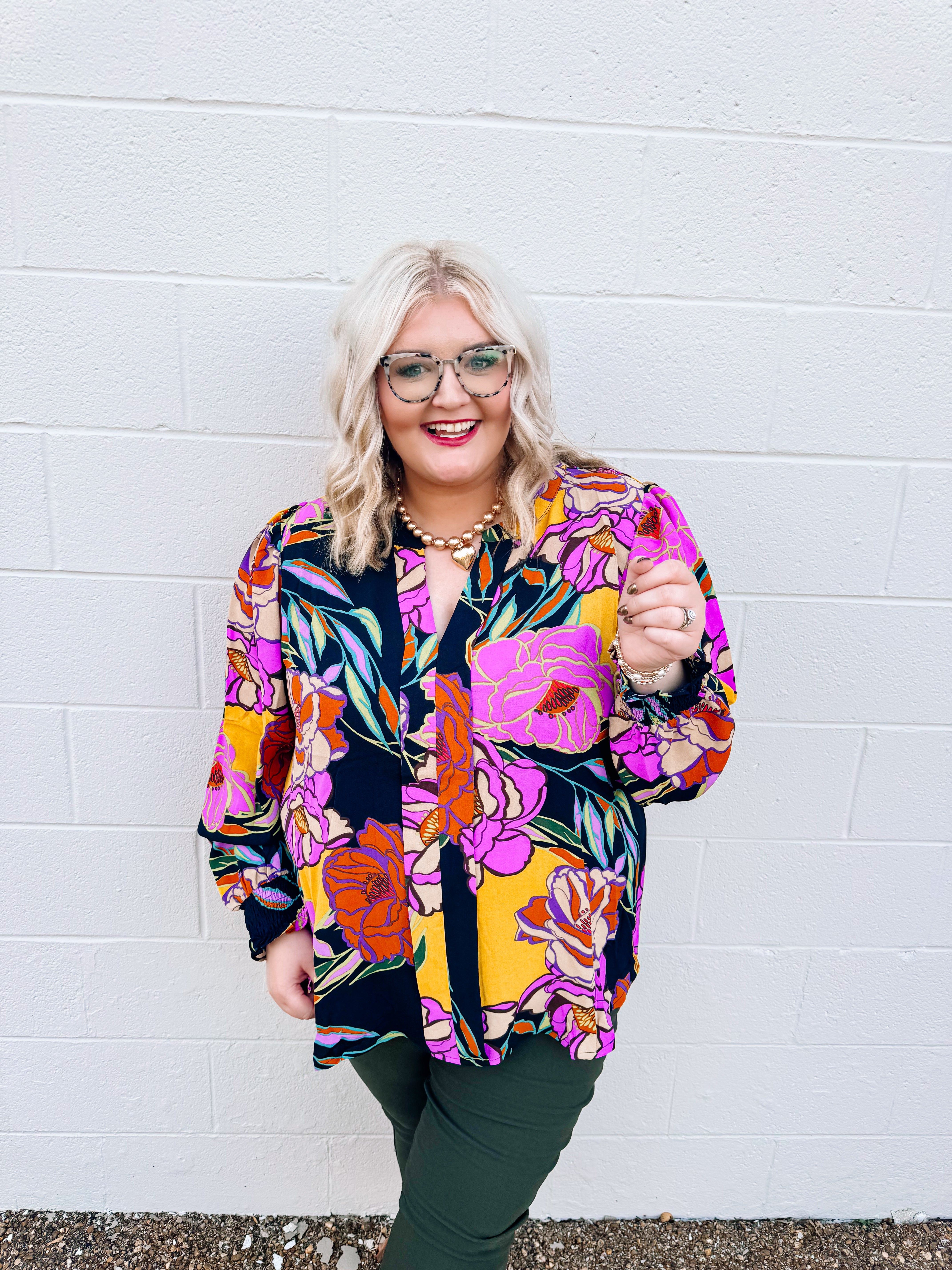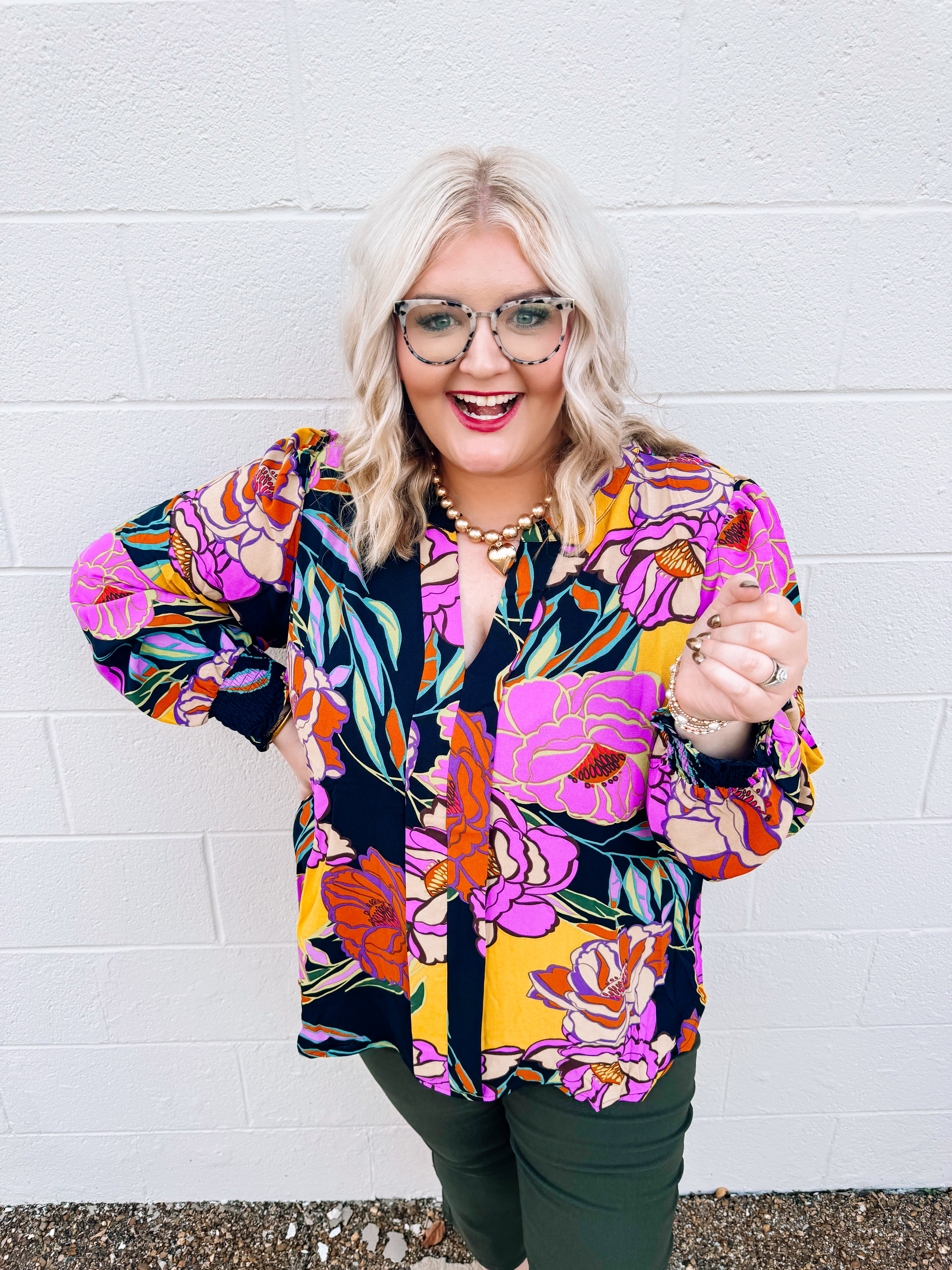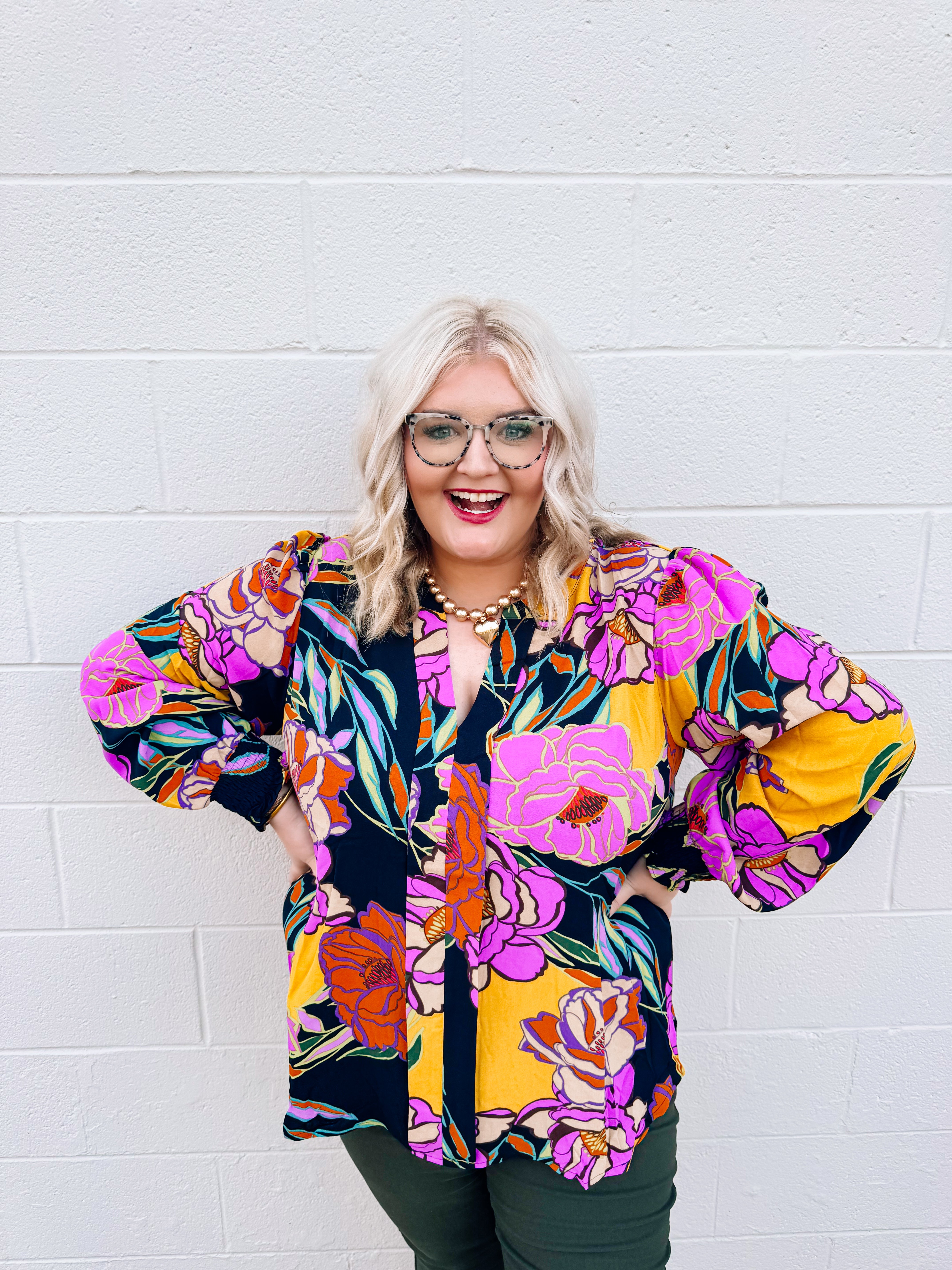 Introducing the Purple Rain Top! This v-neckline top with smocked sleeves is an essential boutique addition to the wardrobe of every working woman this Fall. Boasting a chic v-neckline with smocked sleeves offers a sophisticated silhouette suitable for any setting. With its bold Fall colors of purple, gold, black and orange, this top effortlessly combines fashion-forward design with practicality that ensures you make a statement thru out the day.