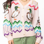 Embrace autumn vibes with this cozy beige cardigan, showcasing playful sequin ducks and a lively zig zag print. Perfect for adding a spark of fun and warmth to your fall wardrobe, it’s your new go-to layer for crisp, colorful days.