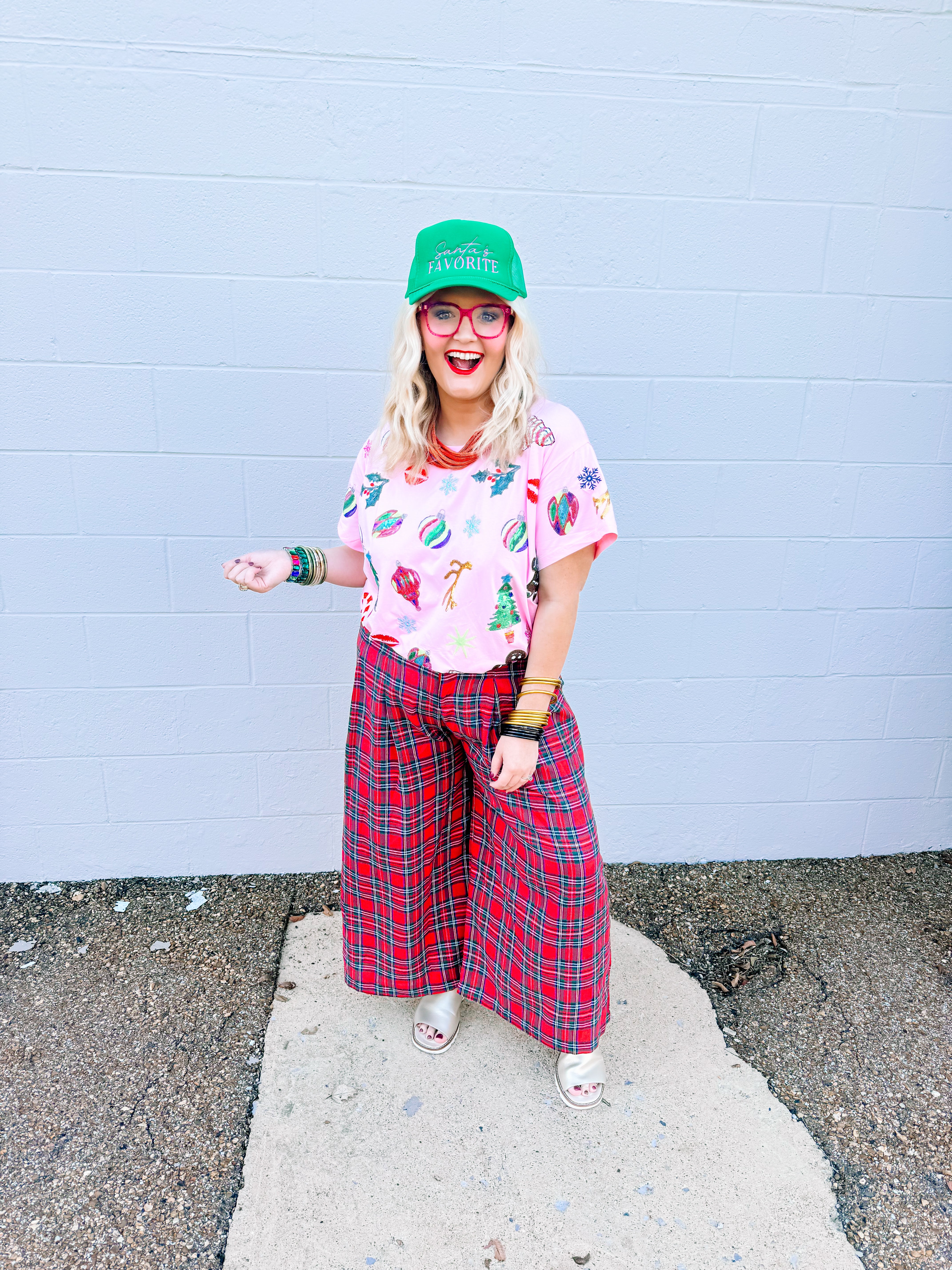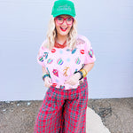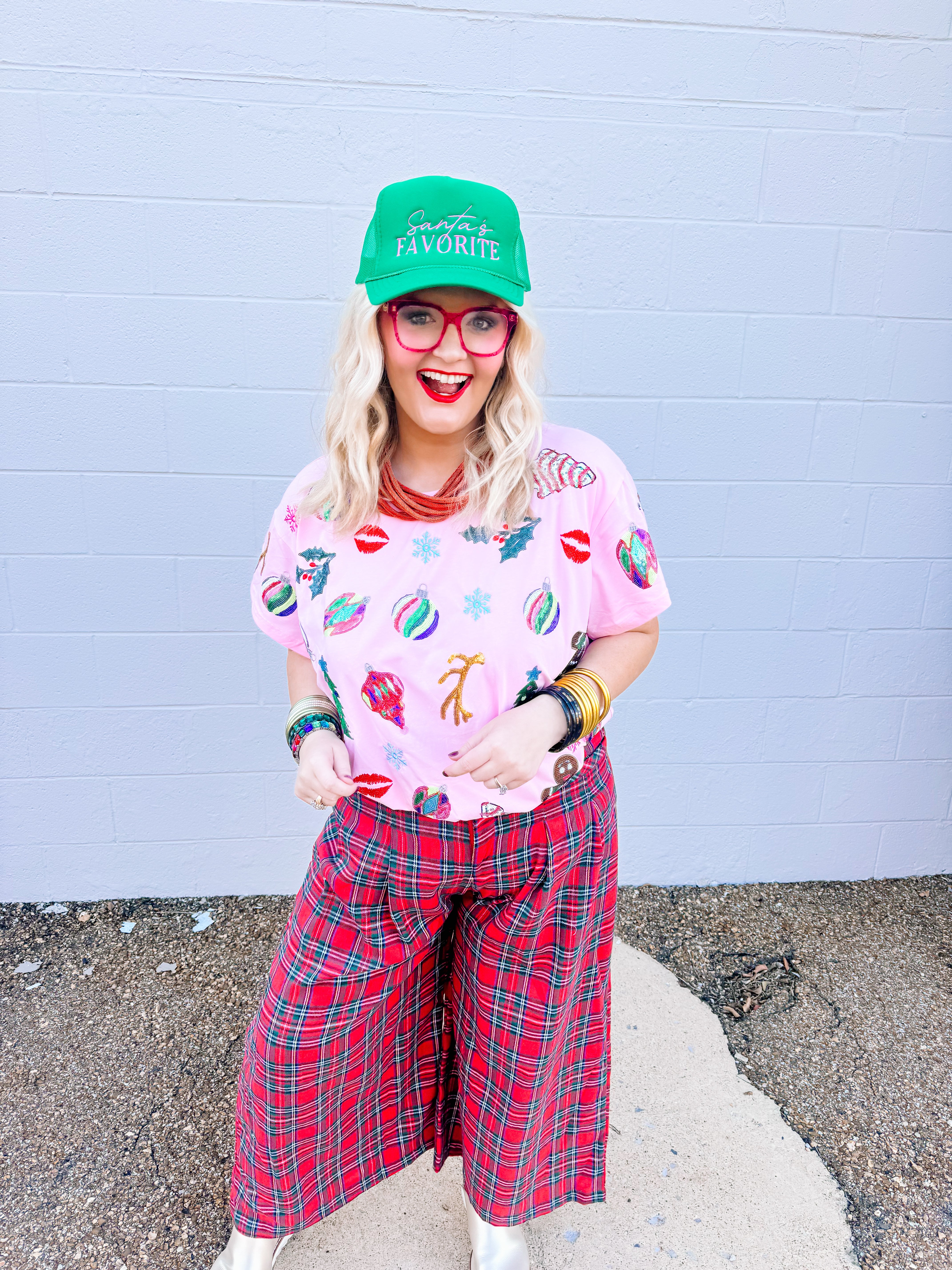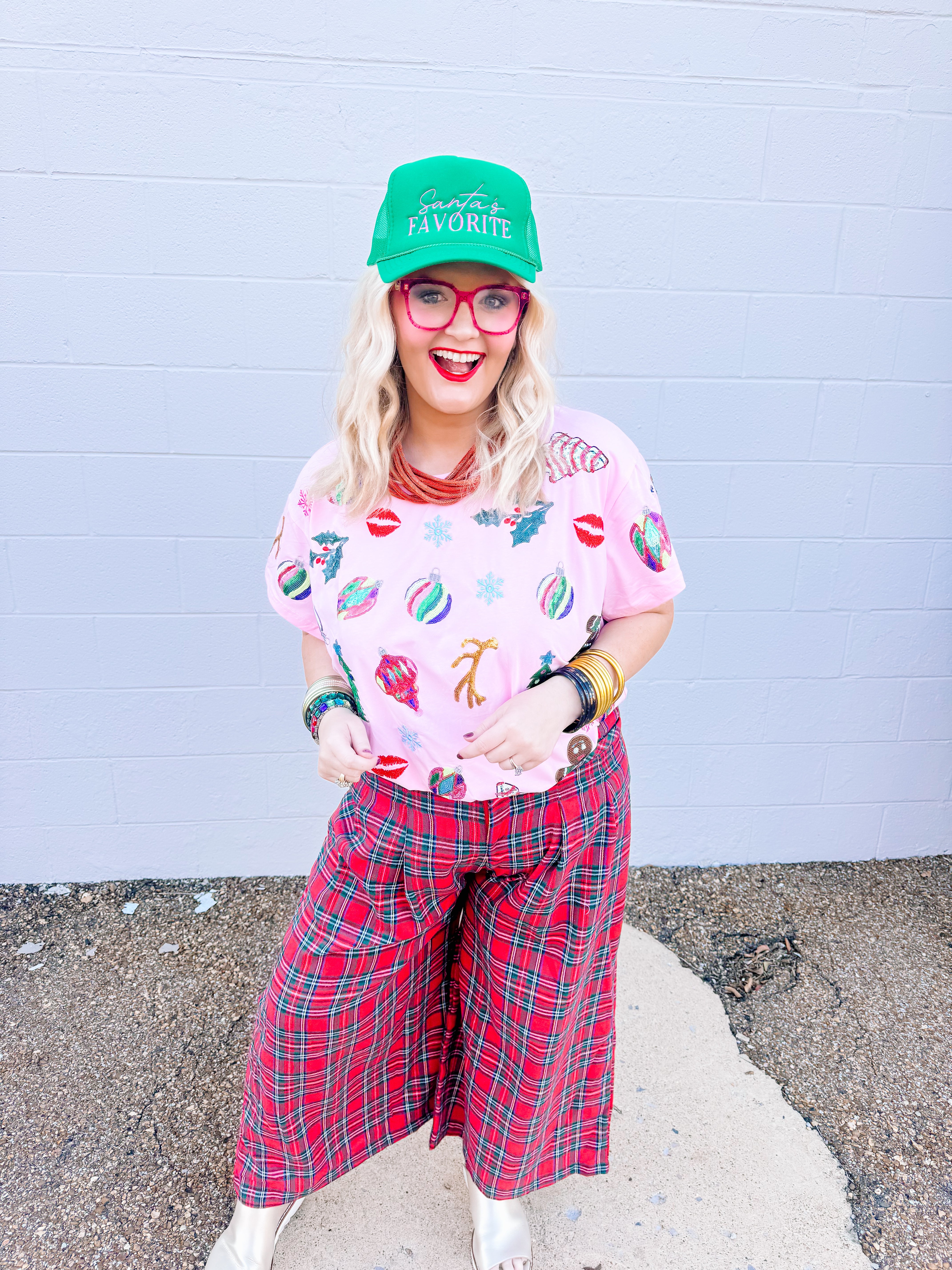 This light pink tee brings festive cheer with sparkling sequin Christmas icons that shine bright. Soft and comfortable, it’s perfect for adding a playful sparkle to your holiday outfit while keeping things cozy. Celebrate the season in style with this glittering, fun-to-wear tee!