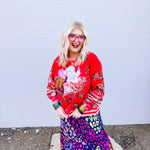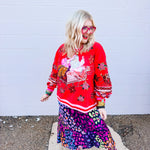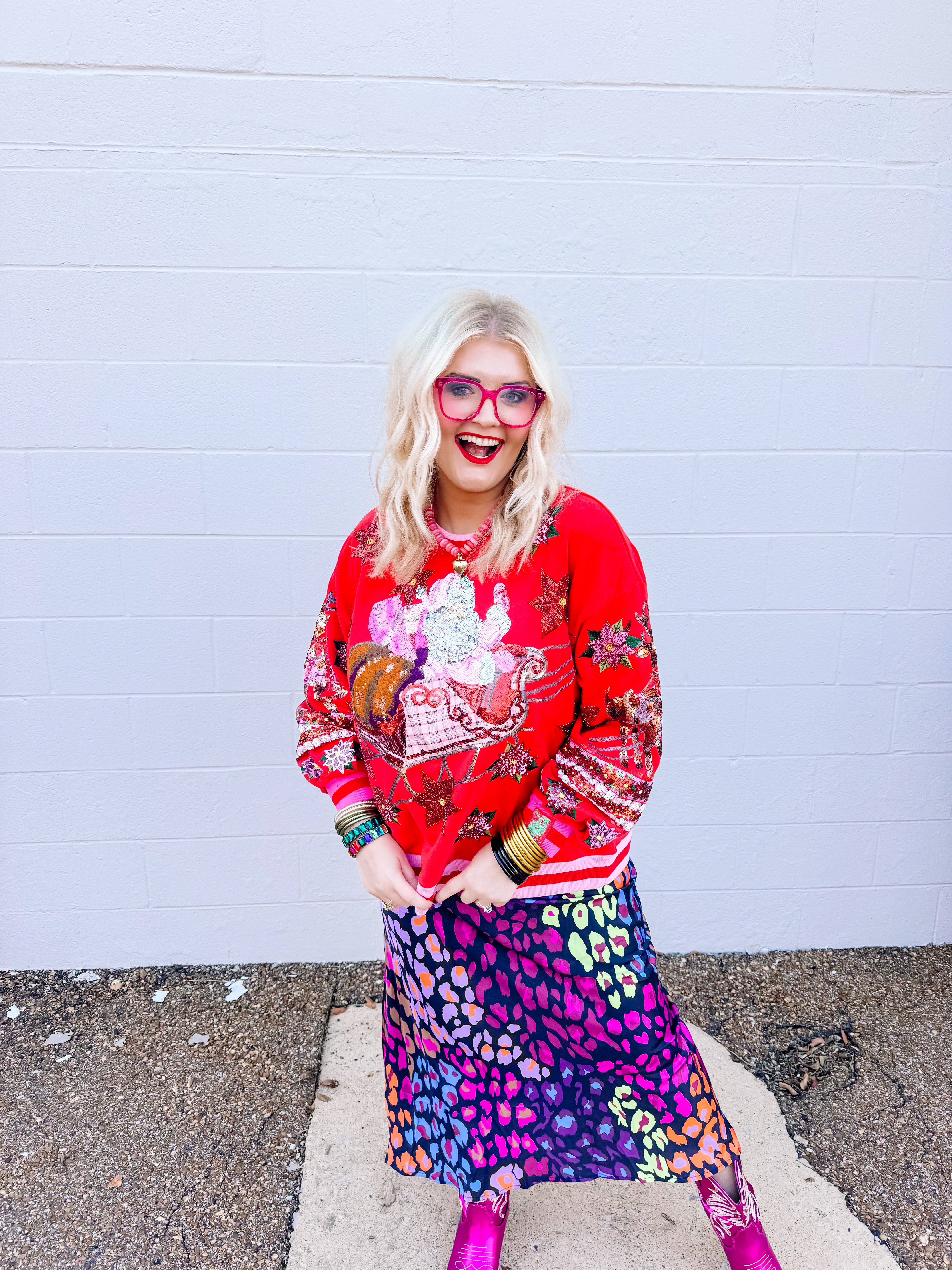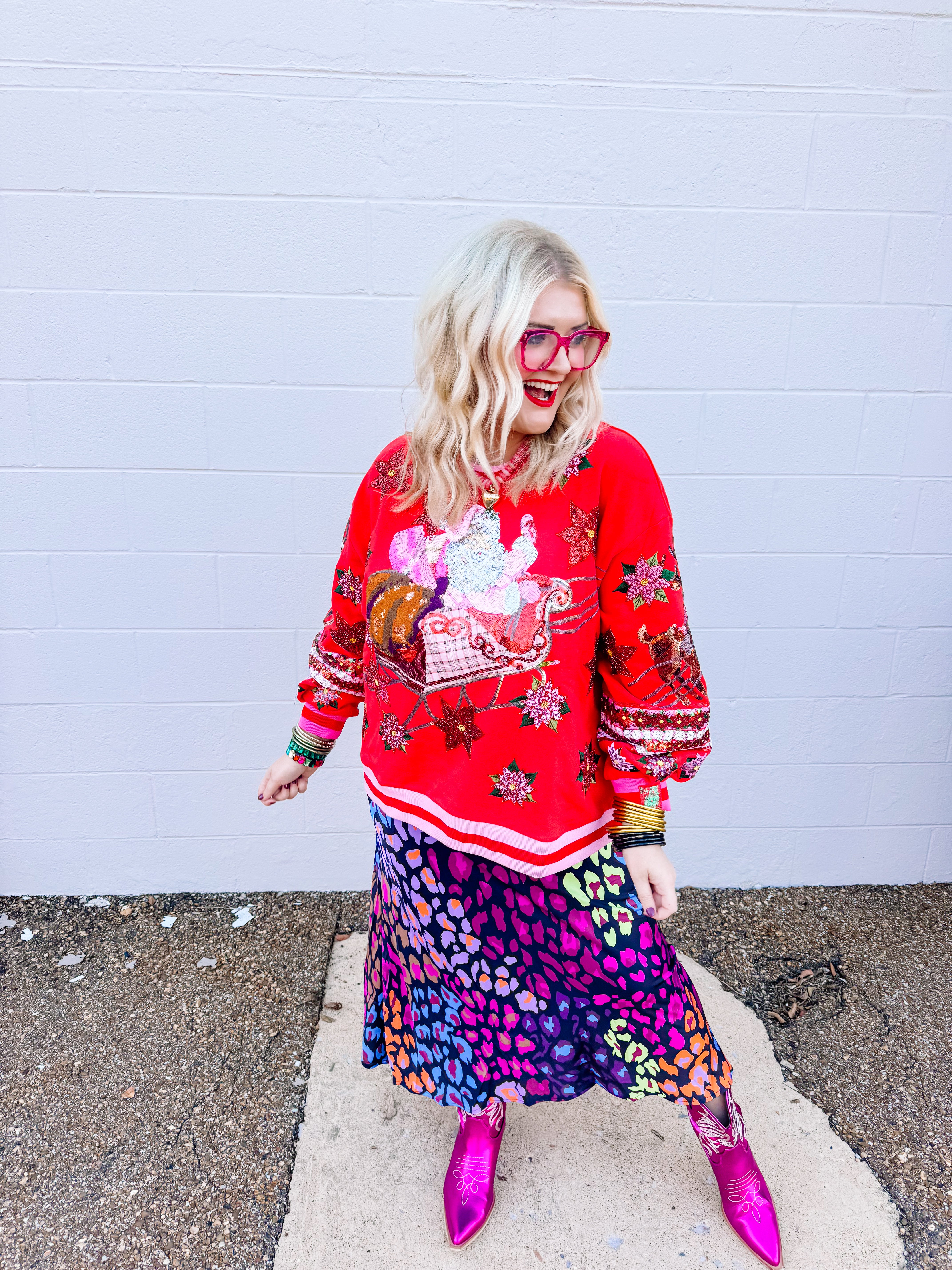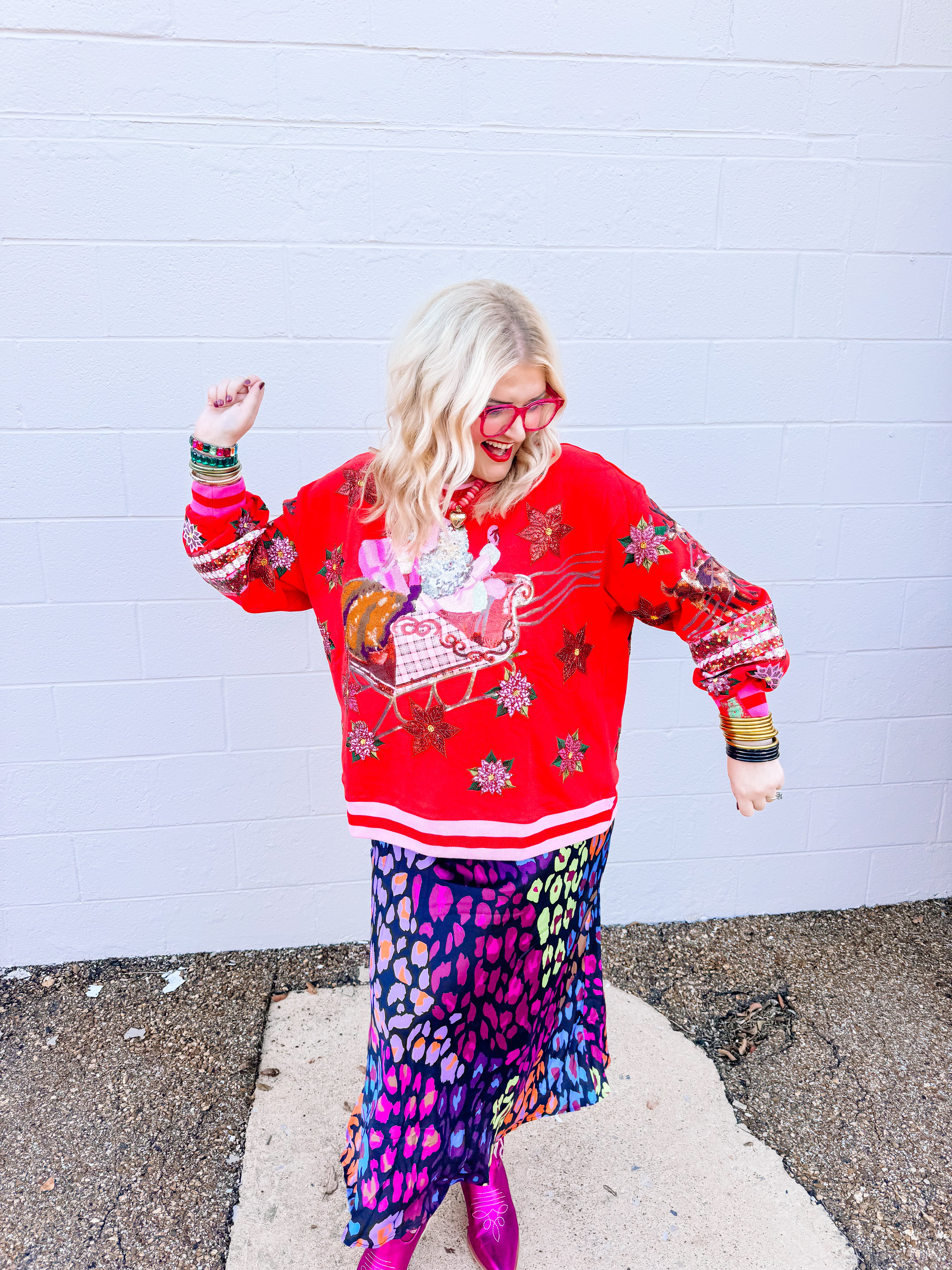 This red sweatshirt brings holiday cheer with a vintage Santa design on both front and back, capturing nostalgic vibes. Its slightly oversized fit makes it cozy and perfect for festive lounging or playful winter outings. Add a fun, retro twist to your seasonal wardrobe with this standout piece!