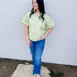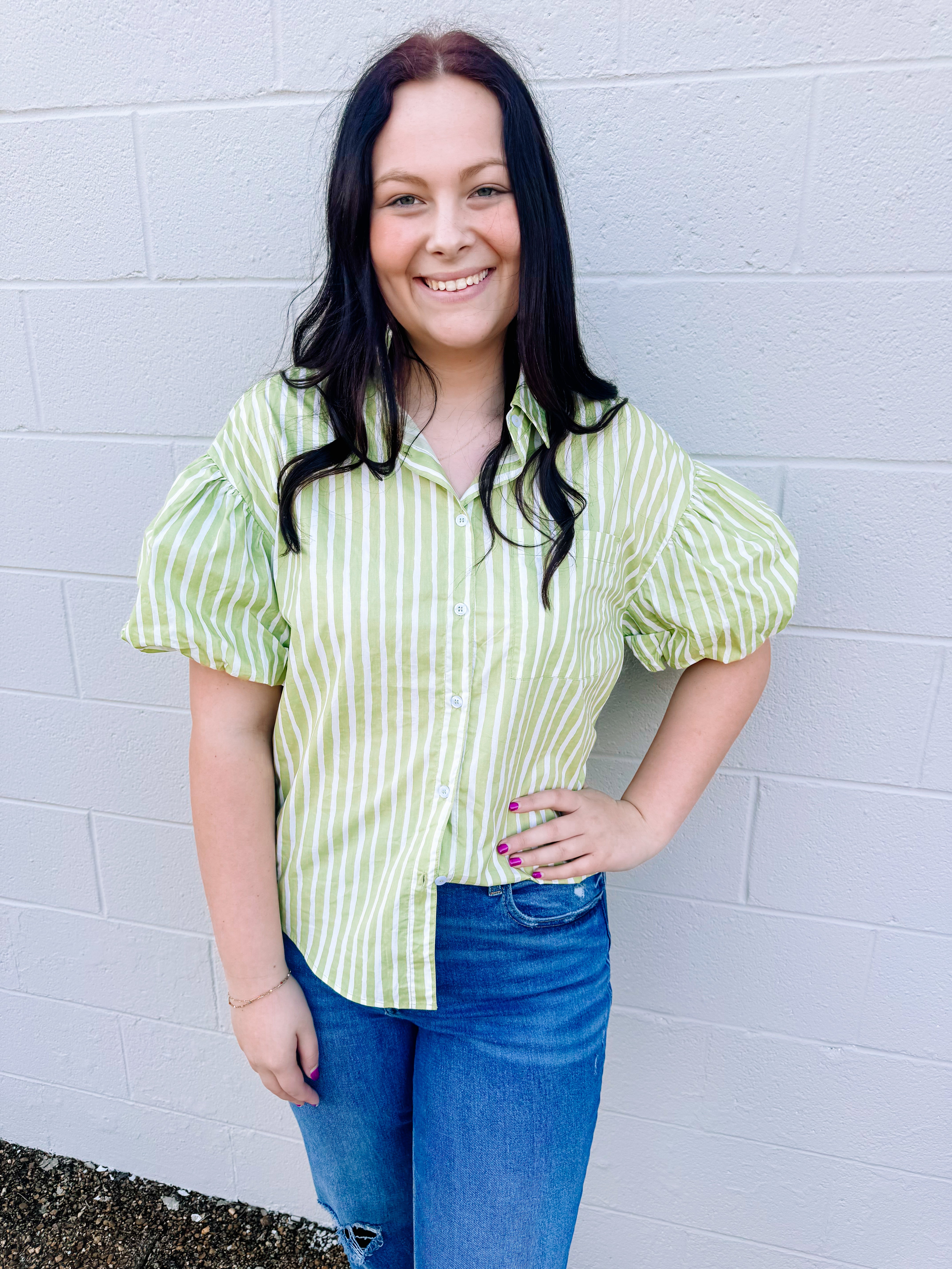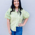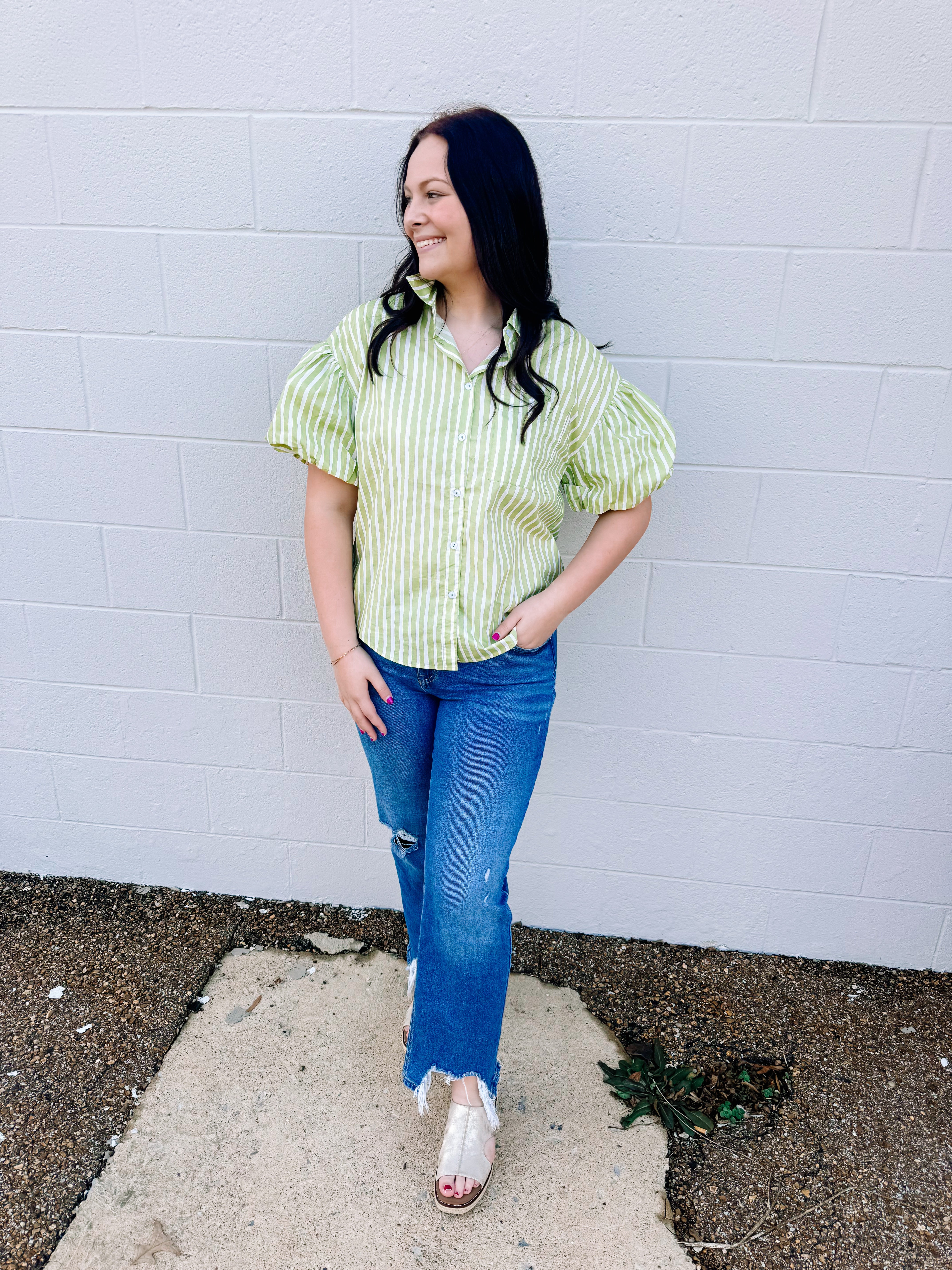 Who is ready for the Beach? These two tops make me think of the Beach and everything to do with coastal vibes! These are a striped poplin button down shirt with bubble short sleeves! We have this adorable top available in Purple and Green.