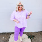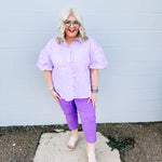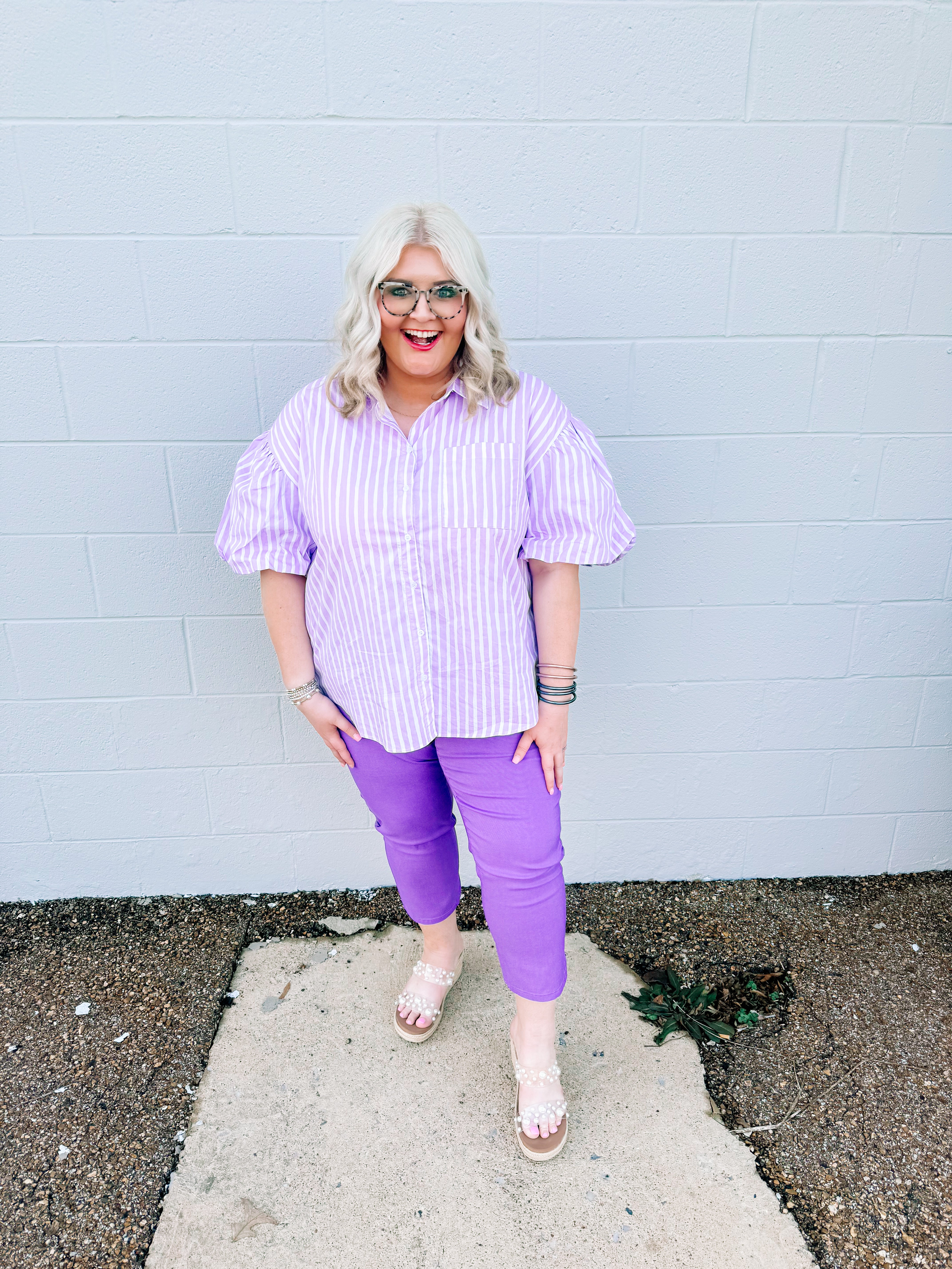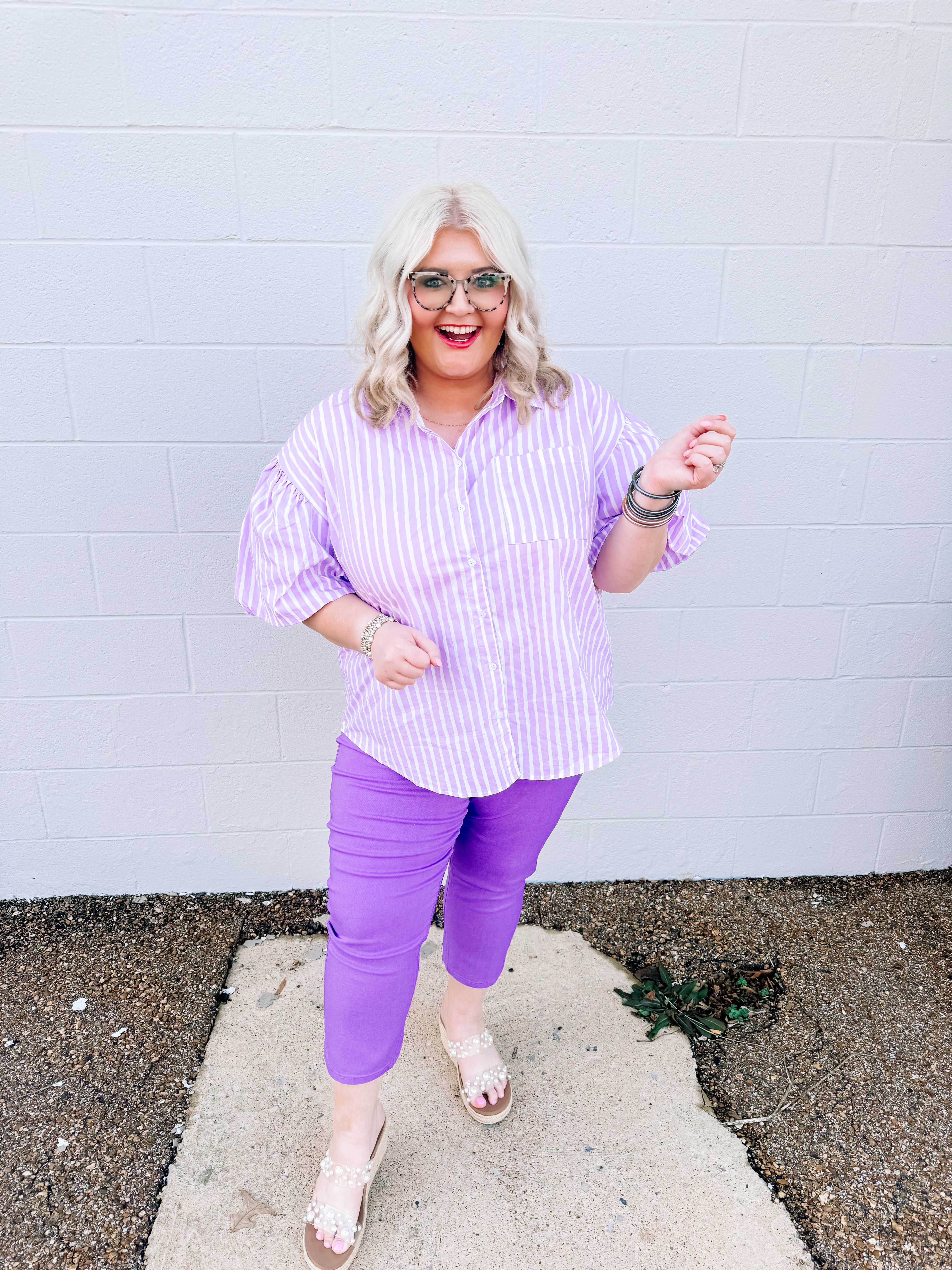 Who is ready for the Beach? These two tops make me think of the Beach and everything to do with coastal vibes! These are a striped poplin button down shirt with bubble short sleeves! We have this adorable top available in Purple and Green.