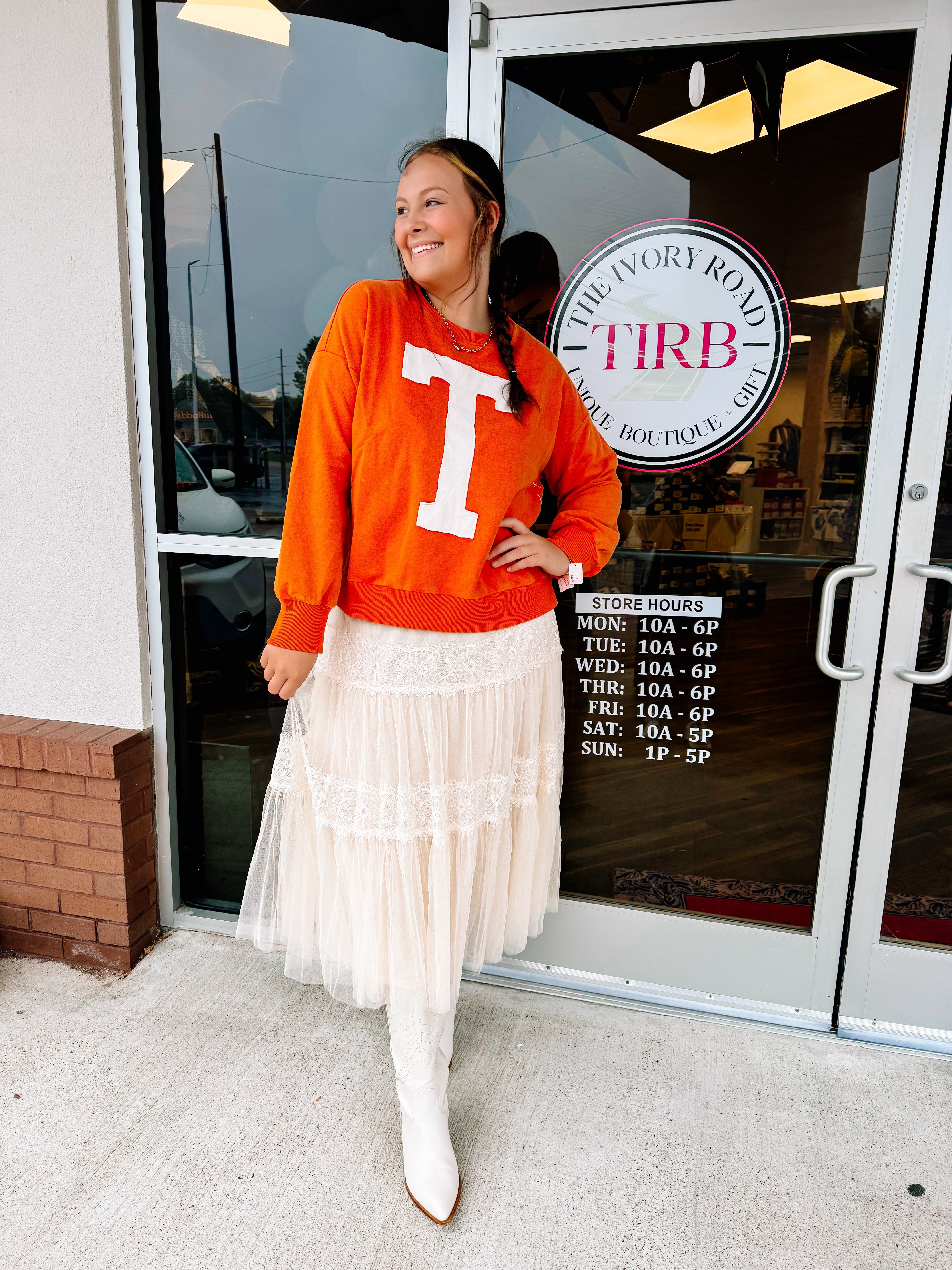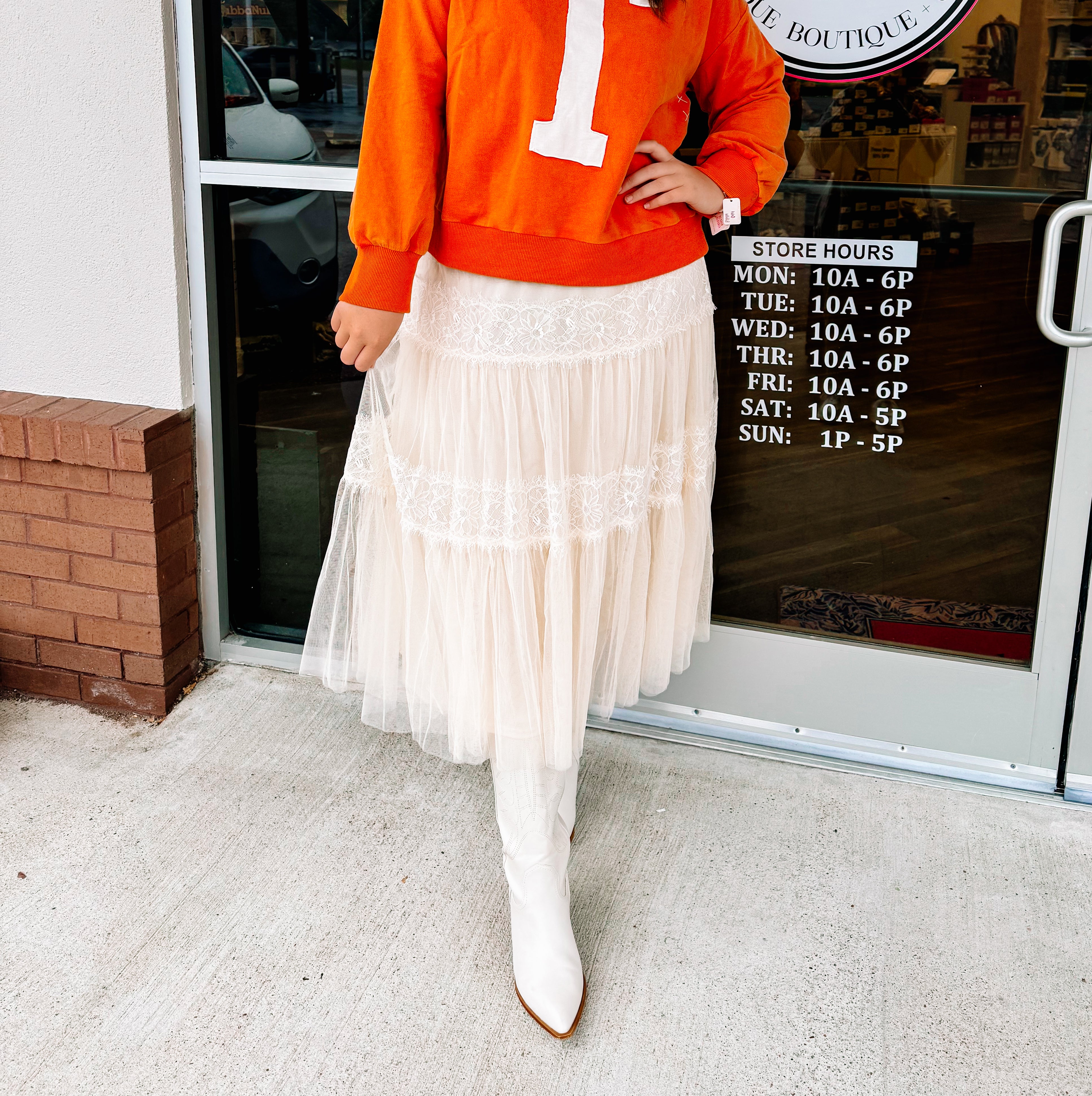 All of your boho dreams have been answered with this one! How about a bottom that is versatile and can go from work to night? This skirt is a mesh tiered midi skirt with lace detailing. Pair with your favorite graphic tee or top!
