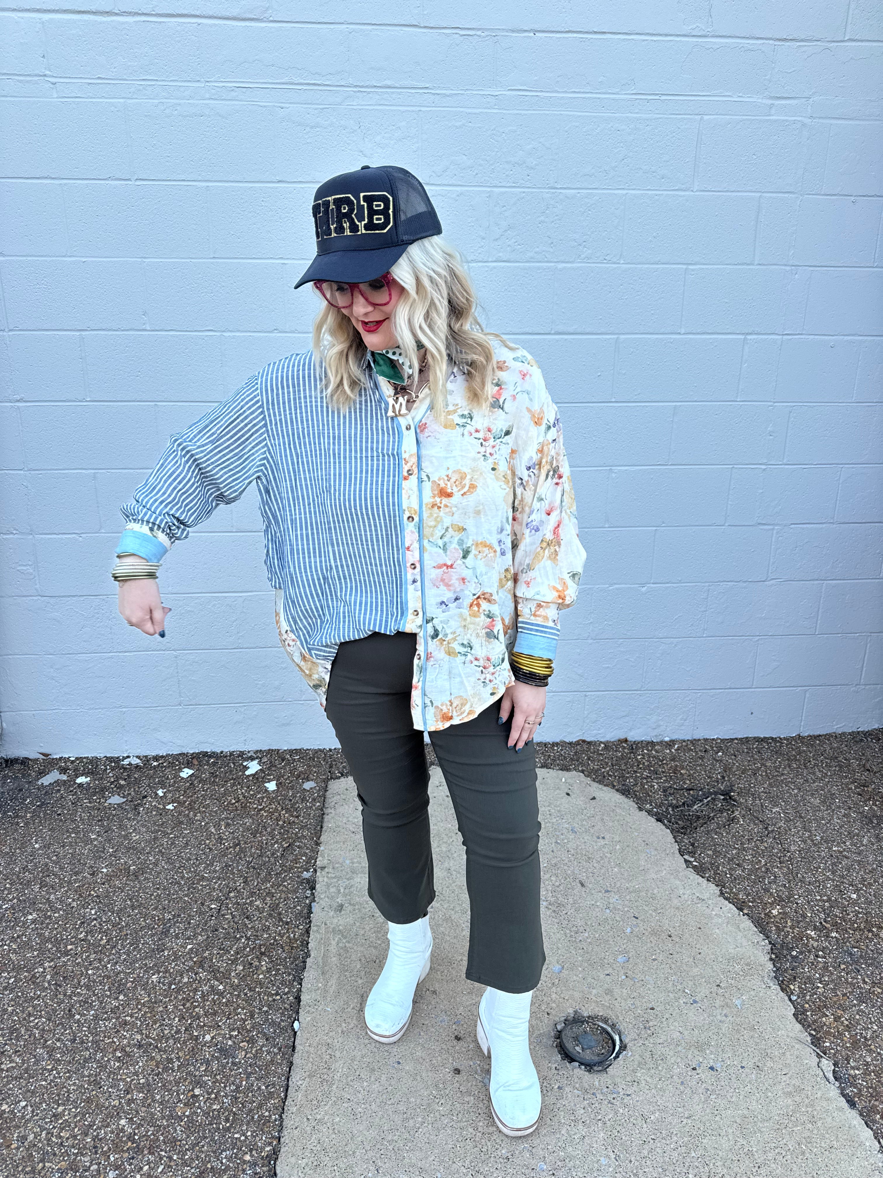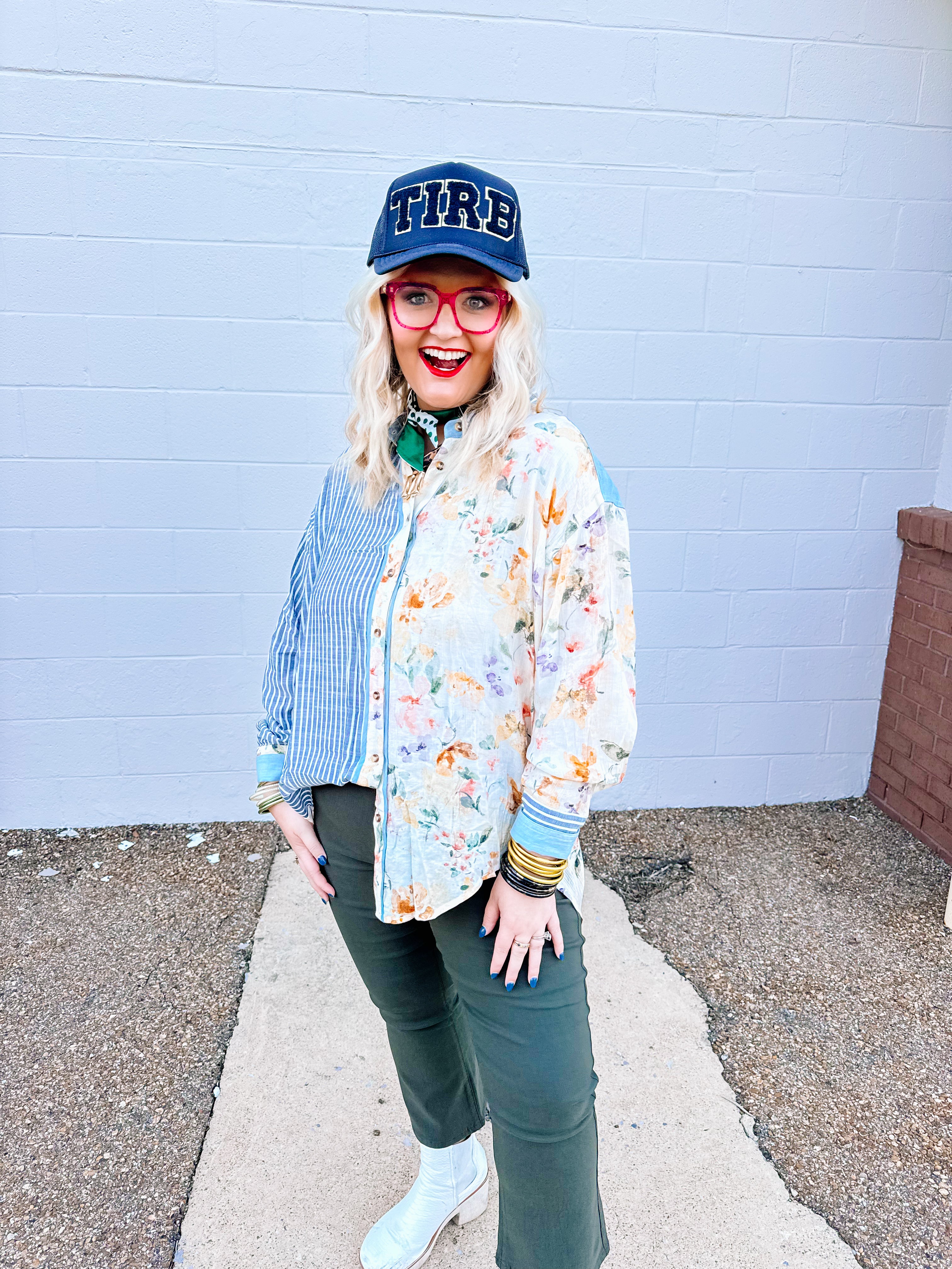 The Sew in Love Button Down Floral-Stripe Top combines timeless denim accents with delicate ivory floral stripes for a refined, versatile look. Crafted with attention to detail, this top offers a structured yet comfortable fit ideal for layering or standalone wear. Its classic button-down design enhances your wardrobe with subtle sophistication, perfect for both casual and polished settings.