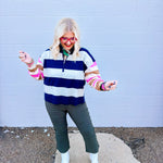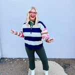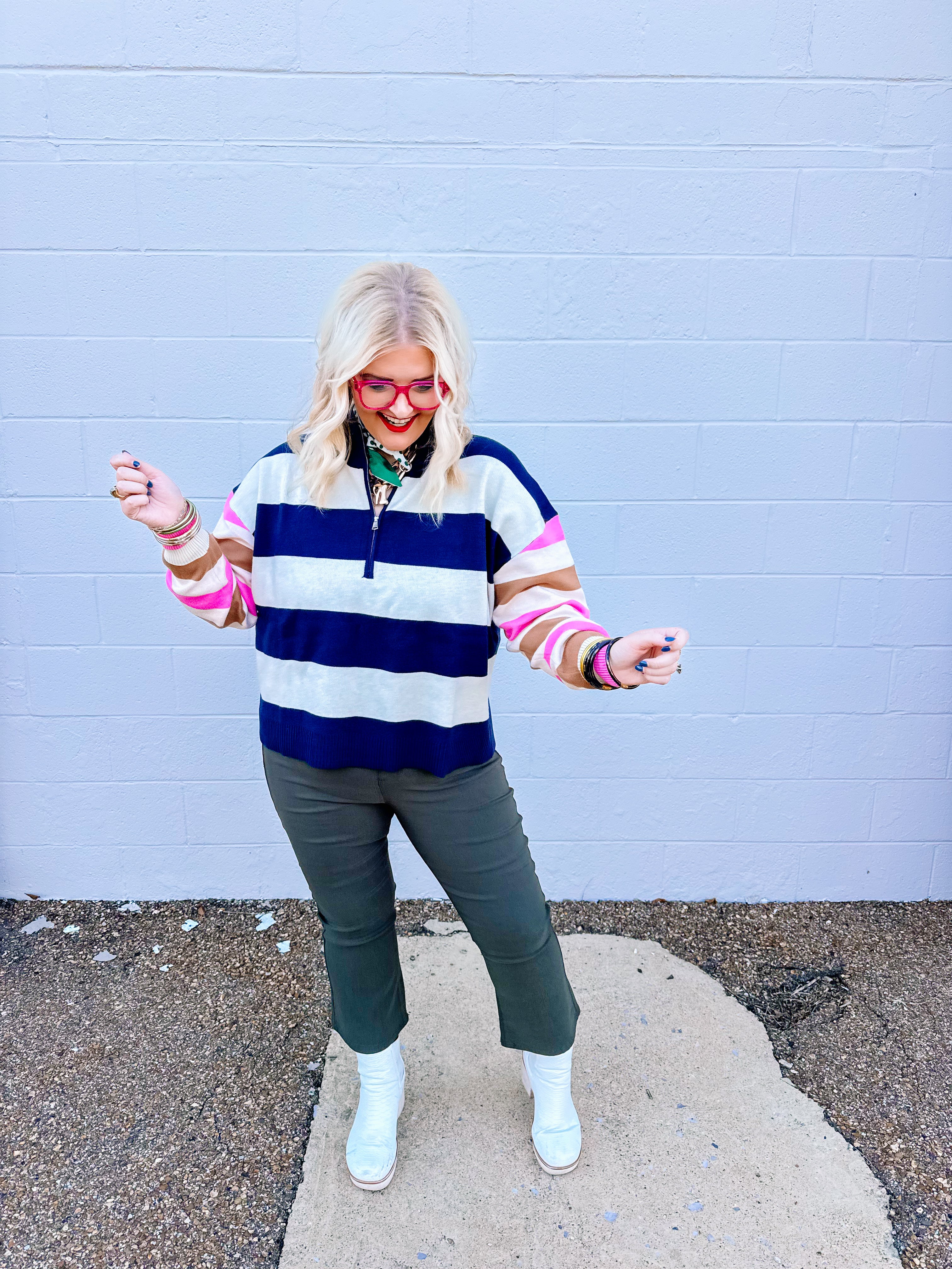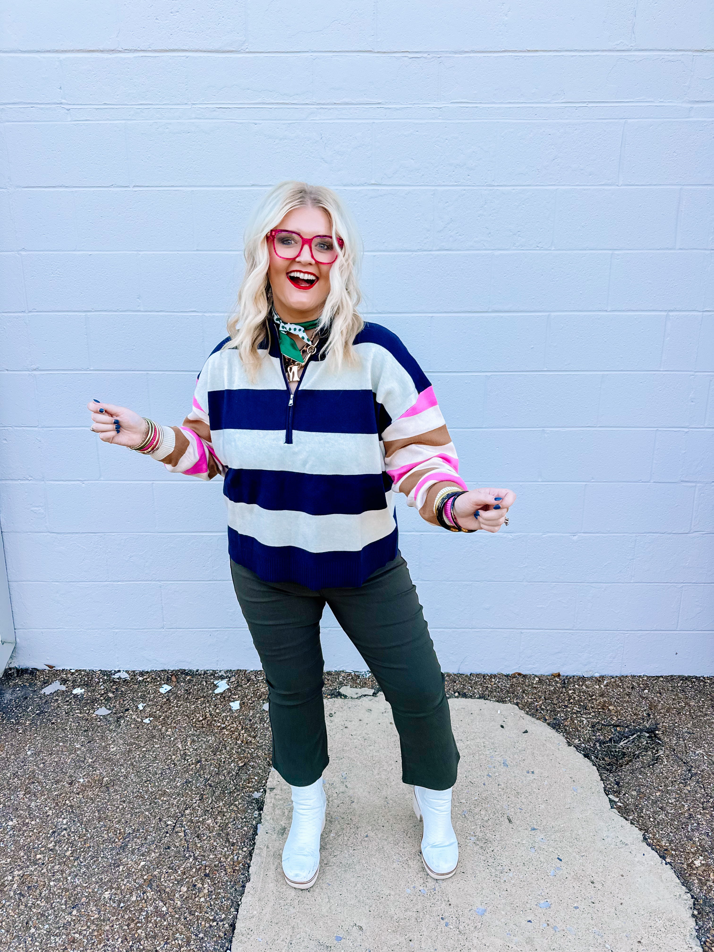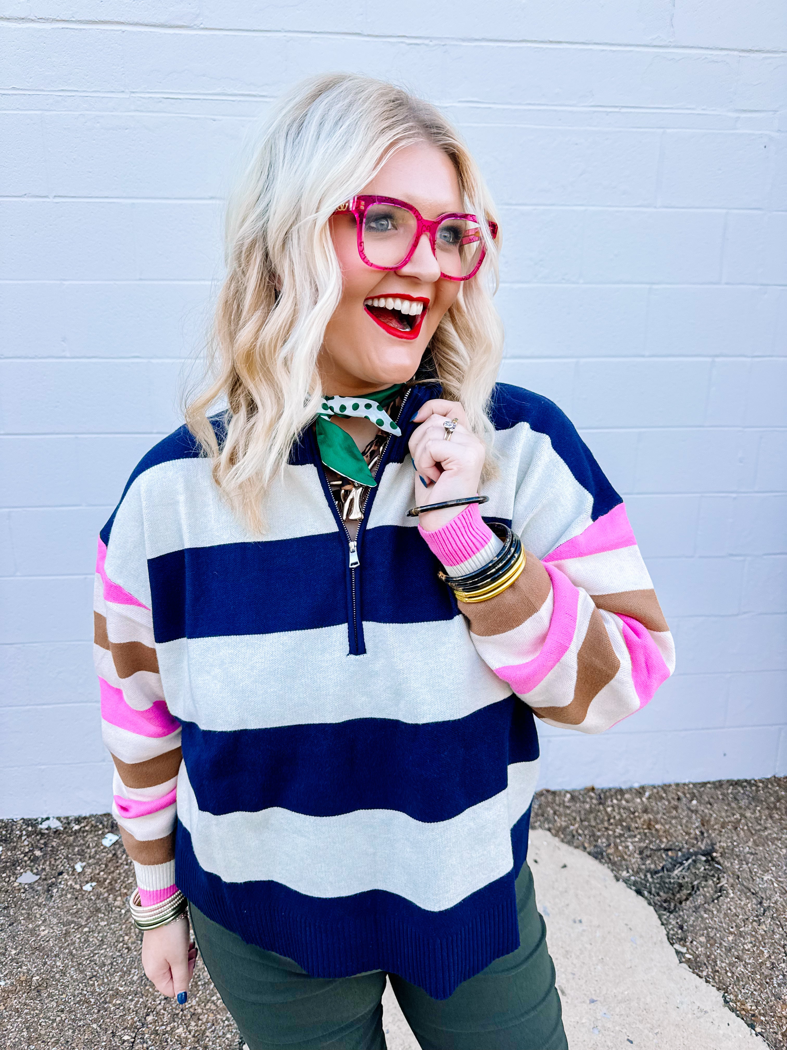 Elevate your casual wardrobe with this expert-crafted striped drop shoulder half-zip sweater, featuring a refined color palette of oatmeal, pink, and navy. Designed for comfort and style, the relaxed drop shoulder cut combines effortlessly with the half-zip neckline for versatile layering. The soft fabric ensures cozy wear, while the balanced stripes add a sophisticated edge. A subtle "sew in love" detail highlights the garment’s quality craftsmanship, making it a standout piece for a polished, yet laid-back look.