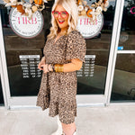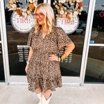 The Sew in Love Leopard Dress features a flattering coffee and brown leopard print highlighted by a V-neck with a secure hook closure. Its smocked waist ensures a comfortable, tailored fit, while a delicate ruffle near the hem adds subtle movement and feminine charm. Designed for style and ease, this dress offers a sophisticated yet effortless look for various occasions.
