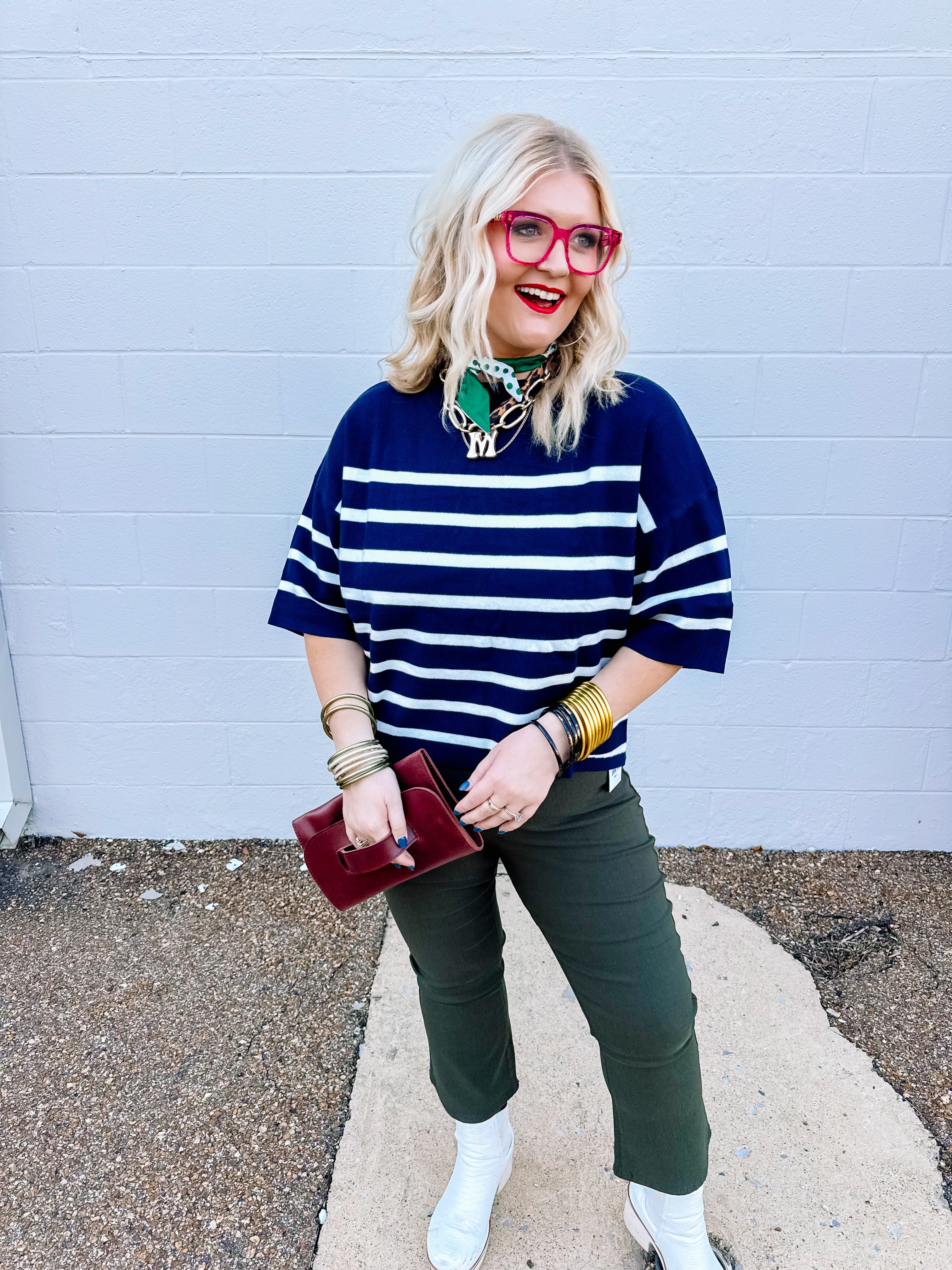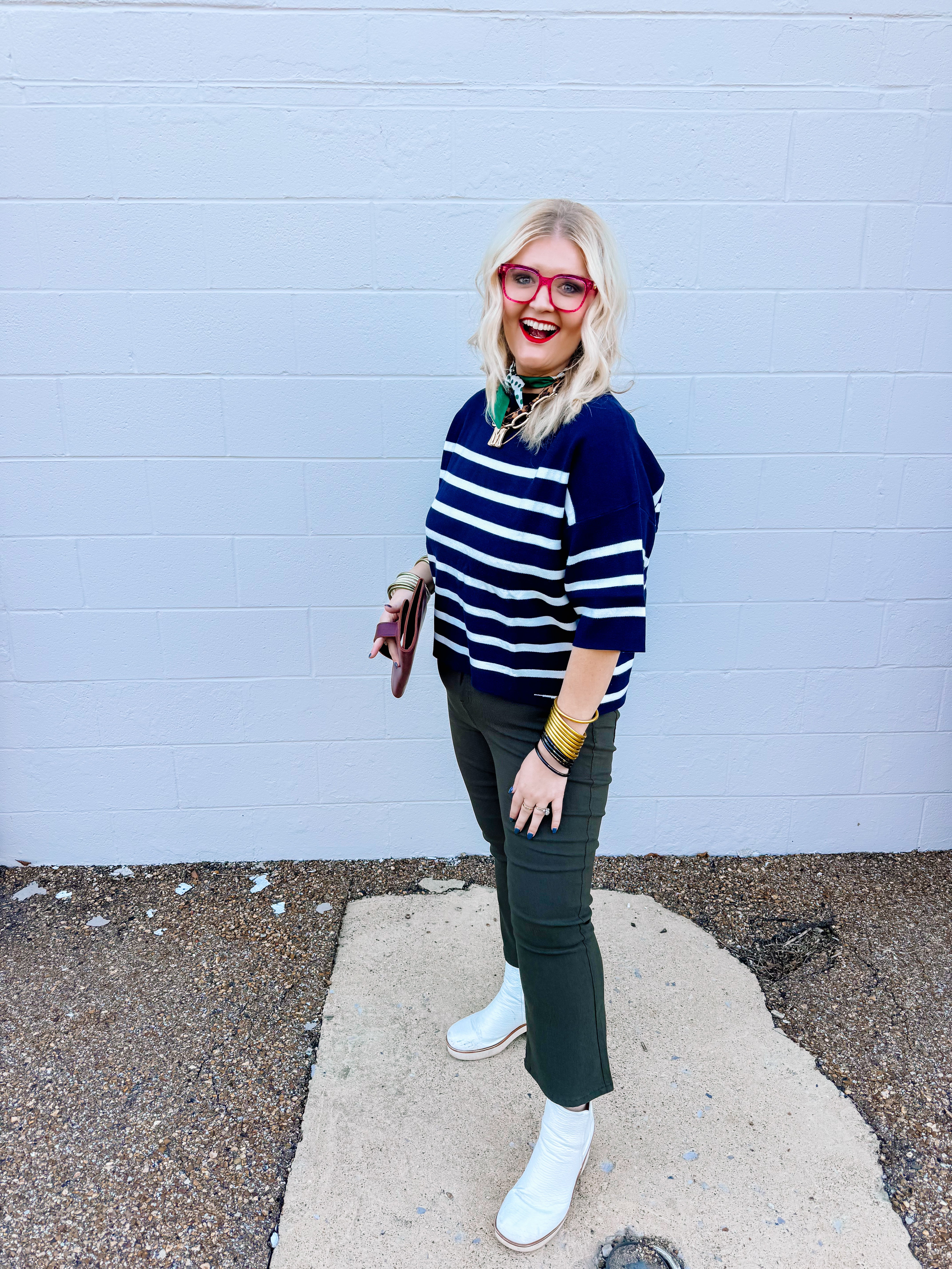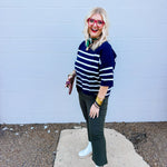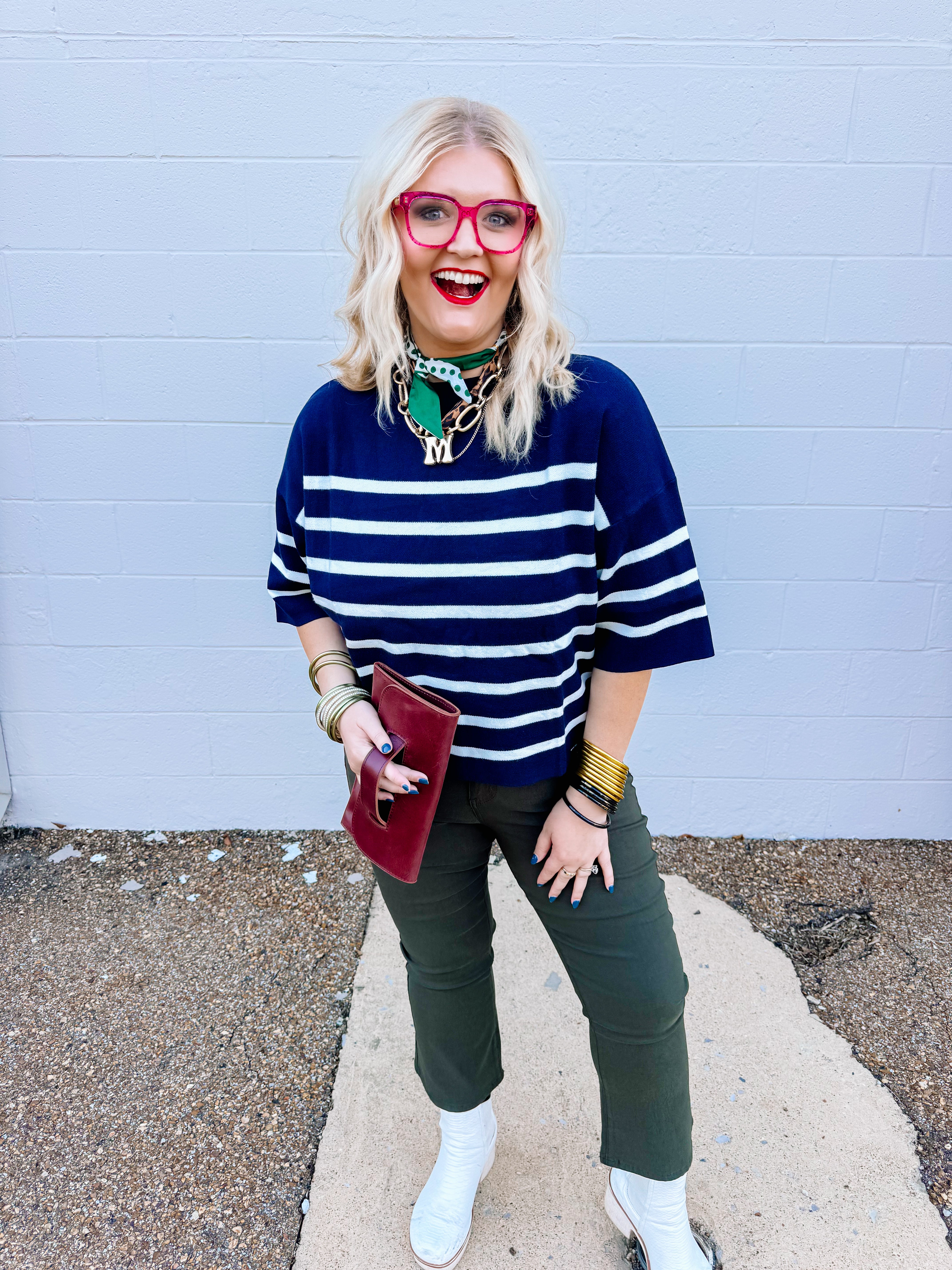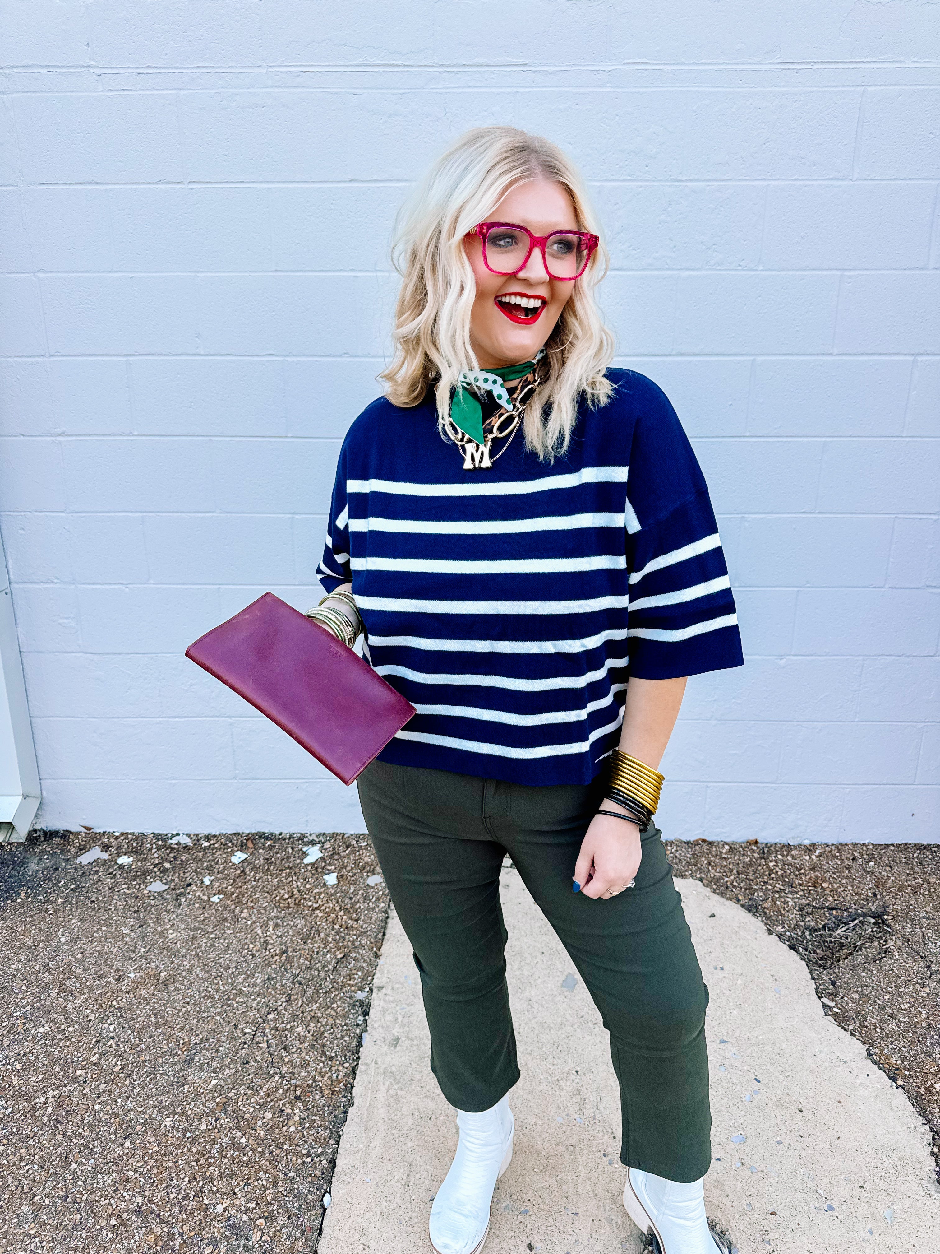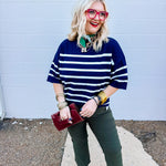 The Sew in Love Navy/White Stripe Top features a classic round collar and short sleeves, offering a timeless silhouette. Its navy and white stripes lend a versatile, nautical-inspired look that pairs effortlessly with various outfits. Crafted for comfort and style, this top is ideal for casual wear or layering, making it a reliable addition to your wardrobe.
