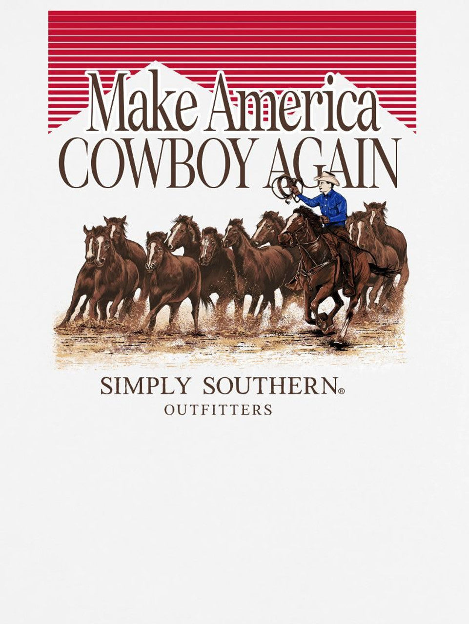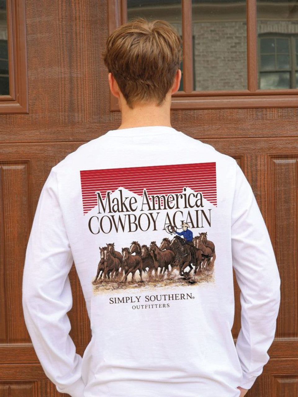 White long sleeve shirt with the phrase 'Make America Cowboy Again' and a cowboy rounding up horses. Simply Southern logo below. Similar design on left chest. 100% cotton. Unisex sizing.