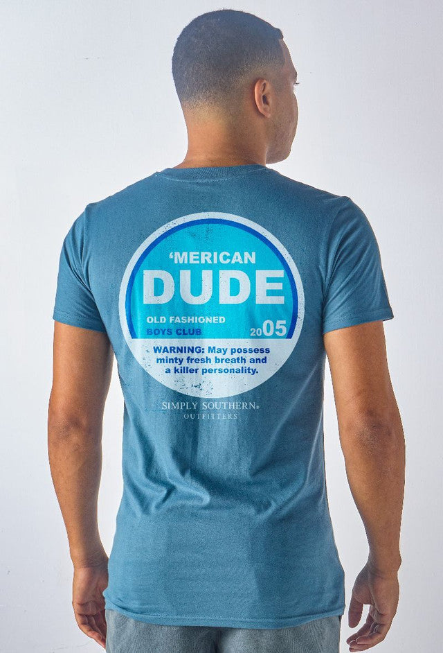 Comet blue short sleeve shirt with the phrases 'Merican dude', 'Old fashioned boys club', and 'Warning: May possess minty fresh breath and a killer personality'. Simply Southern logo below and on left chest. 100% cotton. Unisex sizing.