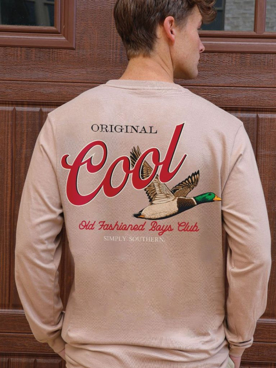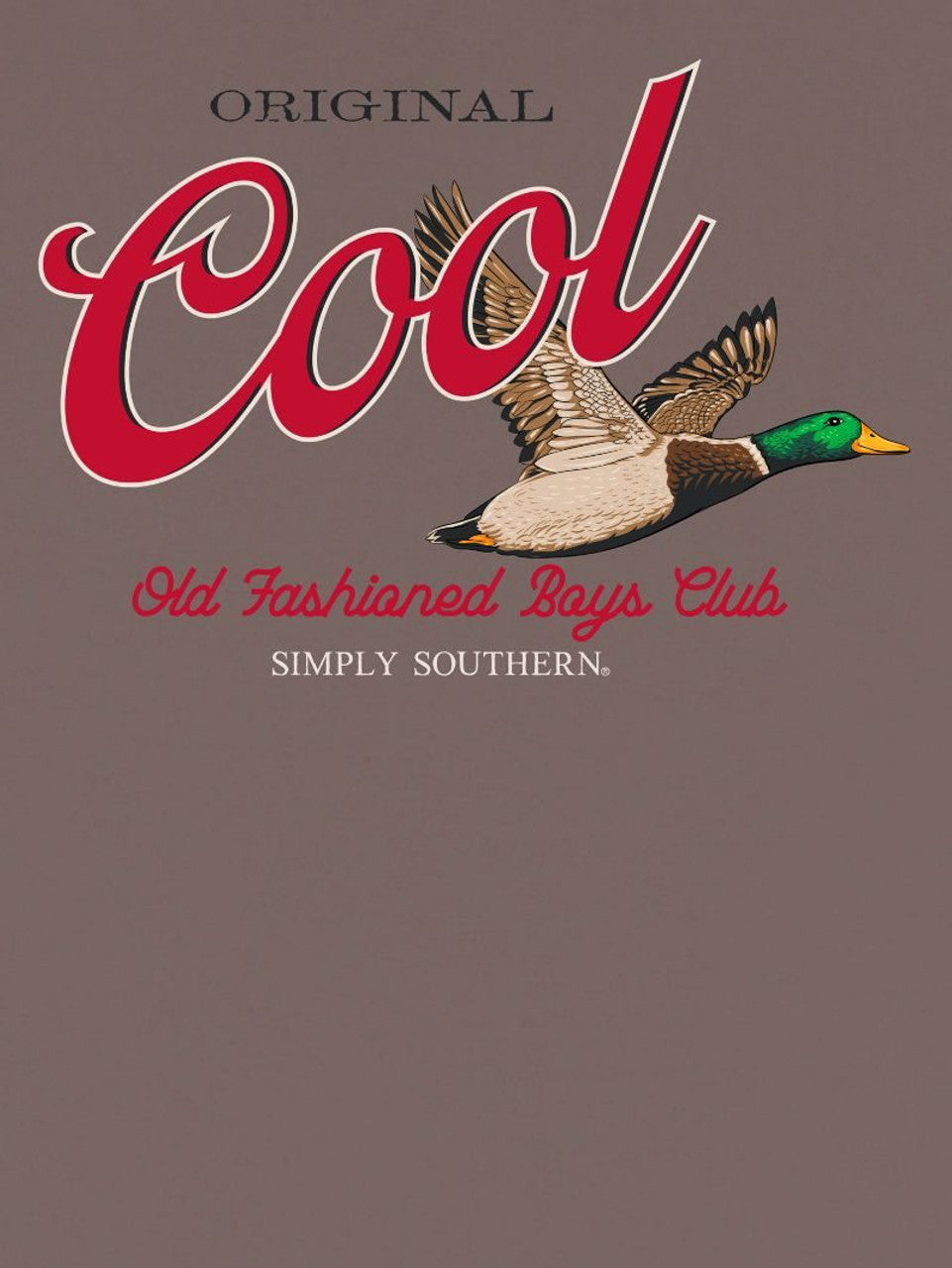 Mocha long sleeve shirt with the phrases 'Original Cool' and 'Old Fashioned Boys Club' and a duck flying. Simply Southern logo below and on left chest. 100% cotton. Unisex sizing.