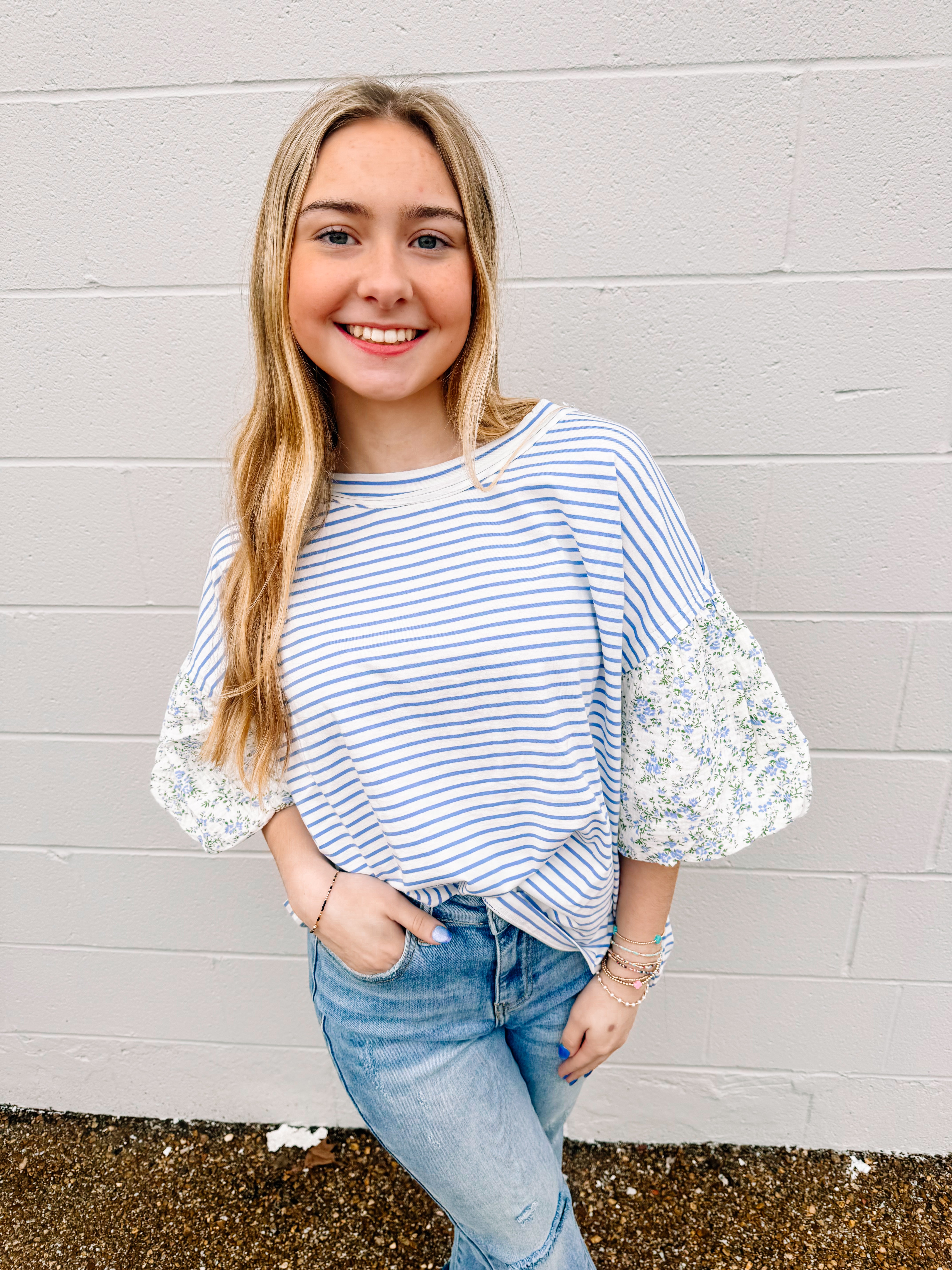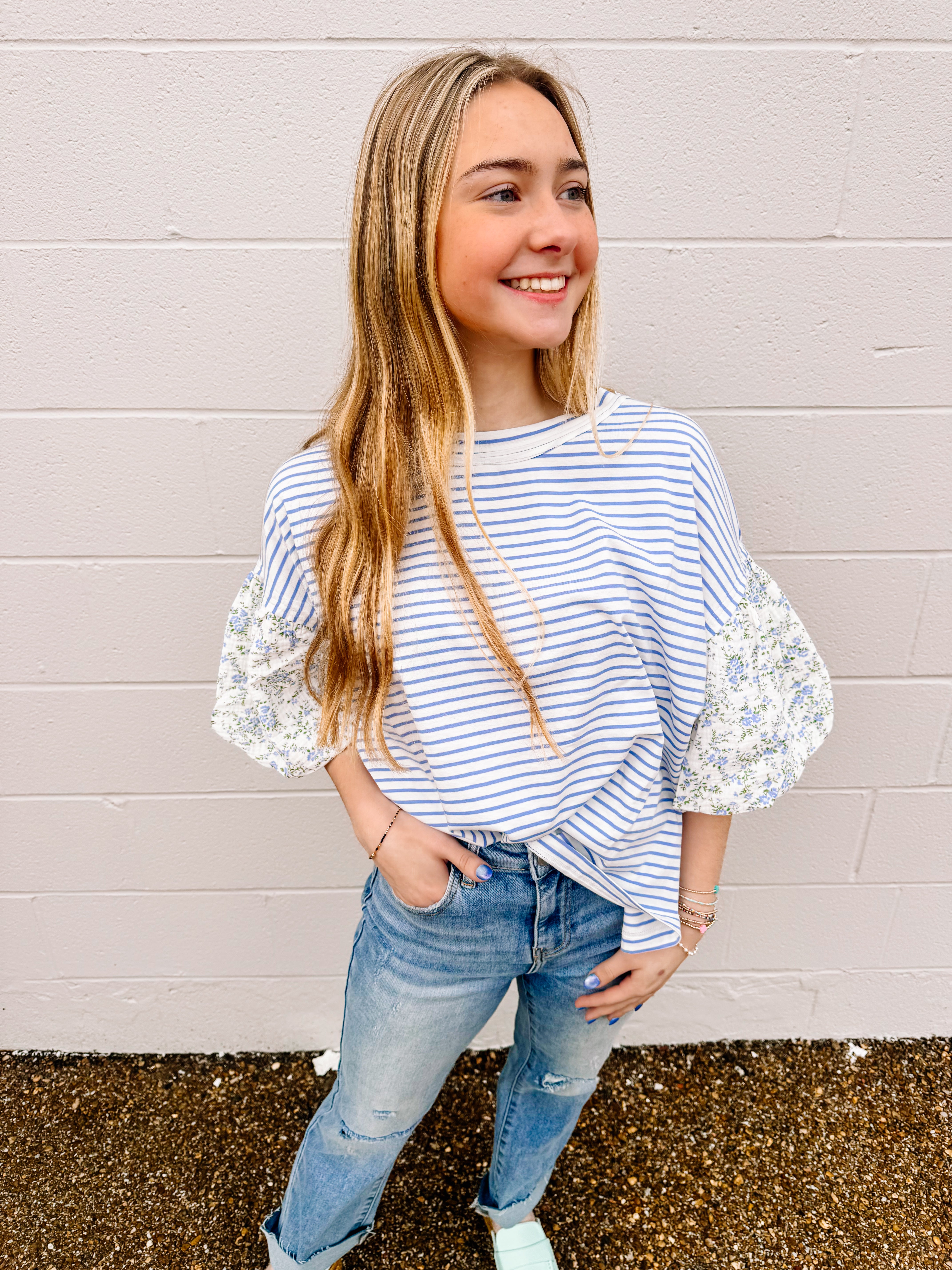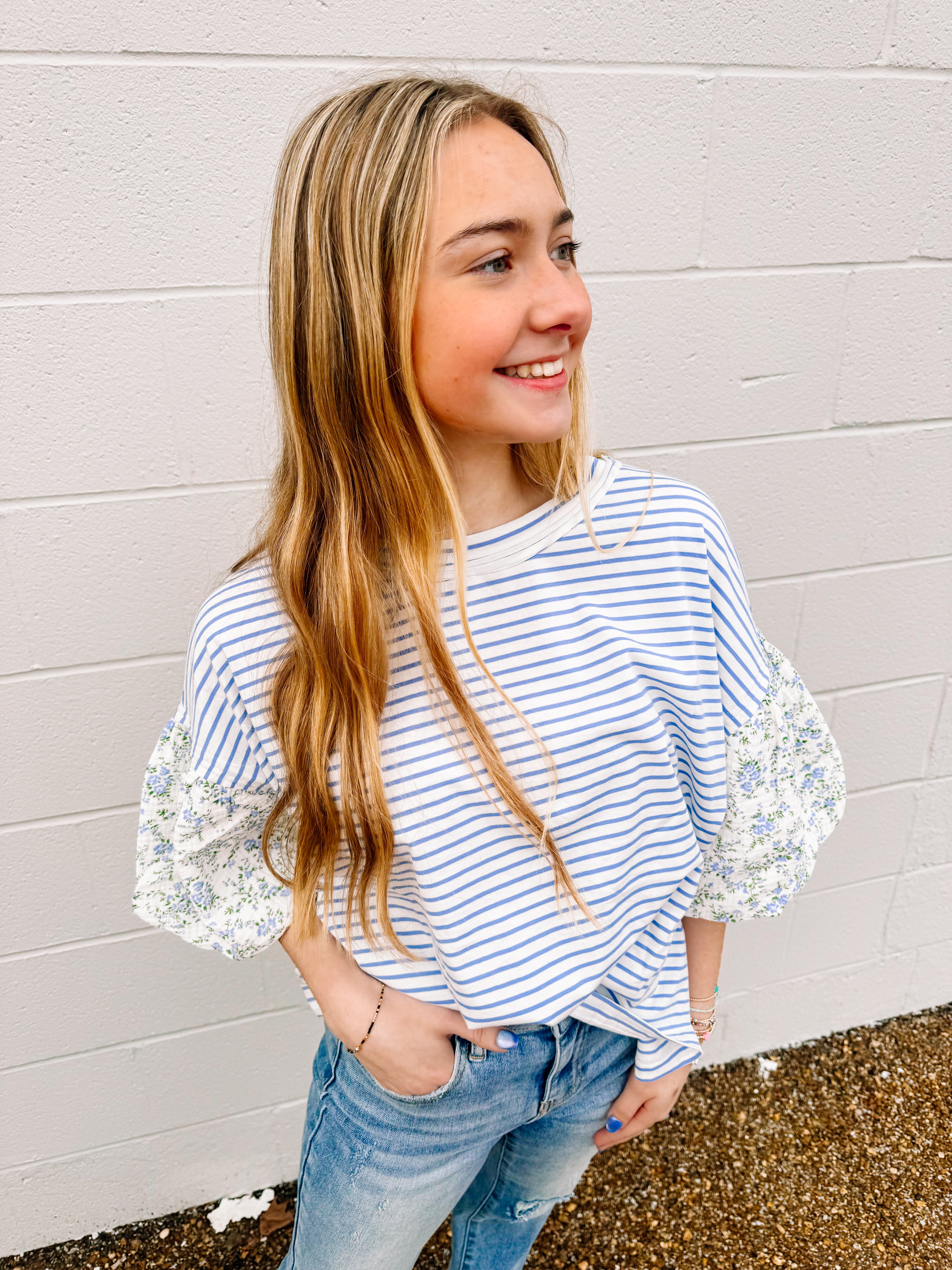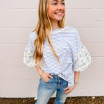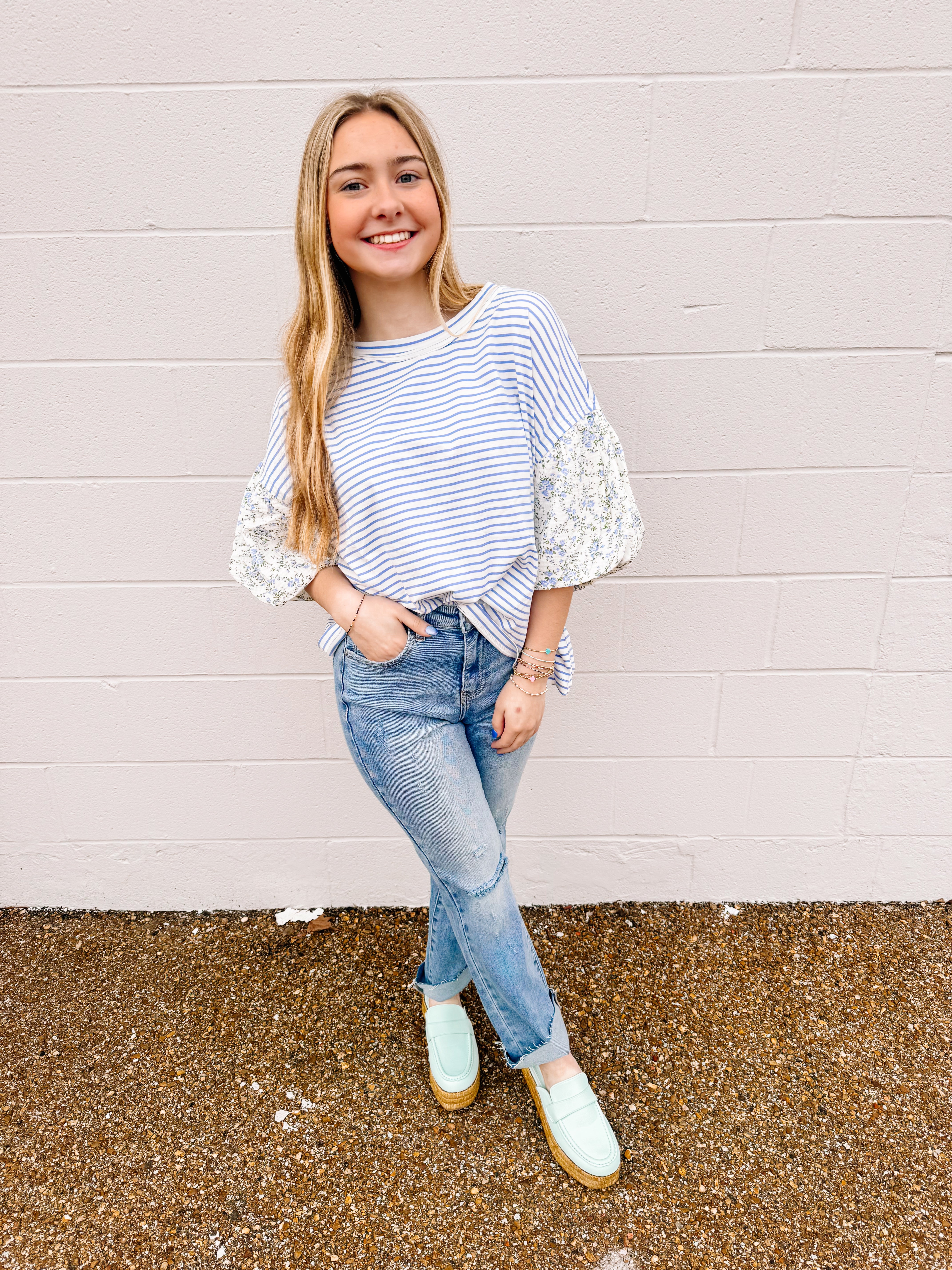 Introducing the Stepping Into Spring Top in Periwinkle. This gorgeous striped knit pullover has floral printed bubble sleeves is great for the Spring and Summer season. It is a must have for all wardrobes.