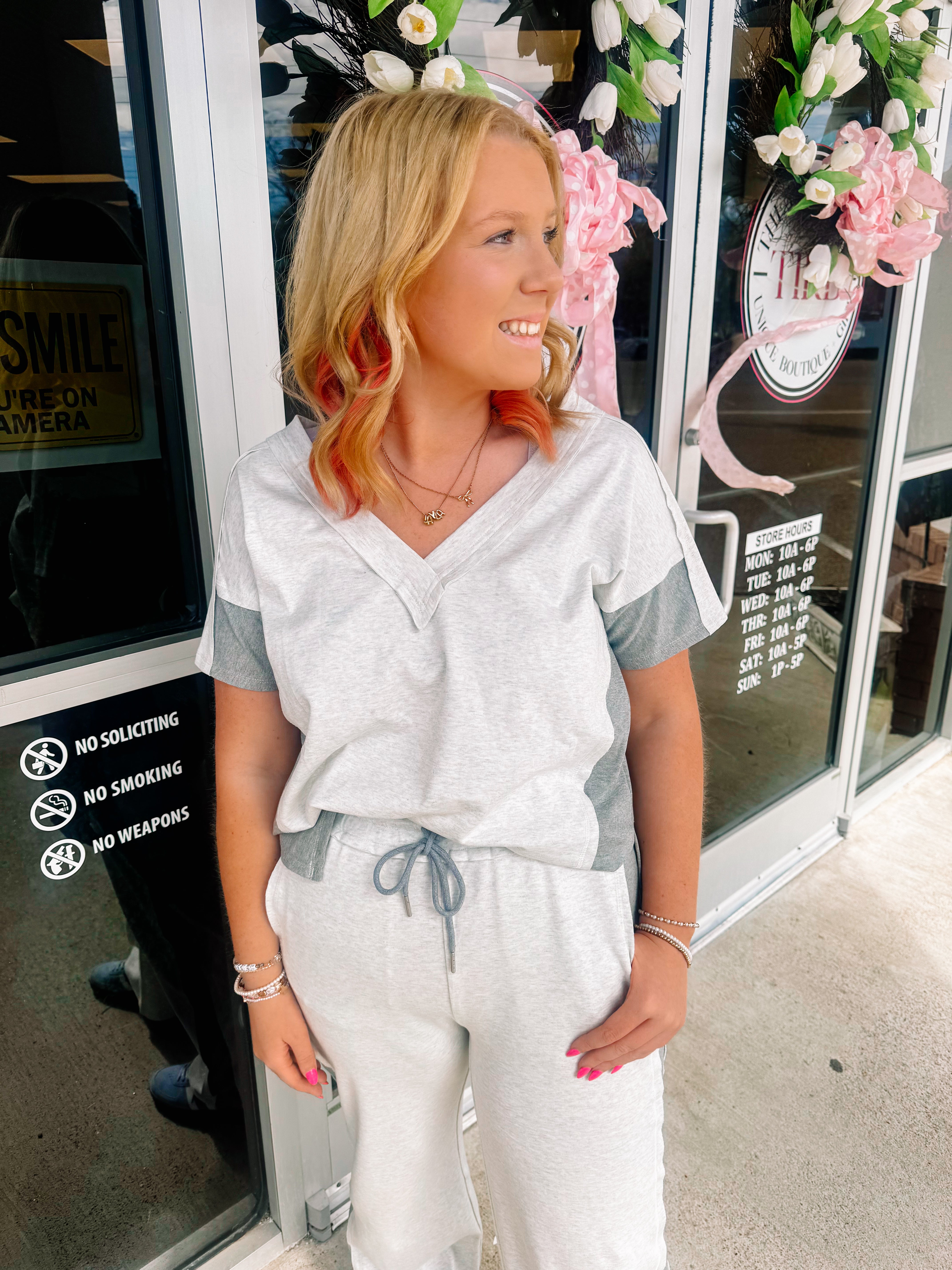 Welcome to The Sunday Afternoon Top! This cute and comfortable v-neck top features a two-tone grey short sleeve that will flatter every body type. This top is great for a day of shopping or a fun girls day out or a day at home. This top pairs well with The Sunday Afternoon Pant and is a must for every closet.