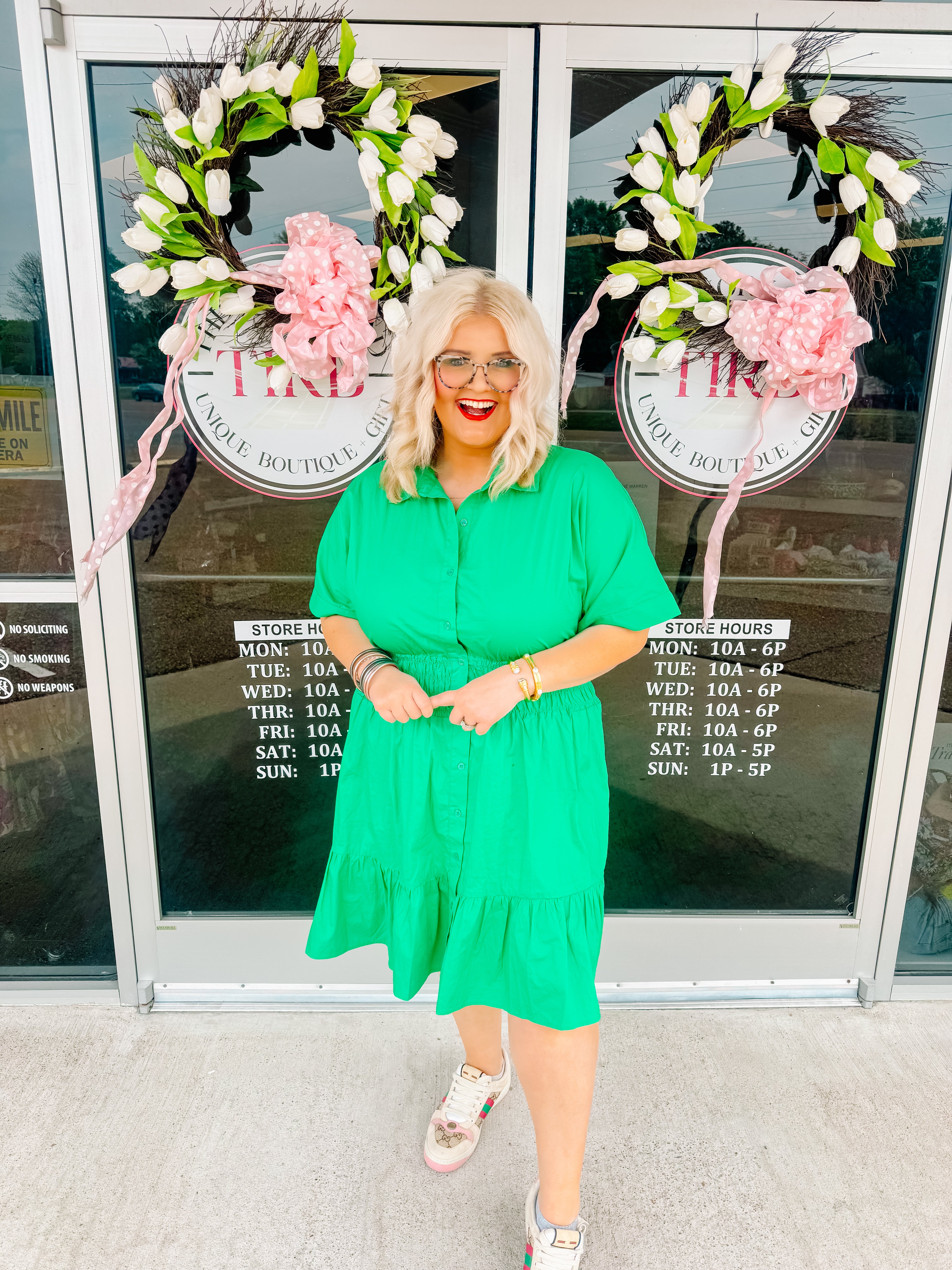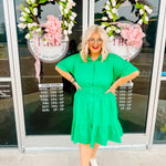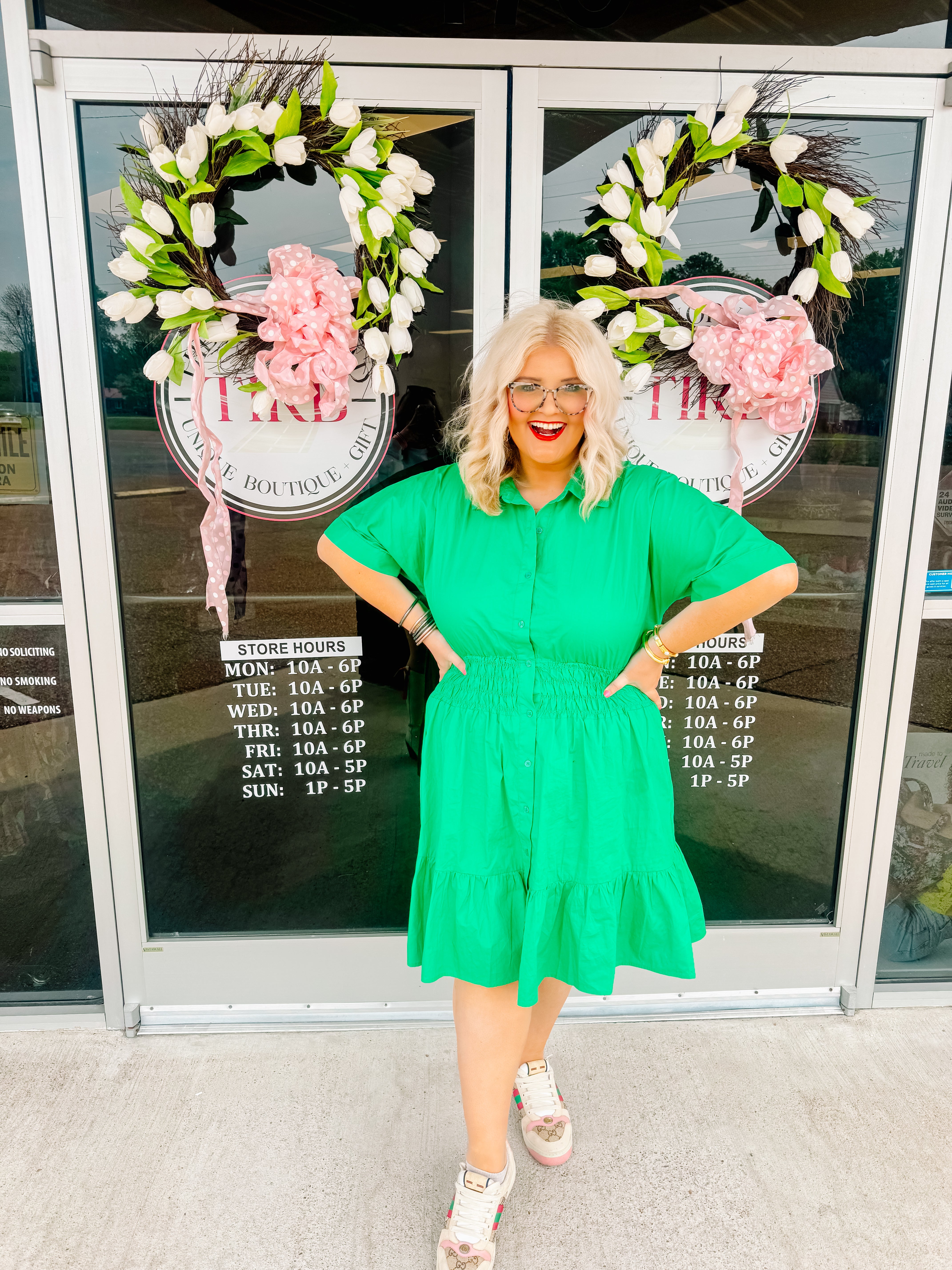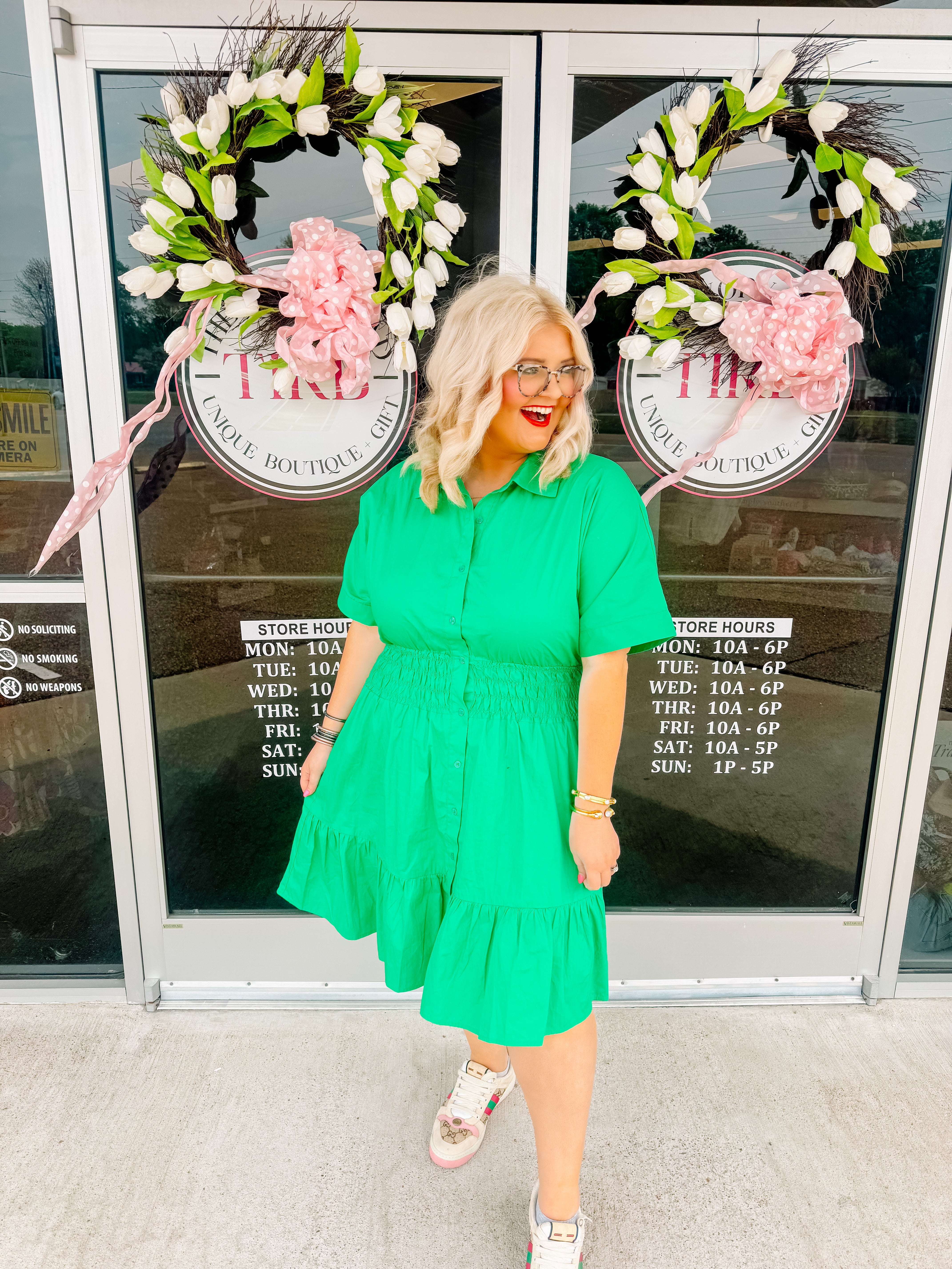 One of our most popular fits! This dress comes in Kelly Green and Lavender! Our Sweet Caroline Dress is a Solid poplin mini shirt dress with smocked waistline.