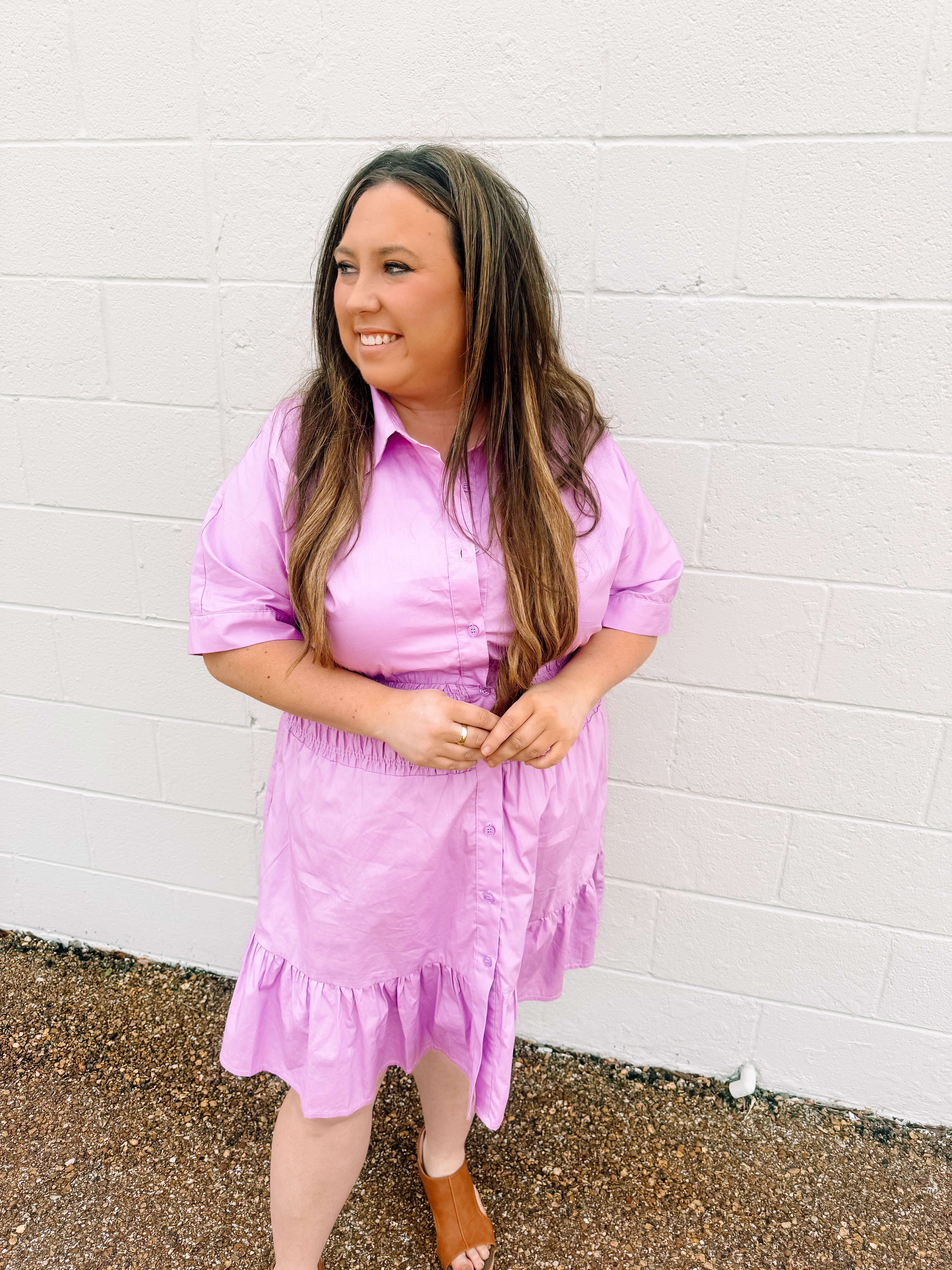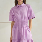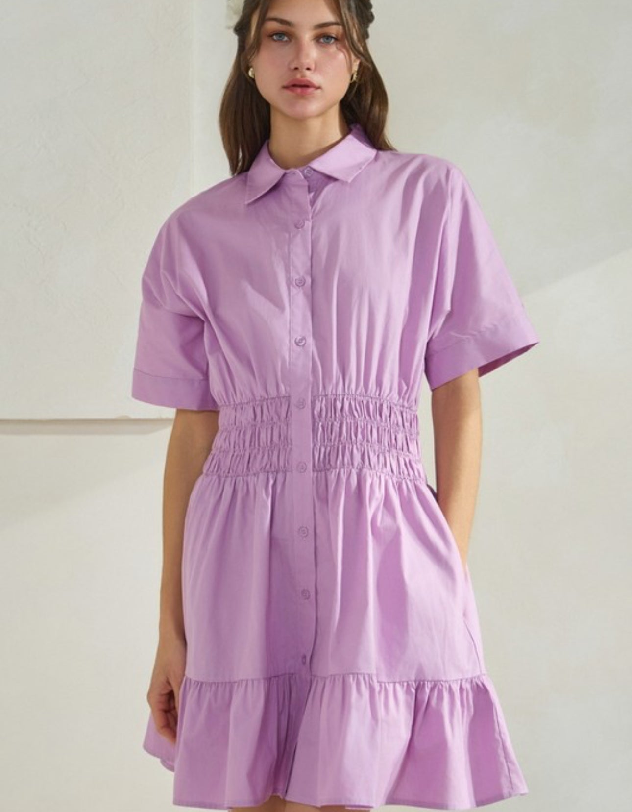 One of our most popular fits! This dress comes in Kelly Green and Lavender! Our Sweet Caroline Dress is a Solid poplin mini shirt dress with smocked waistline.