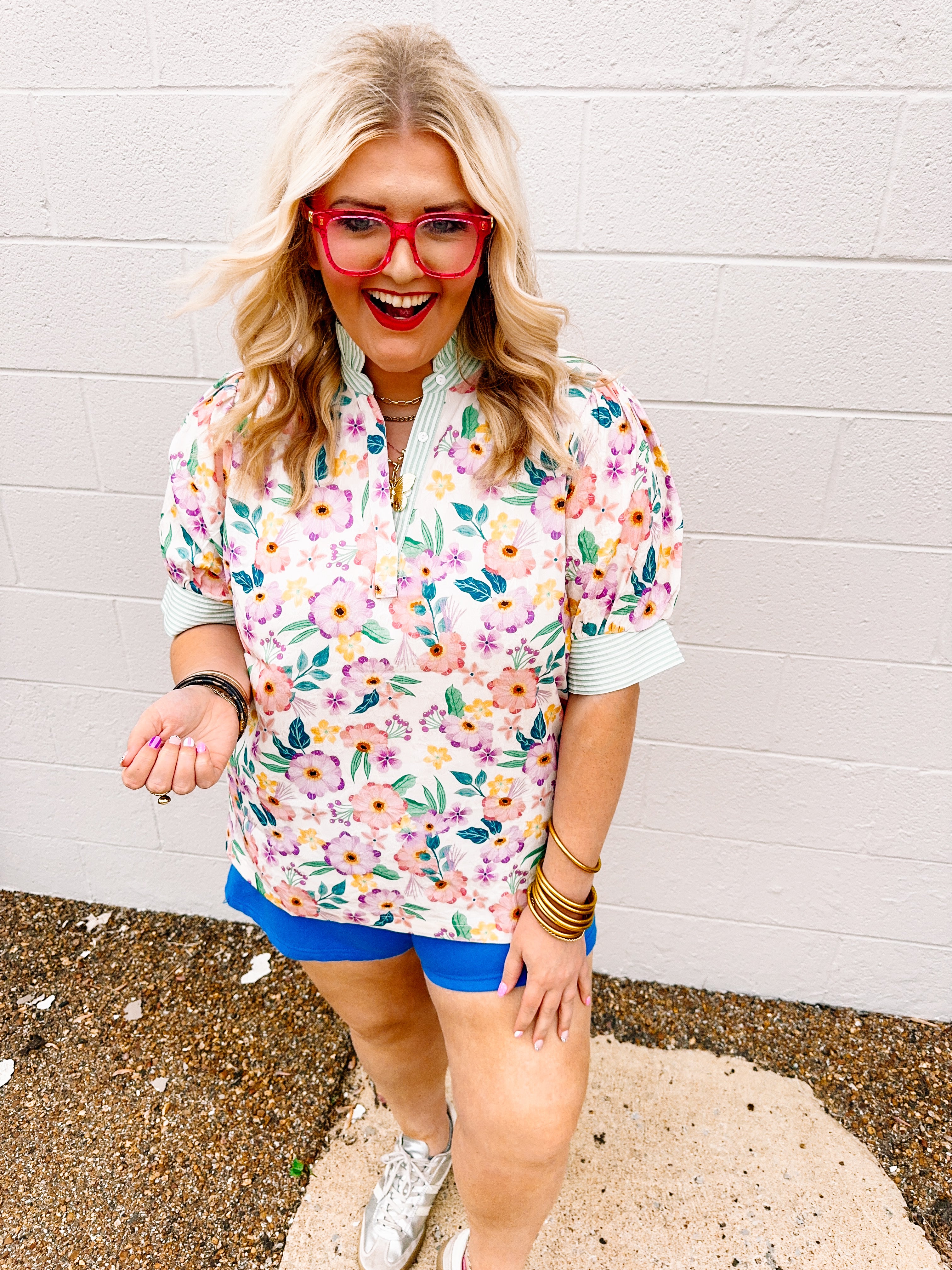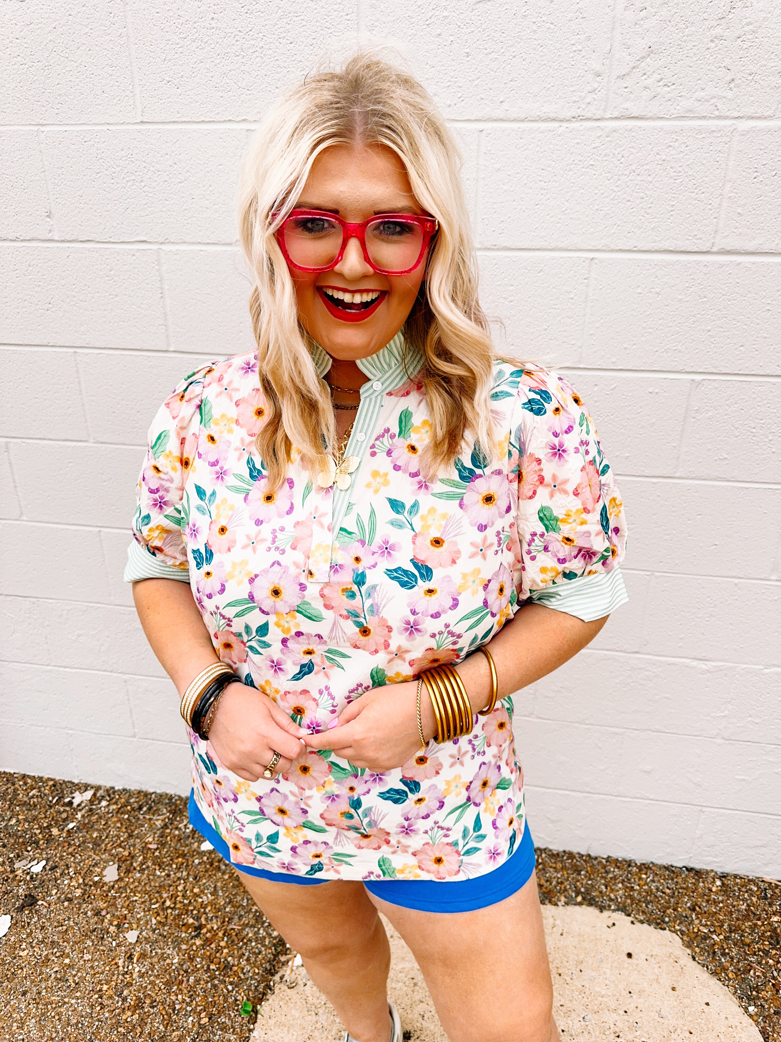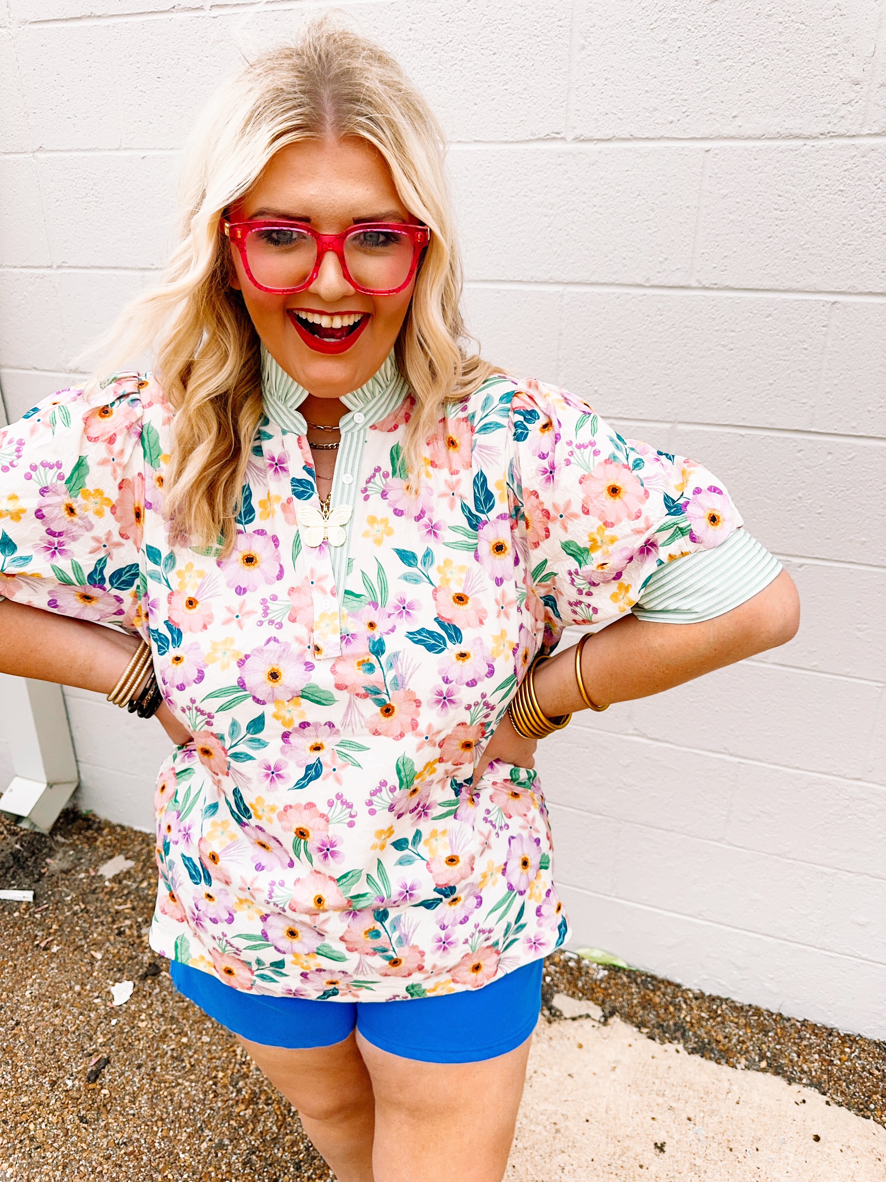 Charming floral striped top featuring vibrant green stripes paired with green and purple floral accents. The ruffled neckline adds feminine detail, while the V-neck button front offers easy styling versatility. Striped sleeves complete the playful design. Available in sizes S–2X for a comfortable, flattering fit.
