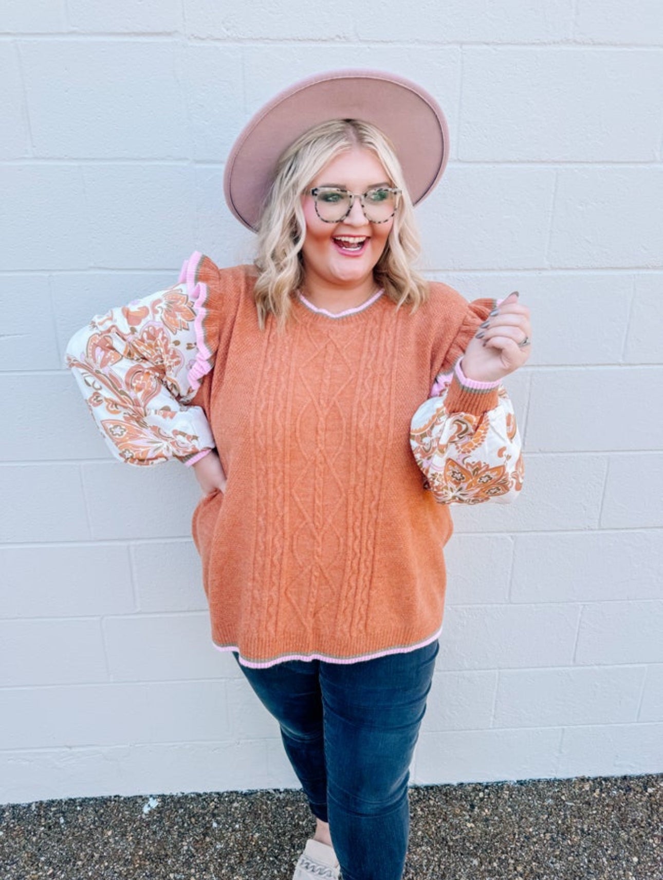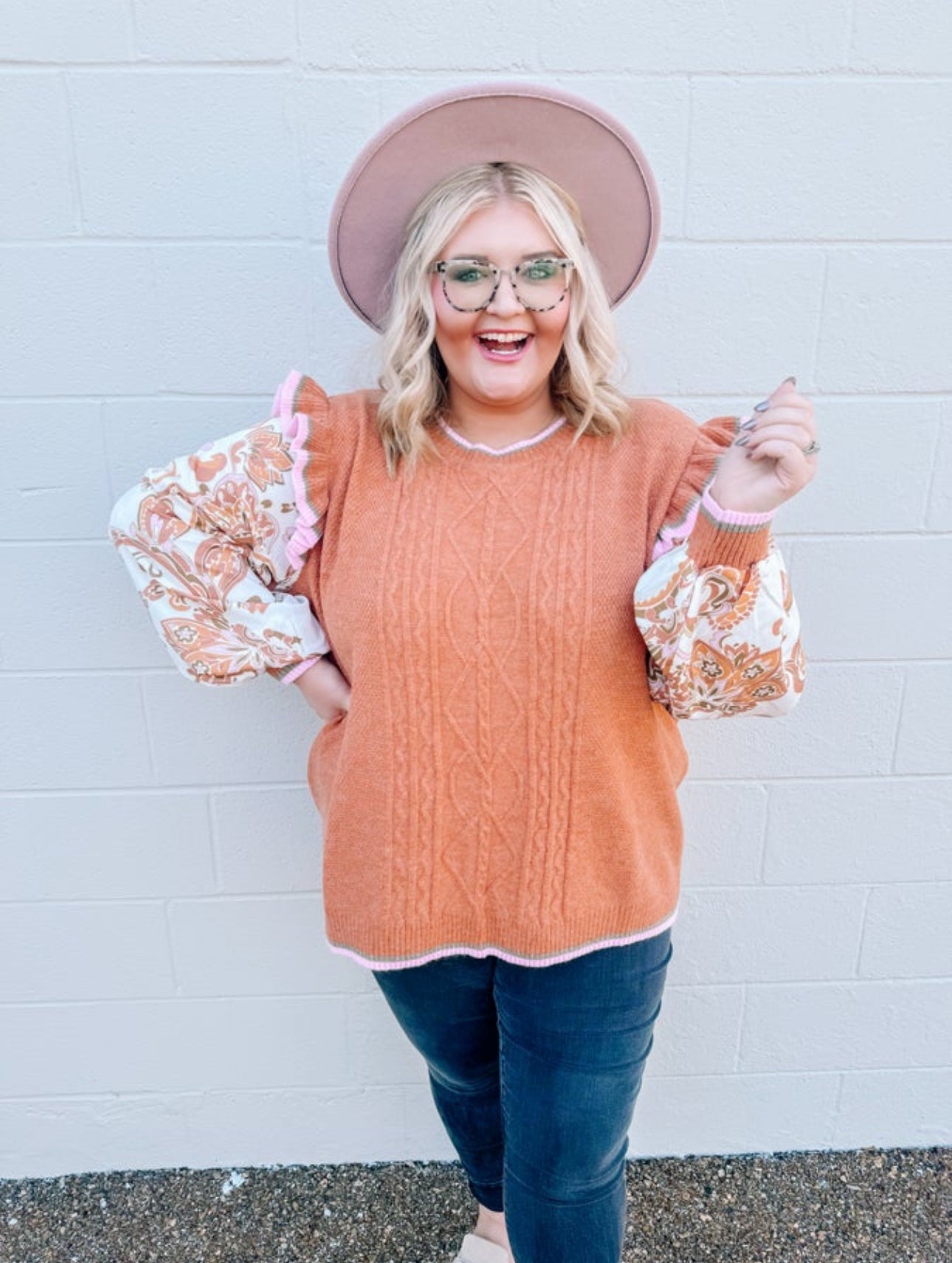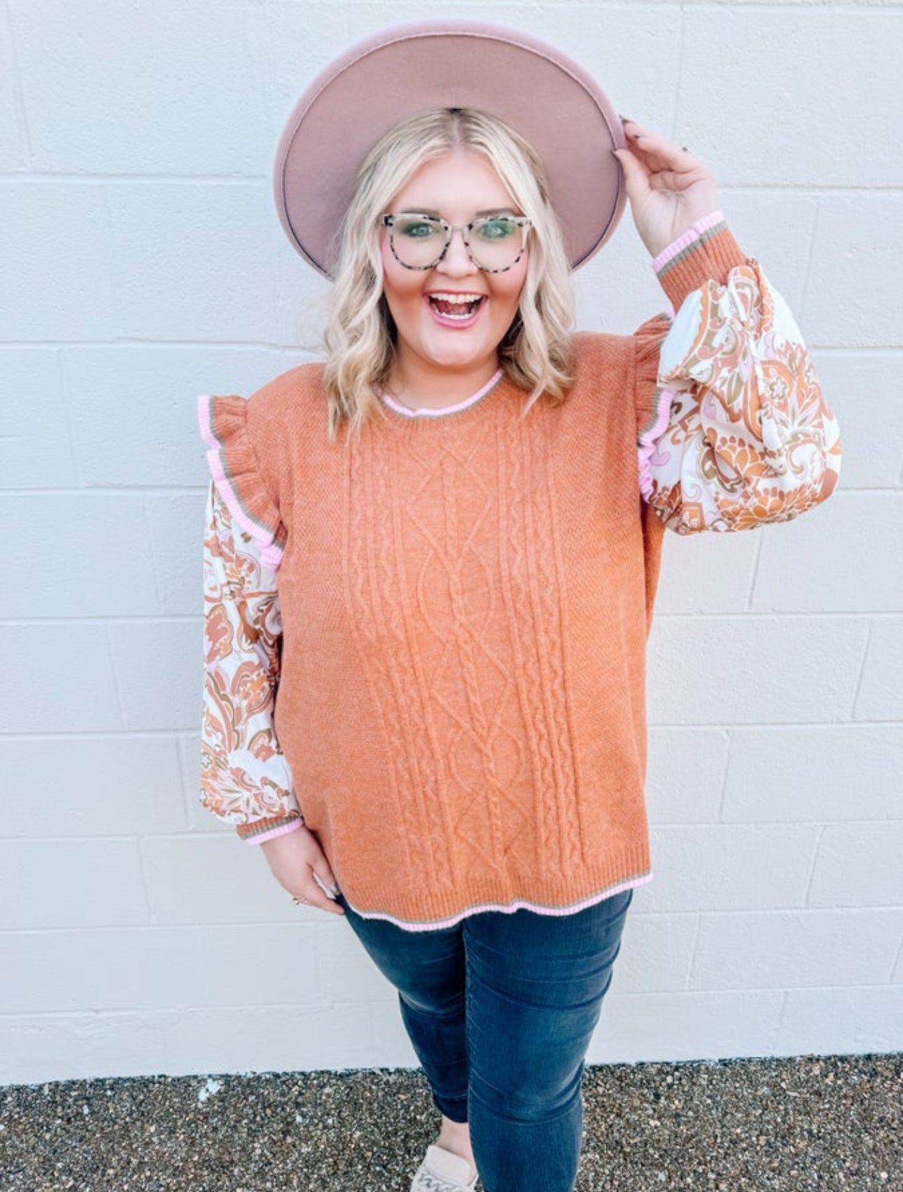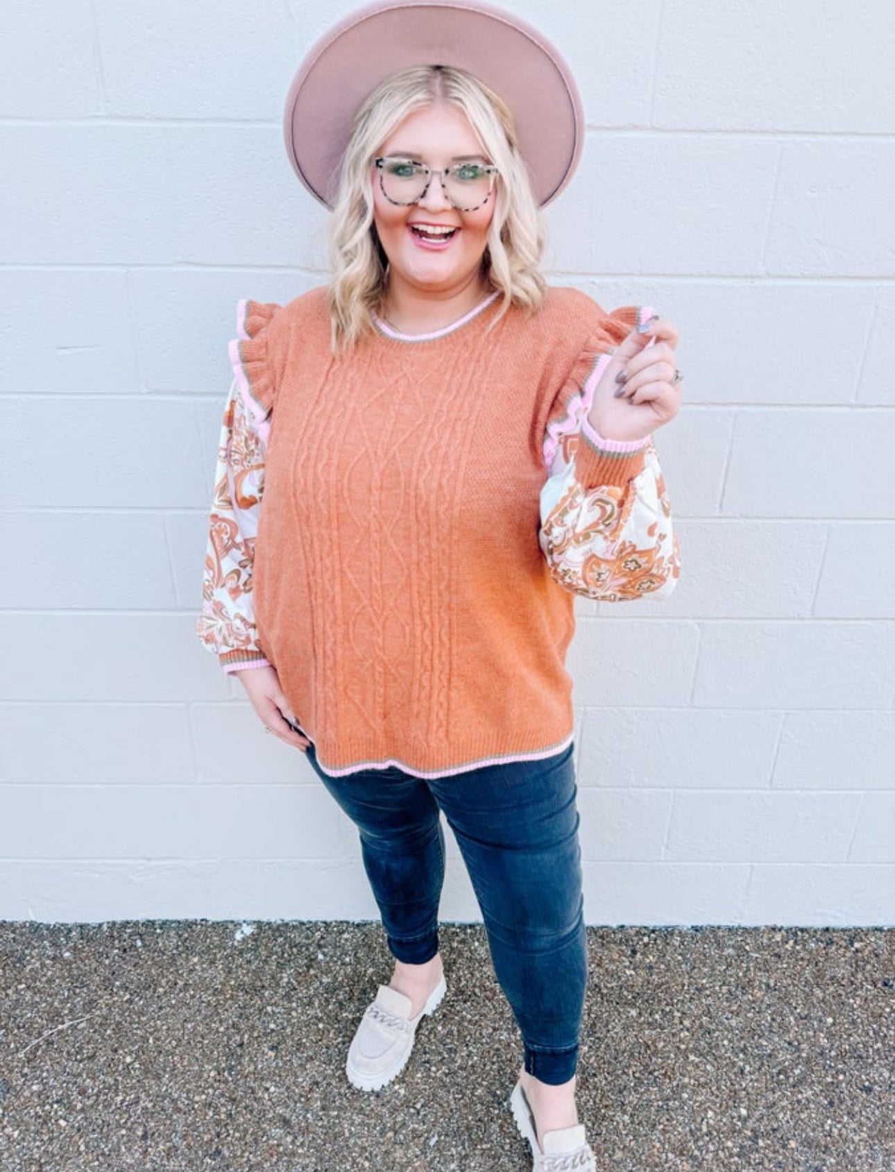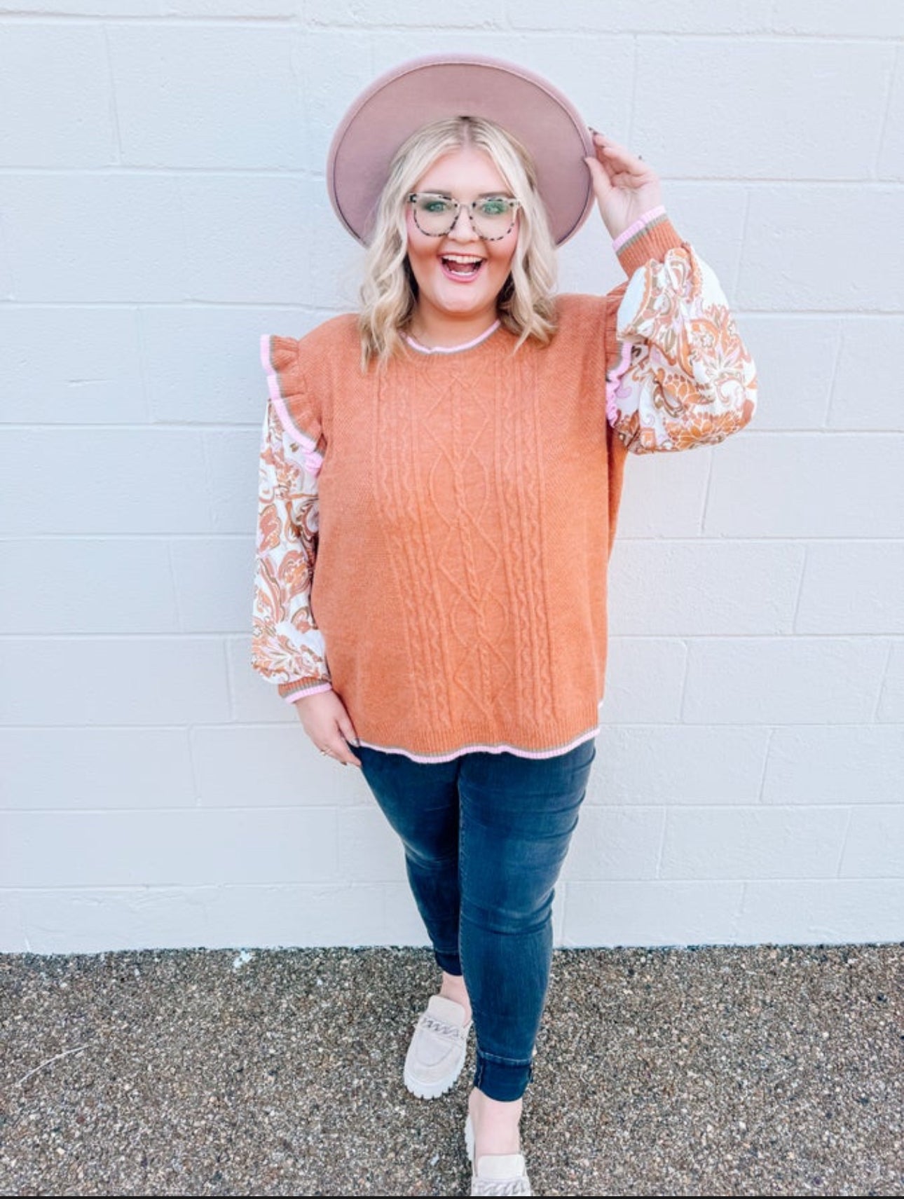 The perfect top to wear for Thanksgiving is this one! Curvy girls this is everything you need. The fit is perfect and roomy. Madison styled with black pants and mules to complete her fall look.