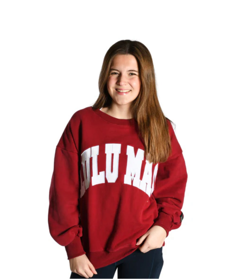 The LULU MAC Crimson Red Crew sweatshirt features an oversized design with a stretchy band, ensuring both comfort and ease of movement. Crafted with high-quality materials, it showcases white appliqué lettering that enhances visual appeal while maintaining durability. Ideal for casual wear, this sweatshirt combines style with functional design.