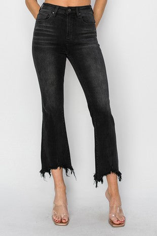 Every girl needs a pair of black denim in their life. Our Willow jean is a plus size high rise crop flare with a frayed hem.