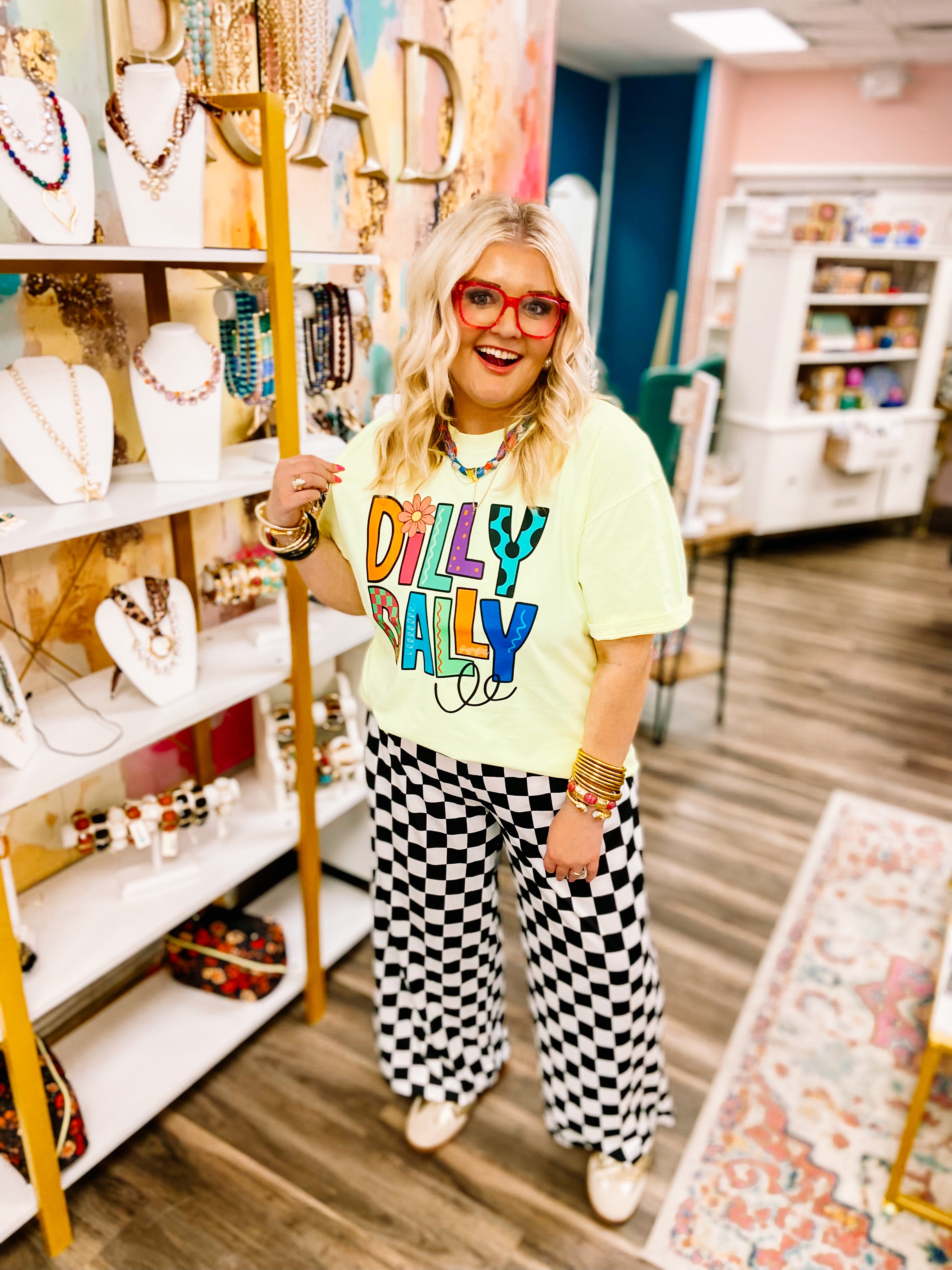The Dilly Dally Tee combines laid-back style with playful artistry. Crafted from premium Comfort Colors fabric, this yellow short-sleeve tee delivers the softness and durability you expect from quality basics. The standout feature is its vibrant front design—the words "DILLY DALLY" rendered in bold, multicolored lettering accented with whimsical flowers and organic squiggles. Perfect for casual wear, this tee works as a versatile wardrobe staple that expresses personality without compromising on comfort. The relaxed fit and breathable material make it ideal for everyday styling.